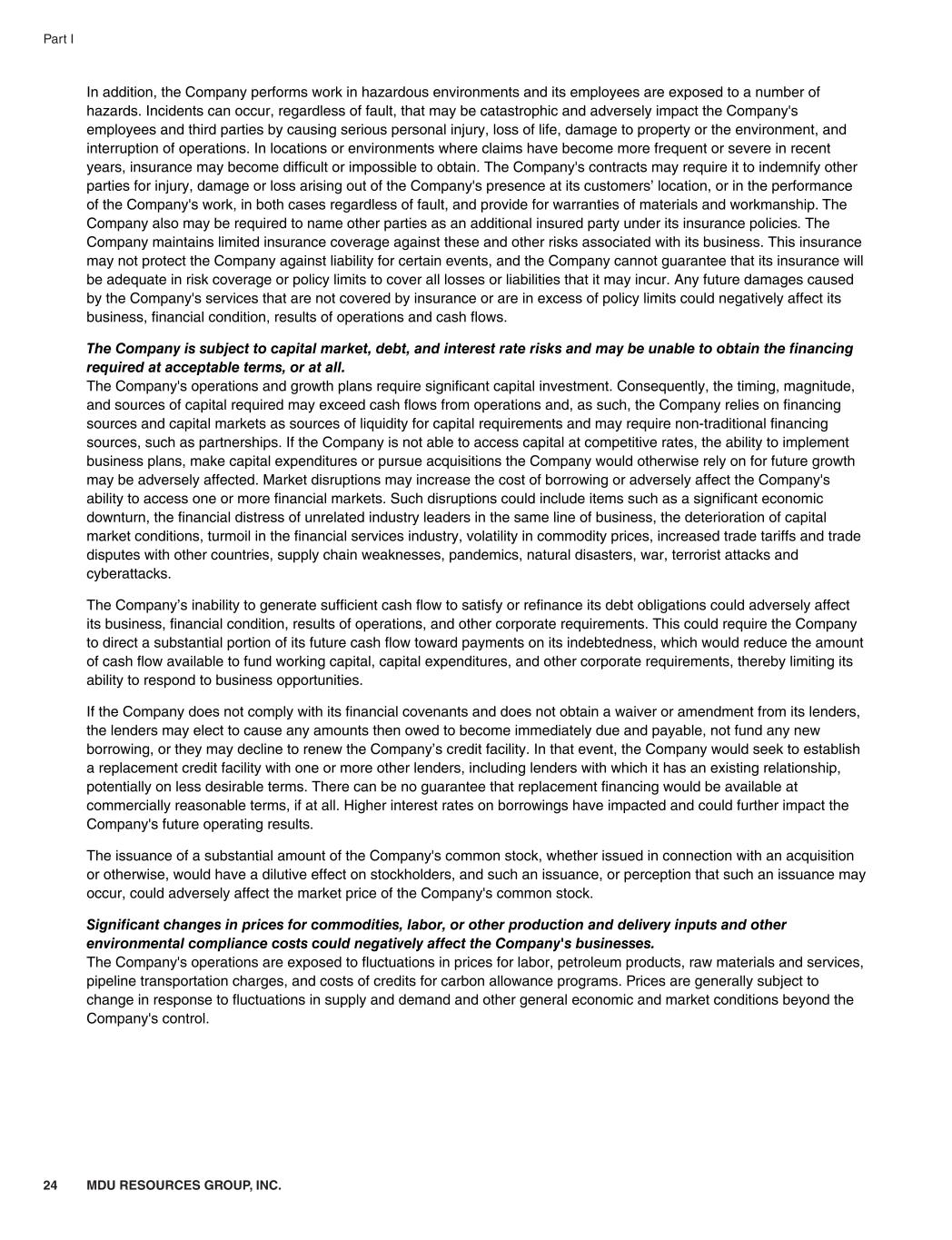 MDU RESOURCES GROUP, INC. Part I 24 In addition, the Company performs work in hazardous environments and its employees are exposed to a number of hazards. Incidents can occur, regardless of fault, that may be catastrophic and adversely impact the Company's employees and third parties by causing serious personal injury, loss of life, damage to property or the environment, and interruption of operations. In locations or environments where claims have become more frequent or severe in recent years, insurance may become difficult or impossible to obtain. The Company's contracts may require it to indemnify other parties for injury, damage or loss arising out of the Company's presence at its customers’ location, or in the performance of the Company's work, in both cases regardless of fault, and provide for warranties of materials and workmanship. The Company also may be required to name other parties as an additional insured party under its insurance policies. The Company maintains limited insurance coverage against these and other risks associated with its business. This insurance may not protect the Company against liability for certain events, and the Company cannot guarantee that its insurance will be adequate in risk coverage or policy limits to cover all losses or liabilities that it may incur. Any future damages caused by the Company's services that are not covered by insurance or are in excess of policy limits could negatively affect its business, financial condition, results of operations and cash flows. The Company is subject to capital market, debt, and interest rate risks and may be unable to obtain the financing required at acceptable terms, or at all. The Company's operations and growth plans require significant capital investment. Consequently, the timing, magnitude, and sources of capital required may exceed cash flows from operations and, as such, the Company relies on financing sources and capital markets as sources of liquidity for capital requirements and may require non-traditional financing sources, such as partnerships. If the Company is not able to access capital at competitive rates, the ability to implement business plans, make capital expenditures or pursue acquisitions the Company would otherwise rely on for future growth may be adversely affected. Market disruptions may increase the cost of borrowing or adversely affect the Company's ability to access one or more financial markets. Such disruptions could include items such as a significant economic downturn, the financial distress of unrelated industry leaders in the same line of business, the deterioration of capital market conditions, turmoil in the financial services industry, volatility in commodity prices, increased trade tariffs and trade disputes with other countries, supply chain weaknesses, pandemics, natural disasters, war, terrorist attacks and cyberattacks. The Company’s inability to generate sufficient cash flow to satisfy or refinance its debt obligations could adversely affect its business, financial condition, results of operations, and other corporate requirements. This could require the Company to direct a substantial portion of its future cash flow toward payments on its indebtedness, which would reduce the amount of cash flow available to fund working capital, capital expenditures, and other corporate requirements, thereby limiting its ability to respond to business opportunities. If the Company does not comply with its financial covenants and does not obtain a waiver or amendment from its lenders, the lenders may elect to cause any amounts then owed to become immediately due and payable, not fund any new borrowing, or they may decline to renew the Company’s credit facility. In that event, the Company would seek to establish a replacement credit facility with one or more other lenders, including lenders with which it has an existing relationship, potentially on less desirable terms. There can be no guarantee that replacement financing would be available at commercially reasonable terms, if at all. Higher interest rates on borrowings have impacted and could further impact the Company's future operating results. The issuance of a substantial amount of the Company's common stock, whether issued in connection with an acquisition or otherwise, would have a dilutive effect on stockholders, and such an issuance, or perception that such an issuance may occur, could adversely affect the market price of the Company's common stock. Significant changes in prices for commodities, labor, or other production and delivery inputs and other environmental compliance costs could negatively affect the Company's businesses. The Company's operations are exposed to fluctuations in prices for labor, petroleum products, raw materials and services, pipeline transportation charges, and costs of credits for carbon allowance programs. Prices are generally subject to change in response to fluctuations in supply and demand and other general economic and market conditions beyond the Company's control. Index Part I 24 MDU Resources Group, Inc. Form 10-K