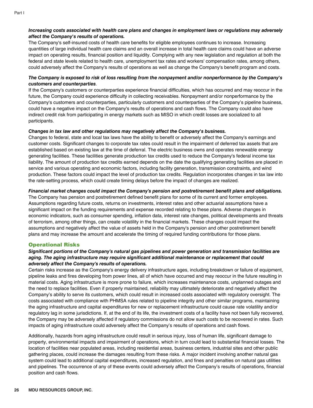 MDU RESOURCES GROUP, INC. Part I 26 Increasing costs associated with health care plans and changes in employment laws or regulations may adversely affect the Company's results of operations. The Company's self-insured costs of health care benefits for eligible employees continues to increase. Increasing quantities of large individual health care claims and an overall increase in total health care claims could have an adverse impact on operating results, financial position and liquidity. Complying with any new legislation and regulation at both the federal and state levels related to health care, unemployment tax rates and workers' compensation rates, among others, could adversely affect the Company's results of operations as well as change the Company's benefit program and costs. The Company is exposed to risk of loss resulting from the nonpayment and/or nonperformance by the Company's customers and counterparties. If the Company's customers or counterparties experience financial difficulties, which has occurred and may reoccur in the future, the Company could experience difficulty in collecting receivables. Nonpayment and/or nonperformance by the Company's customers and counterparties, particularly customers and counterparties of the Company’s pipeline business, could have a negative impact on the Company's results of operations and cash flows. The Company could also have indirect credit risk from participating in energy markets such as MISO in which credit losses are socialized to all participants. Changes in tax law and other regulations may negatively affect the Company's business. Changes to federal, state and local tax laws have the ability to benefit or adversely affect the Company's earnings and customer costs. Significant changes to corporate tax rates could result in the impairment of deferred tax assets that are established based on existing law at the time of deferral. The electric business owns and operates renewable energy generating facilities. These facilities generate production tax credits used to reduce the Company's federal income tax liability. The amount of production tax credits earned depends on the date the qualifying generating facilities are placed in service and various operating and economic factors, including facility generation, transmission constraints, and wind production. These factors could impact the level of production tax credits. Regulation incorporates changes in tax law into the rate-setting process, which could create timing delays before the impact of changes are realized. Financial market changes could impact the Company’s pension and postretirement benefit plans and obligations. The Company has pension and postretirement defined benefit plans for some of its current and former employees. Assumptions regarding future costs, returns on investments, interest rates and other actuarial assumptions have a significant impact on the funding requirements and expense recorded relating to these plans. Adverse changes in economic indicators, such as consumer spending, inflation data, interest rate changes, political developments and threats of terrorism, among other things, can create volatility in the financial markets. These changes could impact the assumptions and negatively affect the value of assets held in the Company's pension and other postretirement benefit plans and may increase the amount and accelerate the timing of required funding contributions for those plans. Operational Risks Significant portions of the Company’s natural gas pipelines and power generation and transmission facilities are aging. The aging infrastructure may require significant additional maintenance or replacement that could adversely affect the Company’s results of operations. Certain risks increase as the Company's energy delivery infrastructure ages, including breakdown or failure of equipment, pipeline leaks and fires developing from power lines, all of which have occurred and may reoccur in the future resulting in material costs. Aging infrastructure is more prone to failure, which increases maintenance costs, unplanned outages and the need to replace facilities. Even if properly maintained, reliability may ultimately deteriorate and negatively affect the Company’s ability to serve its customers, which could result in increased costs associated with regulatory oversight. The costs associated with compliance with PHMSA rules related to pipeline integrity and other similar programs, maintaining the aging infrastructure and capital expenditures for new or replacement infrastructure could cause rate volatility and/or regulatory lag in some jurisdictions. If, at the end of its life, the investment costs of a facility have not been fully recovered, the Company may be adversely affected if regulatory commissions do not allow such costs to be recovered in rates. Such impacts of aging infrastructure could adversely affect the Company’s results of operations and cash flows. Additionally, hazards from aging infrastructure could result in serious injury, loss of human life, significant damage to property, environmental impacts and impairment of operations, which in turn could lead to substantial financial losses. The location of facilities near populated areas, including residential areas, business centers, industrial sites and other public gathering places, could increase the damages resulting from these risks. A major incident involving another natural gas system could lead to additional capital expenditures, increased regulation, and fines and penalties on natural gas utilities and pipelines. The occurrence of any of these events could adversely affect the Company’s results of operations, financial position and cash flows. Index Part I 26 MDU Resources Group, Inc. Form 10-K
