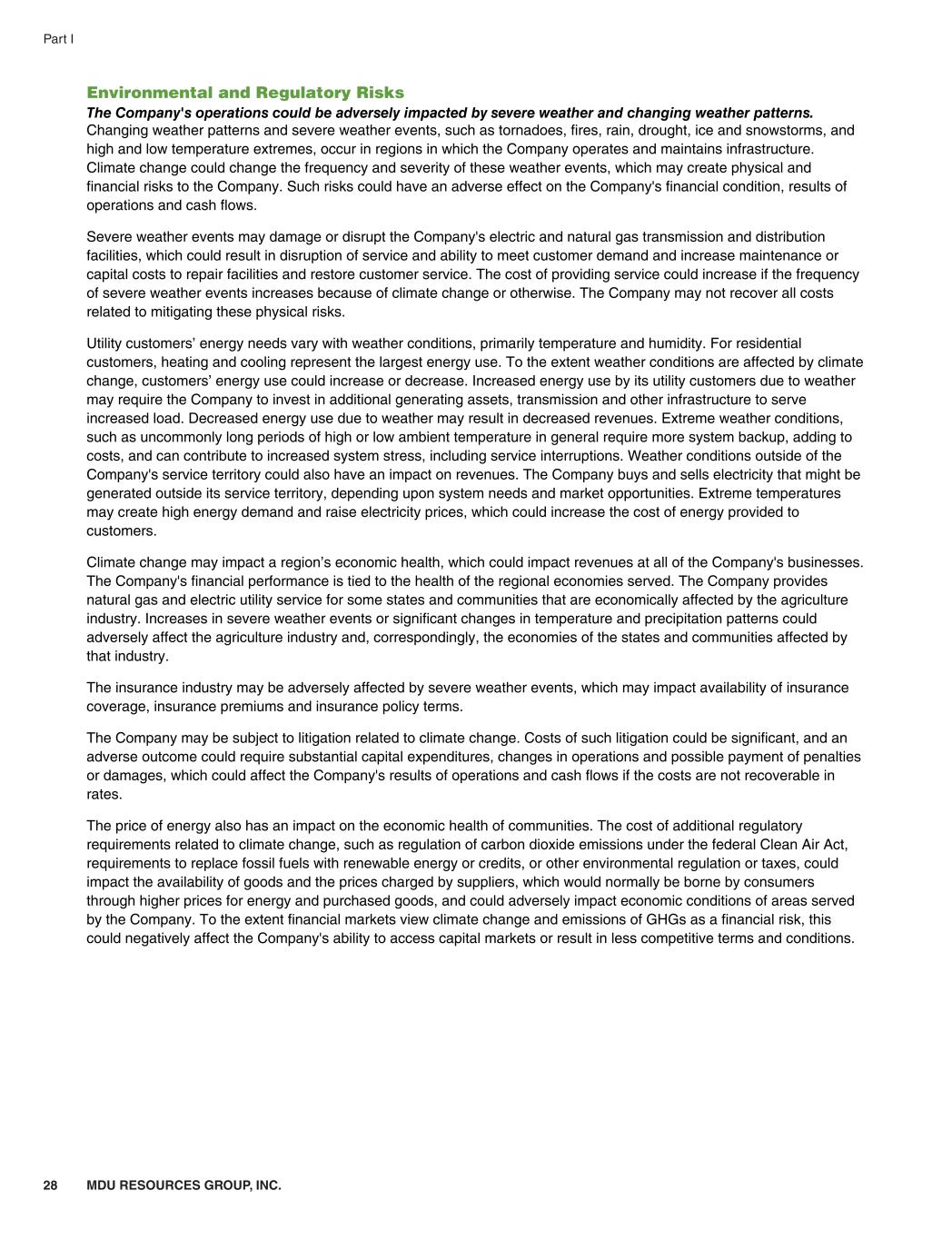 MDU RESOURCES GROUP, INC. Part I 28 Environmental and Regulatory Risks The Company's operations could be adversely impacted by severe weather and changing weather patterns. Changing weather patterns and severe weather events, such as tornadoes, fires, rain, drought, ice and snowstorms, and high and low temperature extremes, occur in regions in which the Company operates and maintains infrastructure. Climate change could change the frequency and severity of these weather events, which may create physical and financial risks to the Company. Such risks could have an adverse effect on the Company's financial condition, results of operations and cash flows. Severe weather events may damage or disrupt the Company's electric and natural gas transmission and distribution facilities, which could result in disruption of service and ability to meet customer demand and increase maintenance or capital costs to repair facilities and restore customer service. The cost of providing service could increase if the frequency of severe weather events increases because of climate change or otherwise. The Company may not recover all costs related to mitigating these physical risks. Utility customers’ energy needs vary with weather conditions, primarily temperature and humidity. For residential customers, heating and cooling represent the largest energy use. To the extent weather conditions are affected by climate change, customers’ energy use could increase or decrease. Increased energy use by its utility customers due to weather may require the Company to invest in additional generating assets, transmission and other infrastructure to serve increased load. Decreased energy use due to weather may result in decreased revenues. Extreme weather conditions, such as uncommonly long periods of high or low ambient temperature in general require more system backup, adding to costs, and can contribute to increased system stress, including service interruptions. Weather conditions outside of the Company's service territory could also have an impact on revenues. The Company buys and sells electricity that might be generated outside its service territory, depending upon system needs and market opportunities. Extreme temperatures may create high energy demand and raise electricity prices, which could increase the cost of energy provided to customers. Climate change may impact a region’s economic health, which could impact revenues at all of the Company's businesses. The Company's financial performance is tied to the health of the regional economies served. The Company provides natural gas and electric utility service for some states and communities that are economically affected by the agriculture industry. Increases in severe weather events or significant changes in temperature and precipitation patterns could adversely affect the agriculture industry and, correspondingly, the economies of the states and communities affected by that industry. The insurance industry may be adversely affected by severe weather events, which may impact availability of insurance coverage, insurance premiums and insurance policy terms. The Company may be subject to litigation related to climate change. Costs of such litigation could be significant, and an adverse outcome could require substantial capital expenditures, changes in operations and possible payment of penalties or damages, which could affect the Company's results of operations and cash flows if the costs are not recoverable in rates. The price of energy also has an impact on the economic health of communities. The cost of additional regulatory requirements related to climate change, such as regulation of carbon dioxide emissions under the federal Clean Air Act, requirements to replace fossil fuels with renewable energy or credits, or other environmental regulation or taxes, could impact the availability of goods and the prices charged by suppliers, which would normally be borne by consumers through higher prices for energy and purchased goods, and could adversely impact economic conditions of areas served by the Company. To the extent financial markets view climate change and emissions of GHGs as a financial risk, this could negatively affect the Company's ability to access capital markets or result in less competitive terms and conditions. Index Part I 28 MDU Resources Group, Inc. Form 10-K