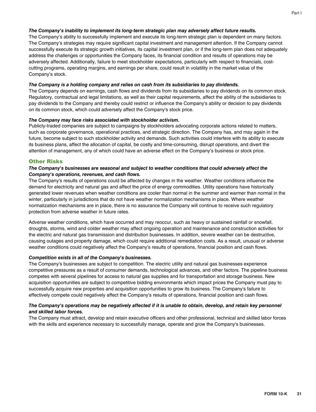 31 Part I FORM 10-K The Company's inability to implement its long-term strategic plan may adversely affect future results. The Company’s ability to successfully implement and execute its long-term strategic plan is dependent on many factors. The Company’s strategies may require significant capital investment and management attention. If the Company cannot successfully execute its strategic growth initiatives, its capital investment plan, or if the long-term plan does not adequately address the challenges or opportunities the Company faces, its financial condition and results of operations may be adversely affected. Additionally, failure to meet stockholder expectations, particularly with respect to financials, cost- cutting programs, operating margins, and earnings per share, could result in volatility in the market value of the Company’s stock. The Company is a holding company and relies on cash from its subsidiaries to pay dividends. The Company depends on earnings, cash flows and dividends from its subsidiaries to pay dividends on its common stock. Regulatory, contractual and legal limitations, as well as their capital requirements, affect the ability of the subsidiaries to pay dividends to the Company and thereby could restrict or influence the Company's ability or decision to pay dividends on its common stock, which could adversely affect the Company's stock price. The Company may face risks associated with stockholder activism. Publicly-traded companies are subject to campaigns by stockholders advocating corporate actions related to matters, such as corporate governance, operational practices, and strategic direction. The Company has, and may again in the future, become subject to such stockholder activity and demands. Such activities could interfere with its ability to execute its business plans, affect the allocation of capital, be costly and time-consuming, disrupt operations, and divert the attention of management, any of which could have an adverse effect on the Company’s business or stock price. Other Risks The Company's businesses are seasonal and subject to weather conditions that could adversely affect the Company's operations, revenues, and cash flows. The Company's results of operations could be affected by changes in the weather. Weather conditions influence the demand for electricity and natural gas and affect the price of energy commodities. Utility operations have historically generated lower revenues when weather conditions are cooler than normal in the summer and warmer than normal in the winter, particularly in jurisdictions that do not have weather normalization mechanisms in place. Where weather normalization mechanisms are in place, there is no assurance the Company will continue to receive such regulatory protection from adverse weather in future rates. Adverse weather conditions, which have occurred and may reoccur, such as heavy or sustained rainfall or snowfall, droughts, storms, wind and colder weather may affect ongoing operation and maintenance and construction activities for the electric and natural gas transmission and distribution businesses. In addition, severe weather can be destructive, causing outages and property damage, which could require additional remediation costs. As a result, unusual or adverse weather conditions could negatively affect the Company's results of operations, financial position and cash flows. Competition exists in all of the Company's businesses. The Company's businesses are subject to competition. The electric utility and natural gas businesses experience competitive pressures as a result of consumer demands, technological advances, and other factors. The pipeline business competes with several pipelines for access to natural gas supplies and for transportation and storage business. New acquisition opportunities are subject to competitive bidding environments which impact prices the Company must pay to successfully acquire new properties and acquisition opportunities to grow its business. The Company's failure to effectively compete could negatively affect the Company's results of operations, financial position and cash flows. The Company's operations may be negatively affected if it is unable to obtain, develop, and retain key personnel and skilled labor forces. The Company must attract, develop and retain executive officers and other professional, technical and skilled labor forces with the skills and experience necessary to successfully manage, operate and grow the Company's businesses. Index Part I MDU Resources Group, Inc. Form 10-K 31