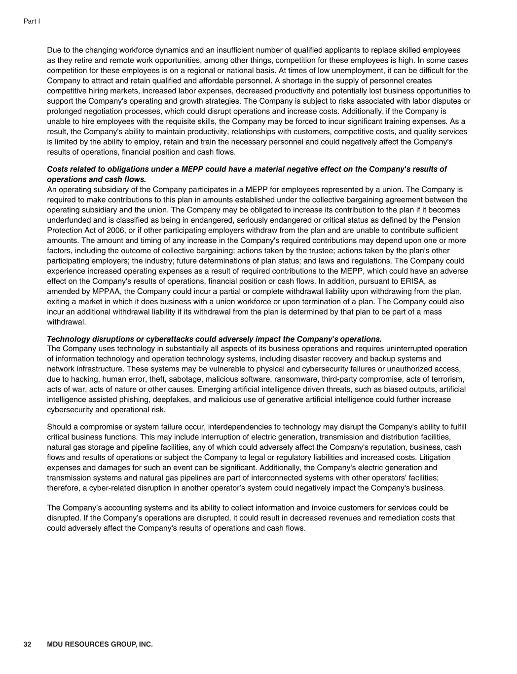 MDU RESOURCES GROUP, INC. Part I 32 Due to the changing workforce dynamics and an insufficient number of qualified applicants to replace skilled employees as they retire and remote work opportunities, among other things, competition for these employees is high. In some cases competition for these employees is on a regional or national basis. At times of low unemployment, it can be difficult for the Company to attract and retain qualified and affordable personnel. A shortage in the supply of personnel creates competitive hiring markets, increased labor expenses, decreased productivity and potentially lost business opportunities to support the Company's operating and growth strategies. The Company is subject to risks associated with labor disputes or prolonged negotiation processes, which could disrupt operations and increase costs. Additionally, if the Company is unable to hire employees with the requisite skills, the Company may be forced to incur significant training expenses. As a result, the Company's ability to maintain productivity, relationships with customers, competitive costs, and quality services is limited by the ability to employ, retain and train the necessary personnel and could negatively affect the Company's results of operations, financial position and cash flows. Costs related to obligations under a MEPP could have a material negative effect on the Company's results of operations and cash flows. An operating subsidiary of the Company participates in a MEPP for employees represented by a union. The Company is required to make contributions to this plan in amounts established under the collective bargaining agreement between the operating subsidiary and the union. The Company may be obligated to increase its contribution to the plan if it becomes underfunded and is classified as being in endangered, seriously endangered or critical status as defined by the Pension Protection Act of 2006, or if other participating employers withdraw from the plan and are unable to contribute sufficient amounts. The amount and timing of any increase in the Company's required contributions may depend upon one or more factors, including the outcome of collective bargaining; actions taken by the trustee; actions taken by the plan's other participating employers; the industry; future determinations of plan status; and laws and regulations. The Company could experience increased operating expenses as a result of required contributions to the MEPP, which could have an adverse effect on the Company's results of operations, financial position or cash flows. In addition, pursuant to ERISA, as amended by MPPAA, the Company could incur a partial or complete withdrawal liability upon withdrawing from the plan, exiting a market in which it does business with a union workforce or upon termination of a plan. The Company could also incur an additional withdrawal liability if its withdrawal from the plan is determined by that plan to be part of a mass withdrawal. Technology disruptions or cyberattacks could adversely impact the Company's operations. The Company uses technology in substantially all aspects of its business operations and requires uninterrupted operation of information technology and operation technology systems, including disaster recovery and backup systems and network infrastructure. These systems may be vulnerable to physical and cybersecurity failures or unauthorized access, due to hacking, human error, theft, sabotage, malicious software, ransomware, third-party compromise, acts of terrorism, acts of war, acts of nature or other causes. Emerging artificial intelligence driven threats, such as biased outputs, artificial intelligence assisted phishing, deepfakes, and malicious use of generative artificial intelligence could further increase cybersecurity and operational risk. Should a compromise or system failure occur, interdependencies to technology may disrupt the Company's ability to fulfill critical business functions. This may include interruption of electric generation, transmission and distribution facilities, natural gas storage and pipeline facilities, any of which could adversely affect the Company's reputation, business, cash flows and results of operations or subject the Company to legal or regulatory liabilities and increased costs. Litigation expenses and damages for such an event can be significant. Additionally, the Company's electric generation and transmission systems and natural gas pipelines are part of interconnected systems with other operators’ facilities; therefore, a cyber-related disruption in another operator’s system could negatively impact the Company's business. The Company’s accounting systems and its ability to collect information and invoice customers for services could be disrupted. If the Company’s operations are disrupted, it could result in decreased revenues and remediation costs that could adversely affect the Company's results of operations and cash flows. Index Part I 32 MDU Resources Group, Inc. Form 10-K