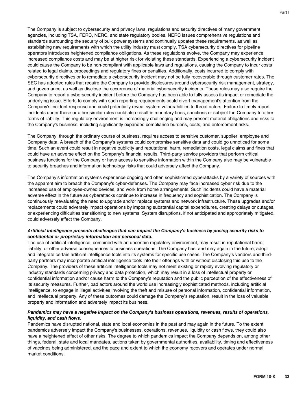 33 Part I FORM 10-K The Company is subject to cybersecurity and privacy laws, regulations and security directives of many government agencies, including TSA, FERC, NERC, and state regulatory bodies. NERC issues comprehensive regulations and standards surrounding the security of bulk power systems and continually updates these requirements, as well as establishing new requirements with which the utility industry must comply. TSA cybersecurity directives for pipeline operators introduces heightened compliance obligations. As these regulations evolve, the Company may experience increased compliance costs and may be at higher risk for violating these standards. Experiencing a cybersecurity incident could cause the Company to be non-compliant with applicable laws and regulations, causing the Company to incur costs related to legal claims, proceedings and regulatory fines or penalties. Additionally, costs incurred to comply with cybersecurity directives or to remediate a cybersecurity incident may not be fully recoverable through customer rates. The SEC has adopted rules that require the Company to provide disclosures around cybersecurity risk management, strategy, and governance, as well as disclose the occurrence of material cybersecurity incidents. These rules may also require the Company to report a cybersecurity incident before the Company has been able to fully assess its impact or remediate the underlying issue. Efforts to comply with such reporting requirements could divert management's attention from the Company's incident response and could potentially reveal system vulnerabilities to threat actors. Failure to timely report incidents under these or other similar rules could also result in monetary fines, sanctions or subject the Company to other forms of liability. This regulatory environment is increasingly challenging and may present material obligations and risks to the Company's business, including significantly expanded compliance burdens, costs, and enforcement risks. The Company, through the ordinary course of business, requires access to sensitive customer, supplier, employee and Company data. A breach of the Company's systems could compromise sensitive data and could go unnoticed for some time. Such an event could result in negative publicity and reputational harm, remediation costs, legal claims and fines that could have an adverse effect on the Company's financial results. Third-party service providers that perform critical business functions for the Company or have access to sensitive information within the Company also may be vulnerable to security breaches and information technology risks that could adversely affect the Company. The Company’s information systems experience ongoing and often sophisticated cyberattacks by a variety of sources with the apparent aim to breach the Company's cyber-defenses. The Company may face increased cyber risk due to the increased use of employee-owned devices, and work from home arrangements. Such incidents could have a material adverse effect in the future as cyberattacks continue to increase in frequency and sophistication. The Company is continuously reevaluating the need to upgrade and/or replace systems and network infrastructure. These upgrades and/or replacements could adversely impact operations by imposing substantial capital expenditures, creating delays or outages, or experiencing difficulties transitioning to new systems. System disruptions, if not anticipated and appropriately mitigated, could adversely affect the Company. Artificial intelligence presents challenges that can impact the Company's business by posing security risks to confidential or proprietary information and personal data. The use of artificial intelligence, combined with an uncertain regulatory environment, may result in reputational harm, liability, or other adverse consequences to business operations. The Company has, and may again in the future, adopt and integrate certain artificial intelligence tools into its systems for specific use cases. The Company’s vendors and third- party partners may incorporate artificial intelligence tools into their offerings with or without disclosing this use to the Company. The providers of these artificial intelligence tools may not meet existing or rapidly evolving regulatory or industry standards concerning privacy and data protection, which may result in a loss of intellectual property or confidential information and/or cause harm to the Company’s reputation and the public perception of the effectiveness of its security measures. Further, bad actors around the world use increasingly sophisticated methods, including artificial intelligence, to engage in illegal activities involving the theft and misuse of personal information, confidential information, and intellectual property. Any of these outcomes could damage the Company’s reputation, result in the loss of valuable property and information and adversely impact its business. Pandemics may have a negative impact on the Company's business operations, revenues, results of operations, liquidity, and cash flows. Pandemics have disrupted national, state and local economies in the past and may again in the future. To the extent pandemics adversely impact the Company's businesses, operations, revenues, liquidity or cash flows, they could also have a heightened effect of other risks. The degree to which pandemics impact the Company depends on, among other things, federal, state and local mandates, actions taken by governmental authorities, availability, timing and effectiveness of vaccines being administered, and the pace and extent to which the economy recovers and operates under normal market conditions. Index Part I MDU Resources Group, Inc. Form 10-K 33