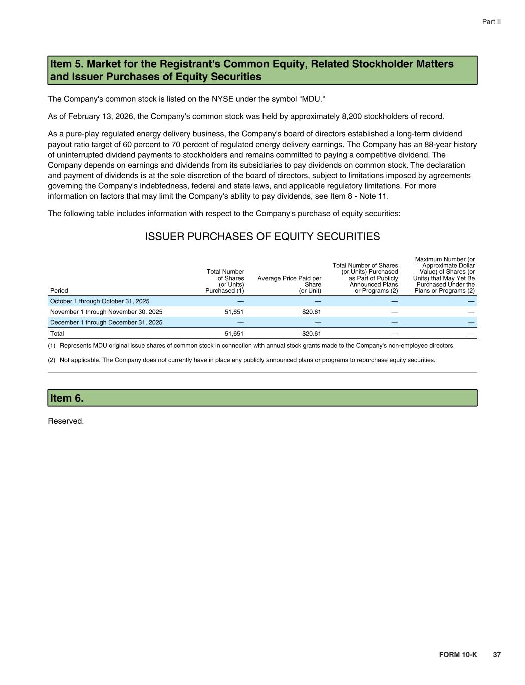 Part II 37FORM 10-K Item 5. Market for the Registrant's Common Equity, Related Stockholder Matters and Issuer Purchases of Equity Securities The Company's common stock is listed on the NYSE under the symbol "MDU." As of February 13, 2026, the Company's common stock was held by approximately 8,200 stockholders of record. As a pure-play regulated energy delivery business, the Company's board of directors established a long-term dividend payout ratio target of 60 percent to 70 percent of regulated energy delivery earnings. The Company has an 88-year history of uninterrupted dividend payments to stockholders and remains committed to paying a competitive dividend. The Company depends on earnings and dividends from its subsidiaries to pay dividends on common stock. The declaration and payment of dividends is at the sole discretion of the board of directors, subject to limitations imposed by agreements governing the Company's indebtedness, federal and state laws, and applicable regulatory limitations. For more information on factors that may limit the Company's ability to pay dividends, see Item 8 - Note 11. The following table includes information with respect to the Company's purchase of equity securities: ISSUER PURCHASES OF EQUITY SECURITIES Period Total Number of Shares (or Units) Purchased (1) Average Price Paid per Share (or Unit) Total Number of Shares (or Units) Purchased as Part of Publicly Announced Plans or Programs (2) Maximum Number (or Approximate Dollar Value) of Shares (or Units) that May Yet Be Purchased Under the Plans or Programs (2) October 1 through October 31, 2025 — — — — November 1 through November 30, 2025 51,651 $20.61 — — December 1 through December 31, 2025 — — — — Total 51,651 $20.61 — — (1) Represents MDU original issue shares of common stock in connection with annual stock grants made to the Company's non-employee directors. (2) Not applicable. The Company does not currently have in place any publicly announced plans or programs to repurchase equity securities. Item 6. Reserved. Index Part II MDU Resources Group, Inc. Form 10-K 37