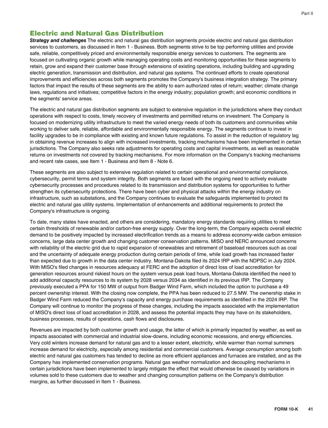 Part II 41FORM 10-K Electric and Natural Gas Distribution Strategy and challenges The electric and natural gas distribution segments provide electric and natural gas distribution services to customers, as discussed in Item 1 - Business. Both segments strive to be top performing utilities and provide safe, reliable, competitively priced and environmentally responsible energy services to customers. The segments are focused on cultivating organic growth while managing operating costs and monitoring opportunities for these segments to retain, grow and expand their customer base through extensions of existing operations, including building and upgrading electric generation, transmission and distribution, and natural gas systems. The continued efforts to create operational improvements and efficiencies across both segments promotes the Company's business integration strategy. The primary factors that impact the results of these segments are the ability to earn authorized rates of return; weather; climate change laws, regulations and initiatives; competitive factors in the energy industry; population growth; and economic conditions in the segments' service areas. The electric and natural gas distribution segments are subject to extensive regulation in the jurisdictions where they conduct operations with respect to costs, timely recovery of investments and permitted returns on investment. The Company is focused on modernizing utility infrastructure to meet the varied energy needs of both its customers and communities while working to deliver safe, reliable, affordable and environmentally responsible energy. The segments continue to invest in facility upgrades to be in compliance with existing and known future regulations. To assist in the reduction of regulatory lag in obtaining revenue increases to align with increased investments, tracking mechanisms have been implemented in certain jurisdictions. The Company also seeks rate adjustments for operating costs and capital investments, as well as reasonable returns on investments not covered by tracking mechanisms. For more information on the Company's tracking mechanisms and recent rate cases, see Item 1 - Business and Item 8 - Note 6. These segments are also subject to extensive regulation related to certain operational and environmental compliance, cybersecurity, permit terms and system integrity. Both segments are faced with the ongoing need to actively evaluate cybersecurity processes and procedures related to its transmission and distribution systems for opportunities to further strengthen its cybersecurity protections. There have been cyber and physical attacks within the energy industry on infrastructure, such as substations, and the Company continues to evaluate the safeguards implemented to protect its electric and natural gas utility systems. Implementation of enhancements and additional requirements to protect the Company's infrastructure is ongoing. To date, many states have enacted, and others are considering, mandatory energy standards requiring utilities to meet certain thresholds of renewable and/or carbon-free energy supply. Over the long-term, the Company expects overall electric demand to be positively impacted by increased electrification trends as a means to address economy-wide carbon emission concerns, large data center growth and changing customer conservation patterns. MISO and NERC announced concerns with reliability of the electric grid due to rapid expansion of renewables and retirement of baseload resources such as coal and the uncertainty of adequate energy production during certain periods of time, while load growth has increased faster than expected due to growth in the data center industry. Montana-Dakota filed its 2024 IRP with the NDPSC in July 2024. With MISO's filed changes in resources adequacy at FERC and the adoption of direct loss of load accreditation for generation resources around riskiest hours on the system versus peak load hours, Montana-Dakota identified the need to add additional capacity resources to its system by 2028 versus 2034 as identified in its previous IRP. The Company previously executed a PPA for 150 MW of output from Badger Wind Farm, which included the option to purchase a 49 percent ownership interest. With the closing now complete, the PPA has been reduced to 27.5 MW. The ownership stake in Badger Wind Farm reduced the Company's capacity and energy purchase requirements as identified in the 2024 IRP. The Company will continue to monitor the progress of these changes, including the impacts associated with the implementation of MISO's direct loss of load accreditation in 2028, and assess the potential impacts they may have on its stakeholders, business processes, results of operations, cash flows and disclosures. Revenues are impacted by both customer growth and usage, the latter of which is primarily impacted by weather, as well as impacts associated with commercial and industrial slow-downs, including economic recessions, and energy efficiencies. Very cold winters increase demand for natural gas and to a lesser extent, electricity, while warmer than normal summers increase demand for electricity, especially among residential and commercial customers. Average consumption among both electric and natural gas customers has tended to decline as more efficient appliances and furnaces are installed, and as the Company has implemented conservation programs. Natural gas weather normalization and decoupling mechanisms in certain jurisdictions have been implemented to largely mitigate the effect that would otherwise be caused by variations in volumes sold to these customers due to weather and changing consumption patterns on the Company's distribution margins, as further discussed in Item 1 - Business. Index Part II MDU Resources Group, Inc. Form 10-K 41