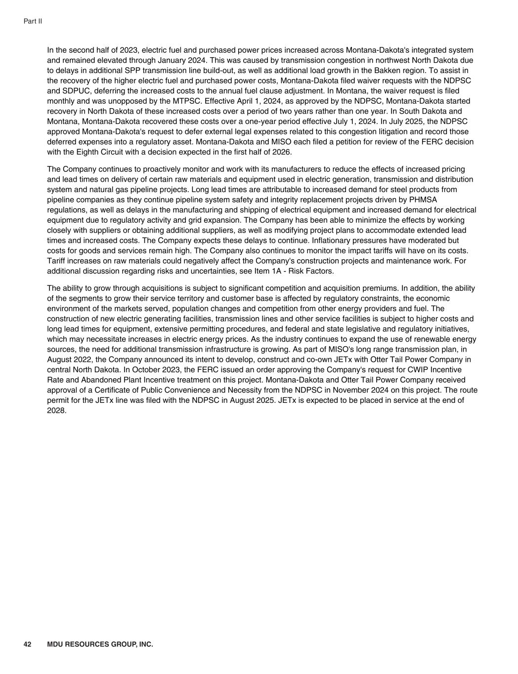 Part II MDU RESOURCES GROUP, INC.42 In the second half of 2023, electric fuel and purchased power prices increased across Montana-Dakota's integrated system and remained elevated through January 2024. This was caused by transmission congestion in northwest North Dakota due to delays in additional SPP transmission line build-out, as well as additional load growth in the Bakken region. To assist in the recovery of the higher electric fuel and purchased power costs, Montana-Dakota filed waiver requests with the NDPSC and SDPUC, deferring the increased costs to the annual fuel clause adjustment. In Montana, the waiver request is filed monthly and was unopposed by the MTPSC. Effective April 1, 2024, as approved by the NDPSC, Montana-Dakota started recovery in North Dakota of these increased costs over a period of two years rather than one year. In South Dakota and Montana, Montana-Dakota recovered these costs over a one-year period effective July 1, 2024. In July 2025, the NDPSC approved Montana-Dakota's request to defer external legal expenses related to this congestion litigation and record those deferred expenses into a regulatory asset. Montana-Dakota and MISO each filed a petition for review of the FERC decision with the Eighth Circuit with a decision expected in the first half of 2026. The Company continues to proactively monitor and work with its manufacturers to reduce the effects of increased pricing and lead times on delivery of certain raw materials and equipment used in electric generation, transmission and distribution system and natural gas pipeline projects. Long lead times are attributable to increased demand for steel products from pipeline companies as they continue pipeline system safety and integrity replacement projects driven by PHMSA regulations, as well as delays in the manufacturing and shipping of electrical equipment and increased demand for electrical equipment due to regulatory activity and grid expansion. The Company has been able to minimize the effects by working closely with suppliers or obtaining additional suppliers, as well as modifying project plans to accommodate extended lead times and increased costs. The Company expects these delays to continue. Inflationary pressures have moderated but costs for goods and services remain high. The Company also continues to monitor the impact tariffs will have on its costs. Tariff increases on raw materials could negatively affect the Company's construction projects and maintenance work. For additional discussion regarding risks and uncertainties, see Item 1A - Risk Factors. The ability to grow through acquisitions is subject to significant competition and acquisition premiums. In addition, the ability of the segments to grow their service territory and customer base is affected by regulatory constraints, the economic environment of the markets served, population changes and competition from other energy providers and fuel. The construction of new electric generating facilities, transmission lines and other service facilities is subject to higher costs and long lead times for equipment, extensive permitting procedures, and federal and state legislative and regulatory initiatives, which may necessitate increases in electric energy prices. As the industry continues to expand the use of renewable energy sources, the need for additional transmission infrastructure is growing. As part of MISO's long range transmission plan, in August 2022, the Company announced its intent to develop, construct and co-own JETx with Otter Tail Power Company in central North Dakota. In October 2023, the FERC issued an order approving the Company's request for CWIP Incentive Rate and Abandoned Plant Incentive treatment on this project. Montana-Dakota and Otter Tail Power Company received approval of a Certificate of Public Convenience and Necessity from the NDPSC in November 2024 on this project. The route permit for the JETx line was filed with the NDPSC in August 2025. JETx is expected to be placed in service at the end of 2028. Index Part II 42 MDU Resources Group, Inc. Form 10-K