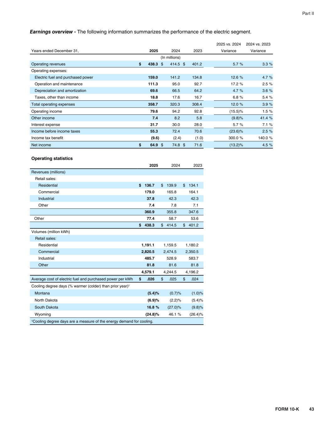 Part II 43FORM 10-K Earnings overview - The following information summarizes the performance of the electric segment. 2025 vs. 2024 2024 vs. 2023 Years ended December 31, 2025 2024 2023 Variance Variance (In millions) Operating revenues $ 438.3 $ 414.5 $ 401.2 5.7 % 3.3 % Operating expenses: Electric fuel and purchased power 159.0 141.2 134.8 12.6 % 4.7 % Operation and maintenance 111.3 95.0 92.7 17.2 % 2.5 % Depreciation and amortization 69.6 66.5 64.2 4.7 % 3.6 % Taxes, other than income 18.8 17.6 16.7 6.8 % 5.4 % Total operating expenses 358.7 320.3 308.4 12.0 % 3.9 % Operating income 79.6 94.2 92.8 (15.5) % 1.5 % Other income 7.4 8.2 5.8 (9.8) % 41.4 % Interest expense 31.7 30.0 28.0 5.7 % 7.1 % Income before income taxes 55.3 72.4 70.6 (23.6) % 2.5 % Income tax benefit (9.6) (2.4) (1.0) 300.0 % 140.0 % Net income $ 64.9 $ 74.8 $ 71.6 (13.2) % 4.5 % Operating statistics 2025 2024 2023 Revenues (millions) Retail sales: Residential $ 136.7 $ 139.9 $ 134.1 Commercial 179.0 165.8 164.1 Industrial 37.8 42.3 42.3 Other 7.4 7.8 7.1 360.9 355.8 347.6 Other 77.4 58.7 53.6 $ 438.3 $ 414.5 $ 401.2 Volumes (million kWh) Retail sales: Residential 1,191.1 1,159.5 1,180.2 Commercial 2,820.5 2,474.5 2,350.5 Industrial 485.7 528.9 583.7 Other 81.8 81.6 81.8 4,579.1 4,244.5 4,196.2 Average cost of electric fuel and purchased power per kWh $ .026 $ .025 $ .024 Cooling degree days (% warmer (colder) than prior year)1 Montana (5.4) % (0.7) % (1.0) % North Dakota (6.9) % (2.2) % (5.4) % South Dakota 16.8 % (27.0) % (9.8) % Wyoming (24.8) % 46.1 % (26.4) % 1Cooling degree days are a measure of the energy demand for cooling. Index Part II MDU Resources Group, Inc. Form 10-K 43
