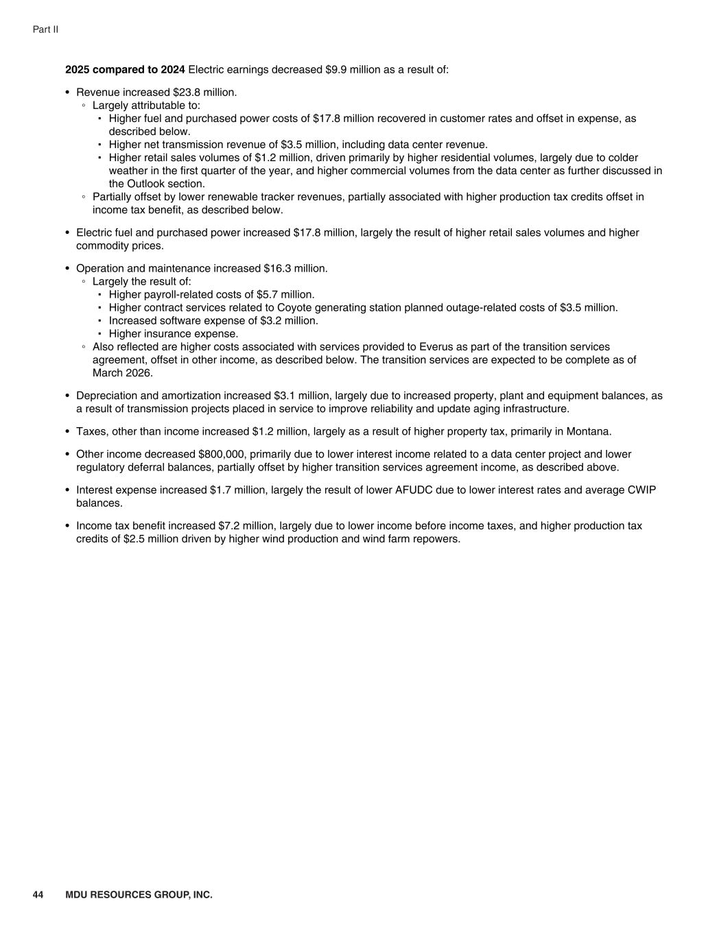 Part II MDU RESOURCES GROUP, INC.44 2025 compared to 2024 Electric earnings decreased $9.9 million as a result of: • Revenue increased $23.8 million. ◦ Largely attributable to: ▪ Higher fuel and purchased power costs of $17.8 million recovered in customer rates and offset in expense, as described below. ▪ Higher net transmission revenue of $3.5 million, including data center revenue. ▪ Higher retail sales volumes of $1.2 million, driven primarily by higher residential volumes, largely due to colder weather in the first quarter of the year, and higher commercial volumes from the data center as further discussed in the Outlook section. ◦ Partially offset by lower renewable tracker revenues, partially associated with higher production tax credits offset in income tax benefit, as described below. • Electric fuel and purchased power increased $17.8 million, largely the result of higher retail sales volumes and higher commodity prices. • Operation and maintenance increased $16.3 million. ◦ Largely the result of: ▪ Higher payroll-related costs of $5.7 million. ▪ Higher contract services related to Coyote generating station planned outage-related costs of $3.5 million. ▪ Increased software expense of $3.2 million. ▪ Higher insurance expense. ◦ Also reflected are higher costs associated with services provided to Everus as part of the transition services agreement, offset in other income, as described below. The transition services are expected to be complete as of March 2026. • Depreciation and amortization increased $3.1 million, largely due to increased property, plant and equipment balances, as a result of transmission projects placed in service to improve reliability and update aging infrastructure. • Taxes, other than income increased $1.2 million, largely as a result of higher property tax, primarily in Montana. • Other income decreased $800,000, primarily due to lower interest income related to a data center project and lower regulatory deferral balances, partially offset by higher transition services agreement income, as described above. • Interest expense increased $1.7 million, largely the result of lower AFUDC due to lower interest rates and average CWIP balances. • Income tax benefit increased $7.2 million, largely due to lower income before income taxes, and higher production tax credits of $2.5 million driven by higher wind production and wind farm repowers. Index Part II 44 MDU Resources Group, Inc. Form 10-K