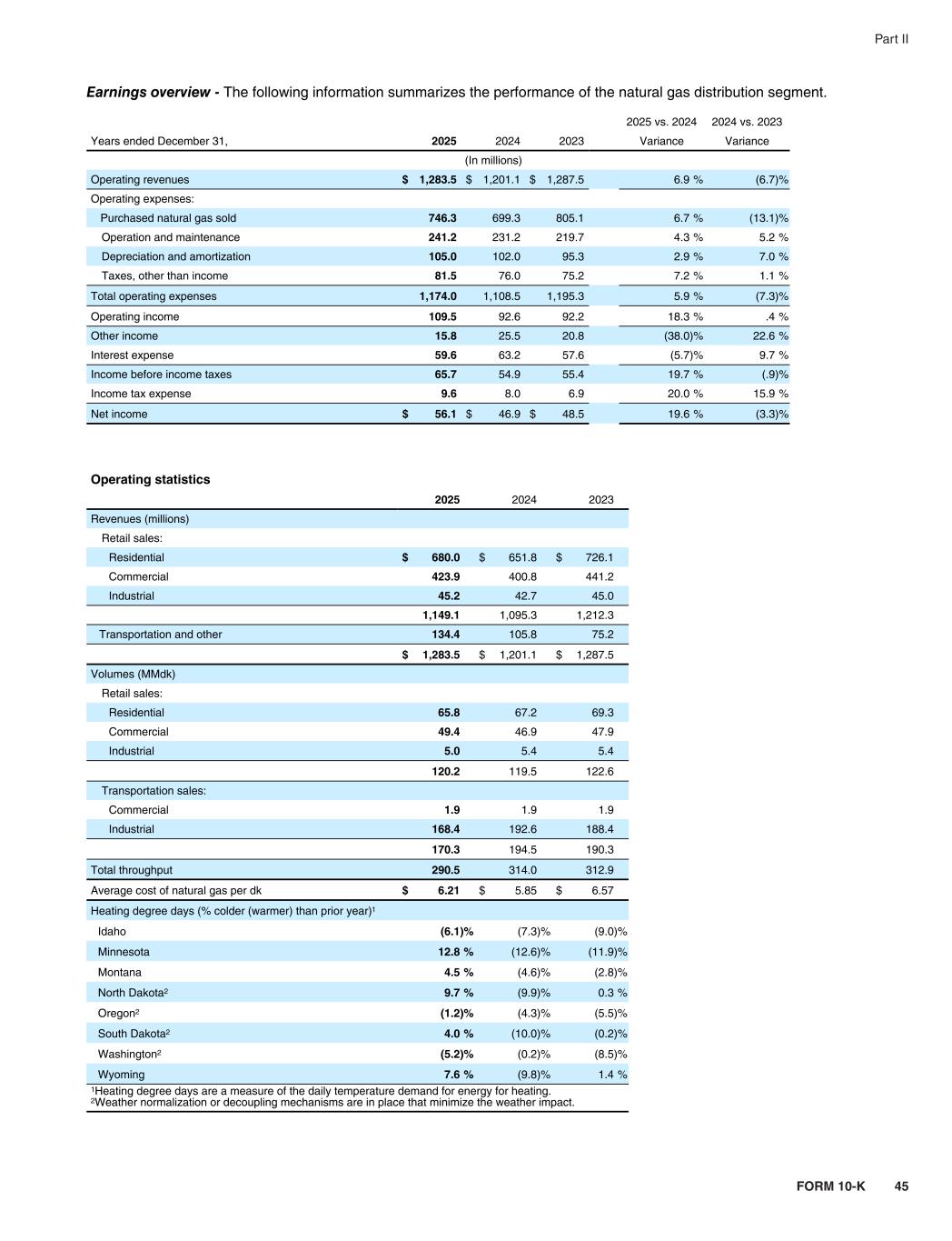 Part II 45FORM 10-K Earnings overview - The following information summarizes the performance of the natural gas distribution segment. 2025 vs. 2024 2024 vs. 2023 Years ended December 31, 2025 2024 2023 Variance Variance (In millions) Operating revenues $ 1,283.5 $ 1,201.1 $ 1,287.5 6.9 % (6.7) % Operating expenses: Purchased natural gas sold 746.3 699.3 805.1 6.7 % (13.1) % Operation and maintenance 241.2 231.2 219.7 4.3 % 5.2 % Depreciation and amortization 105.0 102.0 95.3 2.9 % 7.0 % Taxes, other than income 81.5 76.0 75.2 7.2 % 1.1 % Total operating expenses 1,174.0 1,108.5 1,195.3 5.9 % (7.3) % Operating income 109.5 92.6 92.2 18.3 % .4 % Other income 15.8 25.5 20.8 (38.0) % 22.6 % Interest expense 59.6 63.2 57.6 (5.7) % 9.7 % Income before income taxes 65.7 54.9 55.4 19.7 % (.9) % Income tax expense 9.6 8.0 6.9 20.0 % 15.9 % Net income $ 56.1 $ 46.9 $ 48.5 19.6 % (3.3) % Operating statistics 2025 2024 2023 Revenues (millions) Retail sales: Residential $ 680.0 $ 651.8 $ 726.1 Commercial 423.9 400.8 441.2 Industrial 45.2 42.7 45.0 1,149.1 1,095.3 1,212.3 Transportation and other 134.4 105.8 75.2 $ 1,283.5 $ 1,201.1 $ 1,287.5 Volumes (MMdk) Retail sales: Residential 65.8 67.2 69.3 Commercial 49.4 46.9 47.9 Industrial 5.0 5.4 5.4 120.2 119.5 122.6 Transportation sales: Commercial 1.9 1.9 1.9 Industrial 168.4 192.6 188.4 170.3 194.5 190.3 Total throughput 290.5 314.0 312.9 Average cost of natural gas per dk $ 6.21 $ 5.85 $ 6.57 Heating degree days (% colder (warmer) than prior year)1 Idaho (6.1) % (7.3) % (9.0) % Minnesota 12.8 % (12.6) % (11.9) % Montana 4.5 % (4.6) % (2.8) % North Dakota2 9.7 % (9.9) % 0.3 % Oregon2 (1.2) % (4.3) % (5.5) % South Dakota2 4.0 % (10.0) % (0.2) % Washington2 (5.2) % (0.2) % (8.5) % Wyoming 7.6 % (9.8) % 1.4 % 1Heating degree days are a measure of the daily temperature demand for energy for heating. 2Weather normalization or decoupling mechanisms are in place that minimize the weather impact. Index Part II MDU Resources Group, Inc. Form 10-K 45