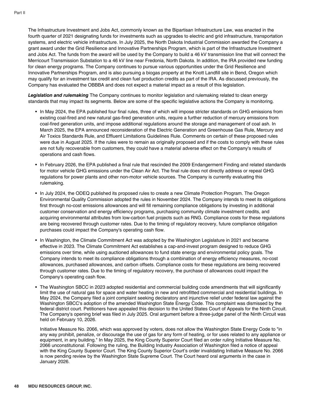 Part II MDU RESOURCES GROUP, INC.48 The Infrastructure Investment and Jobs Act, commonly known as the Bipartisan Infrastructure Law, was enacted in the fourth quarter of 2021 designating funds for investments such as upgrades to electric and grid infrastructure, transportation systems, and electric vehicle infrastructure. In July 2025, the North Dakota Industrial Commission awarded the Company a grant award under the Grid Resilience and Innovative Partnerships Program, which is part of the Infrastructure Investment and Jobs Act. The funds from the award will be used by the Company to build a 46 kV transmission line that will connect the Merricourt Transmission Substation to a 46 kV line near Fredonia, North Dakota. In addition, the IRA provided new funding for clean energy programs. The Company continues to pursue various opportunities under the Grid Resilience and Innovative Partnerships Program, and is also pursuing a biogas property at the Knott Landfill site in Bend, Oregon which may qualify for an investment tax credit and clean fuel production credits as part of the IRA. As discussed previously, the Company has evaluated the OBBBA and does not expect a material impact as a result of this legislation. Legislation and rulemaking The Company continues to monitor legislation and rulemaking related to clean energy standards that may impact its segments. Below are some of the specific legislative actions the Company is monitoring. • In May 2024, the EPA published four final rules, three of which will impose stricter standards on GHG emissions from existing coal-fired and new natural gas-fired generation units, require a further reduction of mercury emissions from coal-fired generation units, and impose additional regulations around the storage and management of coal ash. In March 2025, the EPA announced reconsideration of the Electric Generation and Greenhouse Gas Rule, Mercury and Air Toxics Standards Rule, and Effluent Limitations Guidelines Rule. Comments on certain of these proposed rules were due in August 2025. If the rules were to remain as originally proposed and if the costs to comply with these rules are not fully recoverable from customers, they could have a material adverse effect on the Company's results of operations and cash flows. • In February 2026, the EPA published a final rule that rescinded the 2009 Endangerment Finding and related standards for motor vehicle GHG emissions under the Clean Air Act. The final rule does not directly address or repeal GHG regulations for power plants and other non-motor vehicle sources. The Company is currently evaluating this rulemaking. • In July 2024, the ODEQ published its proposed rules to create a new Climate Protection Program. The Oregon Environmental Quality Commission adopted the rules in November 2024. The Company intends to meet its obligations first through no-cost emissions allowances and will fill remaining compliance obligations by investing in additional customer conservation and energy efficiency programs, purchasing community climate investment credits, and acquiring environmental attributes from low-carbon fuel projects such as RNG. Compliance costs for these regulations are being recovered through customer rates. Due to the timing of regulatory recovery, future compliance obligation purchases could impact the Company's operating cash flow. • In Washington, the Climate Commitment Act was adopted by the Washington Legislature in 2021 and became effective in 2023. The Climate Commitment Act establishes a cap-and-invest program designed to reduce GHG emissions over time, while using auctioned allowances to fund state energy and environmental policy goals. The Company intends to meet its compliance obligations through a combination of energy efficiency measures, no-cost allowances, purchased allowances, and carbon offsets. Compliance costs for these regulations are being recovered through customer rates. Due to the timing of regulatory recovery, the purchase of allowances could impact the Company's operating cash flow. • The Washington SBCC in 2023 adopted residential and commercial building code amendments that will significantly limit the use of natural gas for space and water heating in new and retrofitted commercial and residential buildings. In May 2024, the Company filed a joint complaint seeking declaratory and injunctive relief under federal law against the Washington SBCC's adoption of the amended Washington State Energy Code. This complaint was dismissed by the federal district court. Petitioners have appealed this decision to the United States Court of Appeals for the Ninth Circuit. The Company's opening brief was filed in July 2025. Oral argument before a three-judge panel of the Ninth Circuit was held on February 10, 2026. Initiative Measure No. 2066, which was approved by voters, does not allow the Washington State Energy Code to "in any way prohibit, penalize, or discourage the use of gas for any form of heating, or for uses related to any appliance or equipment, in any building." In May 2025, the King County Superior Court filed an order ruling Initiative Measure No. 2066 unconstitutional. Following the ruling, the Building Industry Association of Washington filed a notice of appeal with the King County Superior Court. The King County Superior Court’s order invalidating Initiative Measure No. 2066 is now pending review by the Washington State Supreme Court. The Court heard oral arguments in the case in January 2026. Index Part II 48 MDU Resources Group, Inc. Form 10-K