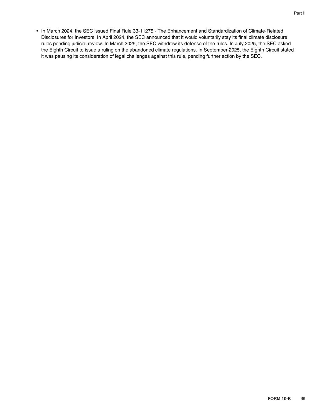Part II 49FORM 10-K • In March 2024, the SEC issued Final Rule 33-11275 - The Enhancement and Standardization of Climate-Related Disclosures for Investors. In April 2024, the SEC announced that it would voluntarily stay its final climate disclosure rules pending judicial review. In March 2025, the SEC withdrew its defense of the rules. In July 2025, the SEC asked the Eighth Circuit to issue a ruling on the abandoned climate regulations. In September 2025, the Eighth Circuit stated it was pausing its consideration of legal challenges against this rule, pending further action by the SEC. Index Part II MDU Resources Group, Inc. Form 10-K 49