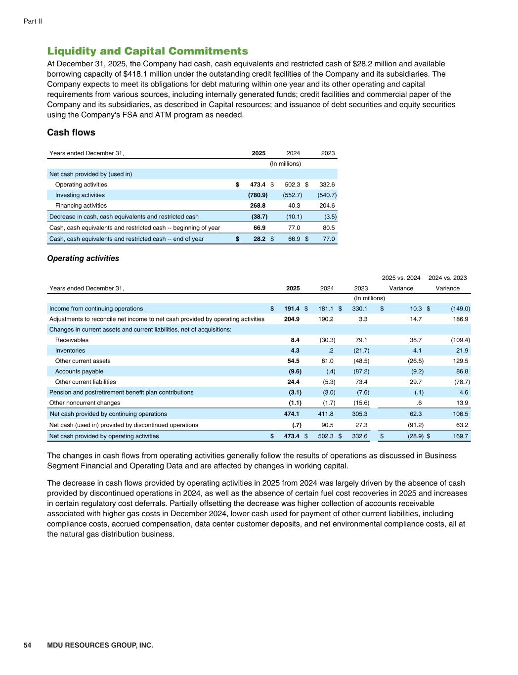 Part II MDU RESOURCES GROUP, INC.54 Liquidity and Capital Commitments At December 31, 2025, the Company had cash, cash equivalents and restricted cash of $28.2 million and available borrowing capacity of $418.1 million under the outstanding credit facilities of the Company and its subsidiaries. The Company expects to meet its obligations for debt maturing within one year and its other operating and capital requirements from various sources, including internally generated funds; credit facilities and commercial paper of the Company and its subsidiaries, as described in Capital resources; and issuance of debt securities and equity securities using the Company's FSA and ATM program as needed. Cash flows Years ended December 31, 2025 2024 2023 (In millions) Net cash provided by (used in) Operating activities $ 473.4 $ 502.3 $ 332.6 Investing activities (780.9) (552.7) (540.7) Financing activities 268.8 40.3 204.6 Decrease in cash, cash equivalents and restricted cash (38.7) (10.1) (3.5) Cash, cash equivalents and restricted cash -- beginning of year 66.9 77.0 80.5 Cash, cash equivalents and restricted cash -- end of year $ 28.2 $ 66.9 $ 77.0 Operating activities 2025 vs. 2024 2024 vs. 2023 Years ended December 31, 2025 2024 2023 Variance Variance (In millions) Income from continuing operations $ 191.4 $ 181.1 $ 330.1 $ 10.3 $ (149.0) Adjustments to reconcile net income to net cash provided by operating activities 204.9 190.2 3.3 14.7 186.9 Changes in current assets and current liabilities, net of acquisitions: Receivables 8.4 (30.3) 79.1 38.7 (109.4) Inventories 4.3 .2 (21.7) 4.1 21.9 Other current assets 54.5 81.0 (48.5) (26.5) 129.5 Accounts payable (9.6) (.4) (87.2) (9.2) 86.8 Other current liabilities 24.4 (5.3) 73.4 29.7 (78.7) Pension and postretirement benefit plan contributions (3.1) (3.0) (7.6) (.1) 4.6 Other noncurrent changes (1.1) (1.7) (15.6) .6 13.9 Net cash provided by continuing operations 474.1 411.8 305.3 62.3 106.5 Net cash (used in) provided by discontinued operations (.7) 90.5 27.3 (91.2) 63.2 Net cash provided by operating activities $ 473.4 $ 502.3 $ 332.6 $ (28.9) $ 169.7 The changes in cash flows from operating activities generally follow the results of operations as discussed in Business Segment Financial and Operating Data and are affected by changes in working capital. The decrease in cash flows provided by operating activities in 2025 from 2024 was largely driven by the absence of cash provided by discontinued operations in 2024, as well as the absence of certain fuel cost recoveries in 2025 and increases in certain regulatory cost deferrals. Partially offsetting the decrease was higher collection of accounts receivable associated with higher gas costs in December 2024, lower cash used for payment of other current liabilities, including compliance costs, accrued compensation, data center customer deposits, and net environmental compliance costs, all at the natural gas distribution business. Index Part II 54 MDU Resources Group, Inc. Form 10-K