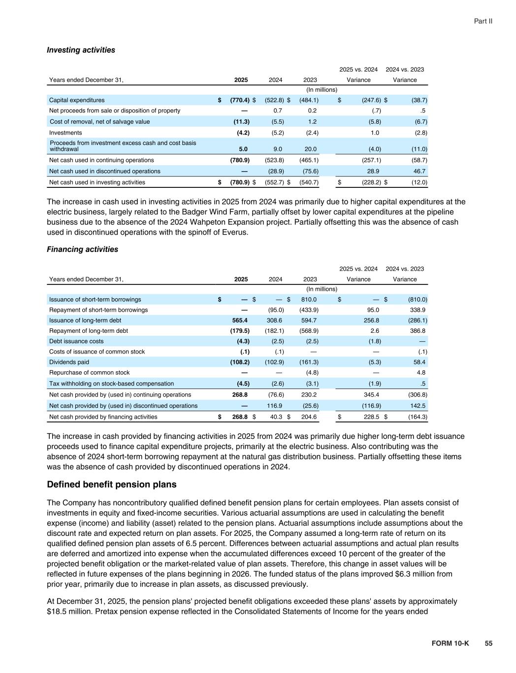 Part II 55FORM 10-K Investing activities 2025 vs. 2024 2024 vs. 2023 Years ended December 31, 2025 2024 2023 Variance Variance (In millions) Capital expenditures $ (770.4) $ (522.8) $ (484.1) $ (247.6) $ (38.7) Net proceeds from sale or disposition of property — 0.7 0.2 (.7) .5 Cost of removal, net of salvage value (11.3) (5.5) 1.2 (5.8) (6.7) Investments (4.2) (5.2) (2.4) 1.0 (2.8) Proceeds from investment excess cash and cost basis withdrawal 5.0 9.0 20.0 (4.0) (11.0) Net cash used in continuing operations (780.9) (523.8) (465.1) (257.1) (58.7) Net cash used in discontinued operations — (28.9) (75.6) 28.9 46.7 Net cash used in investing activities $ (780.9) $ (552.7) $ (540.7) $ (228.2) $ (12.0) The increase in cash used in investing activities in 2025 from 2024 was primarily due to higher capital expenditures at the electric business, largely related to the Badger Wind Farm, partially offset by lower capital expenditures at the pipeline business due to the absence of the 2024 Wahpeton Expansion project. Partially offsetting this was the absence of cash used in discontinued operations with the spinoff of Everus. Financing activities 2025 vs. 2024 2024 vs. 2023 Years ended December 31, 2025 2024 2023 Variance Variance (In millions) Issuance of short-term borrowings $ — $ — $ 810.0 $ — $ (810.0) Repayment of short-term borrowings — (95.0) (433.9) 95.0 338.9 Issuance of long-term debt 565.4 308.6 594.7 256.8 (286.1) Repayment of long-term debt (179.5) (182.1) (568.9) 2.6 386.8 Debt issuance costs (4.3) (2.5) (2.5) (1.8) — Costs of issuance of common stock (.1) (.1) — — (.1) Dividends paid (108.2) (102.9) (161.3) (5.3) 58.4 Repurchase of common stock — — (4.8) — 4.8 Tax withholding on stock-based compensation (4.5) (2.6) (3.1) (1.9) .5 Net cash provided by (used in) continuing operations 268.8 (76.6) 230.2 345.4 (306.8) Net cash provided by (used in) discontinued operations — 116.9 (25.6) (116.9) 142.5 Net cash provided by financing activities $ 268.8 $ 40.3 $ 204.6 $ 228.5 $ (164.3) The increase in cash provided by financing activities in 2025 from 2024 was primarily due higher long-term debt issuance proceeds used to finance capital expenditure projects, primarily at the electric business. Also contributing was the absence of 2024 short-term borrowing repayment at the natural gas distribution business. Partially offsetting these items was the absence of cash provided by discontinued operations in 2024. Defined benefit pension plans The Company has noncontributory qualified defined benefit pension plans for certain employees. Plan assets consist of investments in equity and fixed-income securities. Various actuarial assumptions are used in calculating the benefit expense (income) and liability (asset) related to the pension plans. Actuarial assumptions include assumptions about the discount rate and expected return on plan assets. For 2025, the Company assumed a long-term rate of return on its qualified defined pension plan assets of 6.5 percent. Differences between actuarial assumptions and actual plan results are deferred and amortized into expense when the accumulated differences exceed 10 percent of the greater of the projected benefit obligation or the market-related value of plan assets. Therefore, this change in asset values will be reflected in future expenses of the plans beginning in 2026. The funded status of the plans improved $6.3 million from prior year, primarily due to increase in plan assets, as discussed previously. At December 31, 2025, the pension plans' projected benefit obligations exceeded these plans' assets by approximately $18.5 million. Pretax pension expense reflected in the Consolidated Statements of Income for the years ended Index Part II MDU Resources Group, Inc. Form 10-K 55