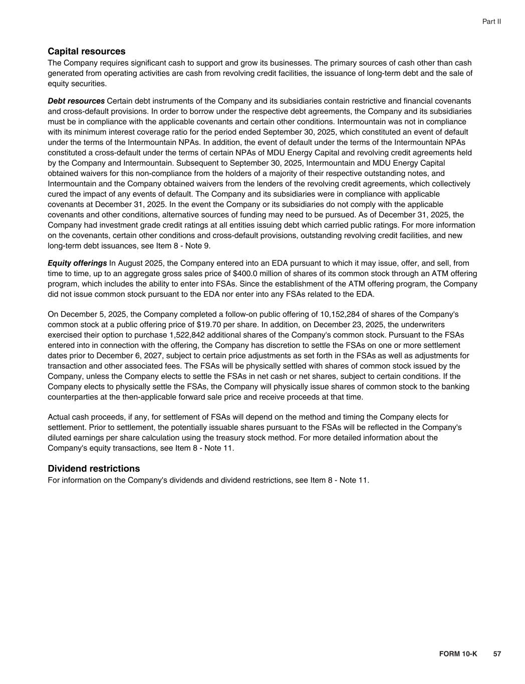 Part II 57FORM 10-K Capital resources The Company requires significant cash to support and grow its businesses. The primary sources of cash other than cash generated from operating activities are cash from revolving credit facilities, the issuance of long-term debt and the sale of equity securities. Debt resources Certain debt instruments of the Company and its subsidiaries contain restrictive and financial covenants and cross-default provisions. In order to borrow under the respective debt agreements, the Company and its subsidiaries must be in compliance with the applicable covenants and certain other conditions. Intermountain was not in compliance with its minimum interest coverage ratio for the period ended September 30, 2025, which constituted an event of default under the terms of the Intermountain NPAs. In addition, the event of default under the terms of the Intermountain NPAs constituted a cross-default under the terms of certain NPAs of MDU Energy Capital and revolving credit agreements held by the Company and Intermountain. Subsequent to September 30, 2025, Intermountain and MDU Energy Capital obtained waivers for this non-compliance from the holders of a majority of their respective outstanding notes, and Intermountain and the Company obtained waivers from the lenders of the revolving credit agreements, which collectively cured the impact of any events of default. The Company and its subsidiaries were in compliance with applicable covenants at December 31, 2025. In the event the Company or its subsidiaries do not comply with the applicable covenants and other conditions, alternative sources of funding may need to be pursued. As of December 31, 2025, the Company had investment grade credit ratings at all entities issuing debt which carried public ratings. For more information on the covenants, certain other conditions and cross-default provisions, outstanding revolving credit facilities, and new long-term debt issuances, see Item 8 - Note 9. Equity offerings In August 2025, the Company entered into an EDA pursuant to which it may issue, offer, and sell, from time to time, up to an aggregate gross sales price of $400.0 million of shares of its common stock through an ATM offering program, which includes the ability to enter into FSAs. Since the establishment of the ATM offering program, the Company did not issue common stock pursuant to the EDA nor enter into any FSAs related to the EDA. On December 5, 2025, the Company completed a follow-on public offering of 10,152,284 of shares of the Company's common stock at a public offering price of $19.70 per share. In addition, on December 23, 2025, the underwriters exercised their option to purchase 1,522,842 additional shares of the Company's common stock. Pursuant to the FSAs entered into in connection with the offering, the Company has discretion to settle the FSAs on one or more settlement dates prior to December 6, 2027, subject to certain price adjustments as set forth in the FSAs as well as adjustments for transaction and other associated fees. The FSAs will be physically settled with shares of common stock issued by the Company, unless the Company elects to settle the FSAs in net cash or net shares, subject to certain conditions. If the Company elects to physically settle the FSAs, the Company will physically issue shares of common stock to the banking counterparties at the then-applicable forward sale price and receive proceeds at that time. Actual cash proceeds, if any, for settlement of FSAs will depend on the method and timing the Company elects for settlement. Prior to settlement, the potentially issuable shares pursuant to the FSAs will be reflected in the Company's diluted earnings per share calculation using the treasury stock method. For more detailed information about the Company's equity transactions, see Item 8 - Note 11. Dividend restrictions For information on the Company's dividends and dividend restrictions, see Item 8 - Note 11. Index Part II MDU Resources Group, Inc. Form 10-K 57
