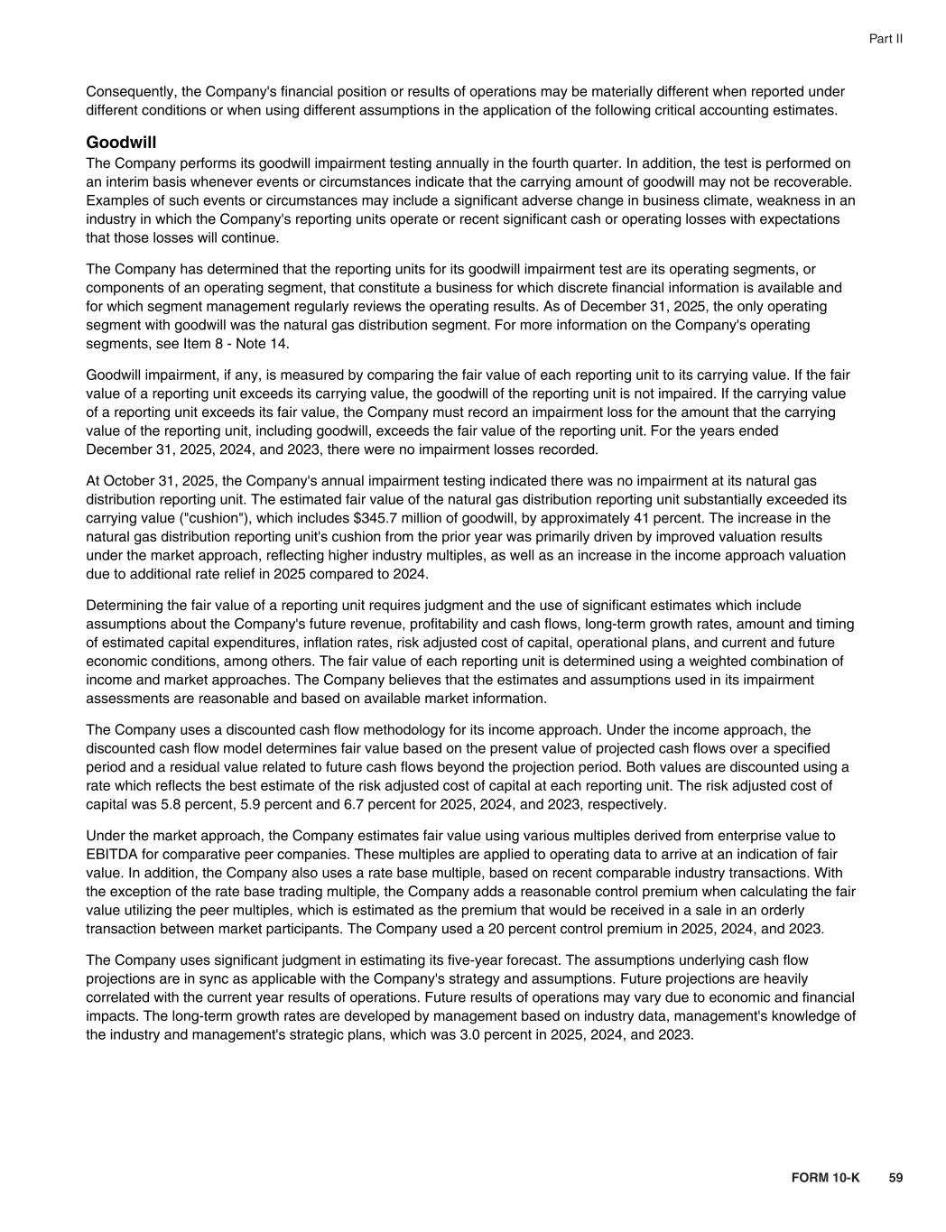Part II 59FORM 10-K Consequently, the Company's financial position or results of operations may be materially different when reported under different conditions or when using different assumptions in the application of the following critical accounting estimates. Goodwill The Company performs its goodwill impairment testing annually in the fourth quarter. In addition, the test is performed on an interim basis whenever events or circumstances indicate that the carrying amount of goodwill may not be recoverable. Examples of such events or circumstances may include a significant adverse change in business climate, weakness in an industry in which the Company's reporting units operate or recent significant cash or operating losses with expectations that those losses will continue. The Company has determined that the reporting units for its goodwill impairment test are its operating segments, or components of an operating segment, that constitute a business for which discrete financial information is available and for which segment management regularly reviews the operating results. As of December 31, 2025, the only operating segment with goodwill was the natural gas distribution segment. For more information on the Company's operating segments, see Item 8 - Note 14. Goodwill impairment, if any, is measured by comparing the fair value of each reporting unit to its carrying value. If the fair value of a reporting unit exceeds its carrying value, the goodwill of the reporting unit is not impaired. If the carrying value of a reporting unit exceeds its fair value, the Company must record an impairment loss for the amount that the carrying value of the reporting unit, including goodwill, exceeds the fair value of the reporting unit. For the years ended December 31, 2025, 2024, and 2023, there were no impairment losses recorded. At October 31, 2025, the Company's annual impairment testing indicated there was no impairment at its natural gas distribution reporting unit. The estimated fair value of the natural gas distribution reporting unit substantially exceeded its carrying value ("cushion"), which includes $345.7 million of goodwill, by approximately 41 percent. The increase in the natural gas distribution reporting unit's cushion from the prior year was primarily driven by improved valuation results under the market approach, reflecting higher industry multiples, as well as an increase in the income approach valuation due to additional rate relief in 2025 compared to 2024. Determining the fair value of a reporting unit requires judgment and the use of significant estimates which include assumptions about the Company's future revenue, profitability and cash flows, long-term growth rates, amount and timing of estimated capital expenditures, inflation rates, risk adjusted cost of capital, operational plans, and current and future economic conditions, among others. The fair value of each reporting unit is determined using a weighted combination of income and market approaches. The Company believes that the estimates and assumptions used in its impairment assessments are reasonable and based on available market information. The Company uses a discounted cash flow methodology for its income approach. Under the income approach, the discounted cash flow model determines fair value based on the present value of projected cash flows over a specified period and a residual value related to future cash flows beyond the projection period. Both values are discounted using a rate which reflects the best estimate of the risk adjusted cost of capital at each reporting unit. The risk adjusted cost of capital was 5.8 percent, 5.9 percent and 6.7 percent for 2025, 2024, and 2023, respectively. Under the market approach, the Company estimates fair value using various multiples derived from enterprise value to EBITDA for comparative peer companies. These multiples are applied to operating data to arrive at an indication of fair value. In addition, the Company also uses a rate base multiple, based on recent comparable industry transactions. With the exception of the rate base trading multiple, the Company adds a reasonable control premium when calculating the fair value utilizing the peer multiples, which is estimated as the premium that would be received in a sale in an orderly transaction between market participants. The Company used a 20 percent control premium in 2025, 2024, and 2023. The Company uses significant judgment in estimating its five-year forecast. The assumptions underlying cash flow projections are in sync as applicable with the Company's strategy and assumptions. Future projections are heavily correlated with the current year results of operations. Future results of operations may vary due to economic and financial impacts. The long-term growth rates are developed by management based on industry data, management's knowledge of the industry and management's strategic plans, which was 3.0 percent in 2025, 2024, and 2023. Index Part II MDU Resources Group, Inc. Form 10-K 59