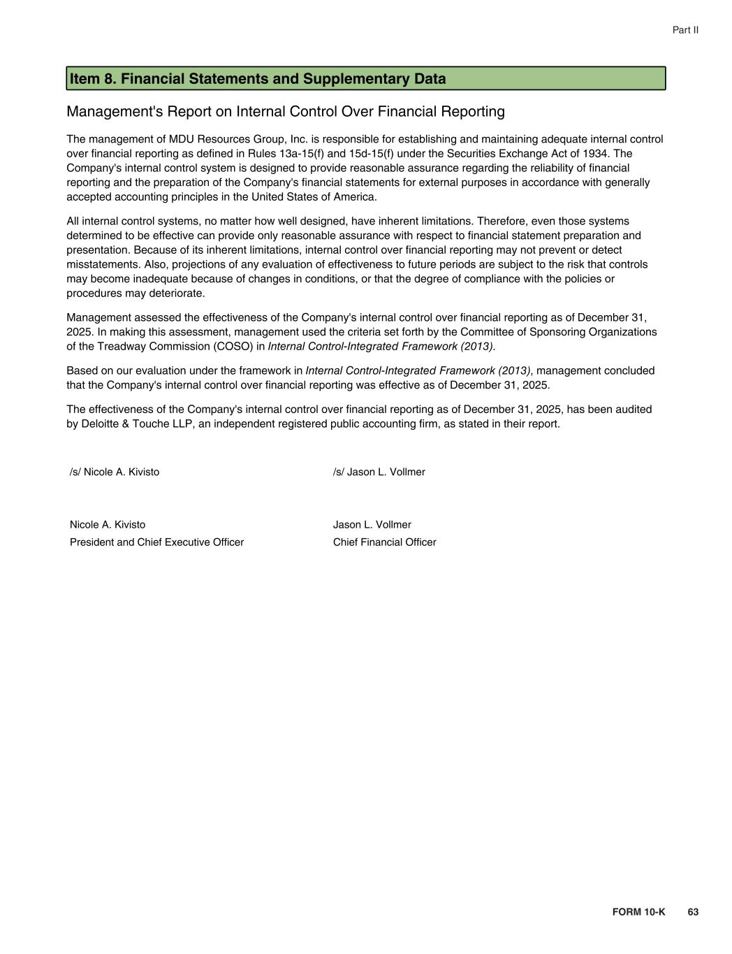 Part II 63FORM 10-K Item 8. Financial Statements and Supplementary Data Management's Report on Internal Control Over Financial Reporting The management of MDU Resources Group, Inc. is responsible for establishing and maintaining adequate internal control over financial reporting as defined in Rules 13a-15(f) and 15d-15(f) under the Securities Exchange Act of 1934. The Company's internal control system is designed to provide reasonable assurance regarding the reliability of financial reporting and the preparation of the Company's financial statements for external purposes in accordance with generally accepted accounting principles in the United States of America. All internal control systems, no matter how well designed, have inherent limitations. Therefore, even those systems determined to be effective can provide only reasonable assurance with respect to financial statement preparation and presentation. Because of its inherent limitations, internal control over financial reporting may not prevent or detect misstatements. Also, projections of any evaluation of effectiveness to future periods are subject to the risk that controls may become inadequate because of changes in conditions, or that the degree of compliance with the policies or procedures may deteriorate. Management assessed the effectiveness of the Company's internal control over financial reporting as of December 31, 2025. In making this assessment, management used the criteria set forth by the Committee of Sponsoring Organizations of the Treadway Commission (COSO) in Internal Control-Integrated Framework (2013). Based on our evaluation under the framework in Internal Control-Integrated Framework (2013), management concluded that the Company's internal control over financial reporting was effective as of December 31, 2025. The effectiveness of the Company's internal control over financial reporting as of December 31, 2025, has been audited by Deloitte & Touche LLP, an independent registered public accounting firm, as stated in their report. /s/ Nicole A. Kivisto /s/ Jason L. Vollmer Nicole A. Kivisto Jason L. Vollmer President and Chief Executive Officer Chief Financial Officer Index Part II MDU Resources Group, Inc. Form 10-K 63