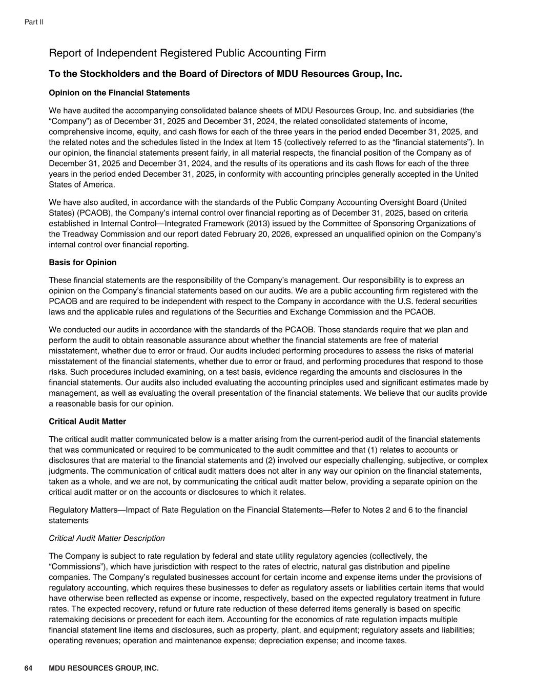 Part II MDU RESOURCES GROUP, INC.64 Report of Independent Registered Public Accounting Firm To the Stockholders and the Board of Directors of MDU Resources Group, Inc. Opinion on the Financial Statements We have audited the accompanying consolidated balance sheets of MDU Resources Group, Inc. and subsidiaries (the “Company”) as of December 31, 2025 and December 31, 2024, the related consolidated statements of income, comprehensive income, equity, and cash flows for each of the three years in the period ended December 31, 2025, and the related notes and the schedules listed in the Index at Item 15 (collectively referred to as the “financial statements”). In our opinion, the financial statements present fairly, in all material respects, the financial position of the Company as of December 31, 2025 and December 31, 2024, and the results of its operations and its cash flows for each of the three years in the period ended December 31, 2025, in conformity with accounting principles generally accepted in the United States of America. We have also audited, in accordance with the standards of the Public Company Accounting Oversight Board (United States) (PCAOB), the Company’s internal control over financial reporting as of December 31, 2025, based on criteria established in Internal Control—Integrated Framework (2013) issued by the Committee of Sponsoring Organizations of the Treadway Commission and our report dated February 20, 2026, expressed an unqualified opinion on the Company’s internal control over financial reporting. Basis for Opinion These financial statements are the responsibility of the Company’s management. Our responsibility is to express an opinion on the Company’s financial statements based on our audits. We are a public accounting firm registered with the PCAOB and are required to be independent with respect to the Company in accordance with the U.S. federal securities laws and the applicable rules and regulations of the Securities and Exchange Commission and the PCAOB. We conducted our audits in accordance with the standards of the PCAOB. Those standards require that we plan and perform the audit to obtain reasonable assurance about whether the financial statements are free of material misstatement, whether due to error or fraud. Our audits included performing procedures to assess the risks of material misstatement of the financial statements, whether due to error or fraud, and performing procedures that respond to those risks. Such procedures included examining, on a test basis, evidence regarding the amounts and disclosures in the financial statements. Our audits also included evaluating the accounting principles used and significant estimates made by management, as well as evaluating the overall presentation of the financial statements. We believe that our audits provide a reasonable basis for our opinion. Critical Audit Matter The critical audit matter communicated below is a matter arising from the current-period audit of the financial statements that was communicated or required to be communicated to the audit committee and that (1) relates to accounts or disclosures that are material to the financial statements and (2) involved our especially challenging, subjective, or complex judgments. The communication of critical audit matters does not alter in any way our opinion on the financial statements, taken as a whole, and we are not, by communicating the critical audit matter below, providing a separate opinion on the critical audit matter or on the accounts or disclosures to which it relates. Regulatory Matters—Impact of Rate Regulation on the Financial Statements—Refer to Notes 2 and 6 to the financial statements Critical Audit Matter Description The Company is subject to rate regulation by federal and state utility regulatory agencies (collectively, the “Commissions”), which have jurisdiction with respect to the rates of electric, natural gas distribution and pipeline companies. The Company’s regulated businesses account for certain income and expense items under the provisions of regulatory accounting, which requires these businesses to defer as regulatory assets or liabilities certain items that would have otherwise been reflected as expense or income, respectively, based on the expected regulatory treatment in future rates. The expected recovery, refund or future rate reduction of these deferred items generally is based on specific ratemaking decisions or precedent for each item. Accounting for the economics of rate regulation impacts multiple financial statement line items and disclosures, such as property, plant, and equipment; regulatory assets and liabilities; operating revenues; operation and maintenance expense; depreciation expense; and income taxes. Index Part II 64 MDU Resources Group, Inc. Form 10-K