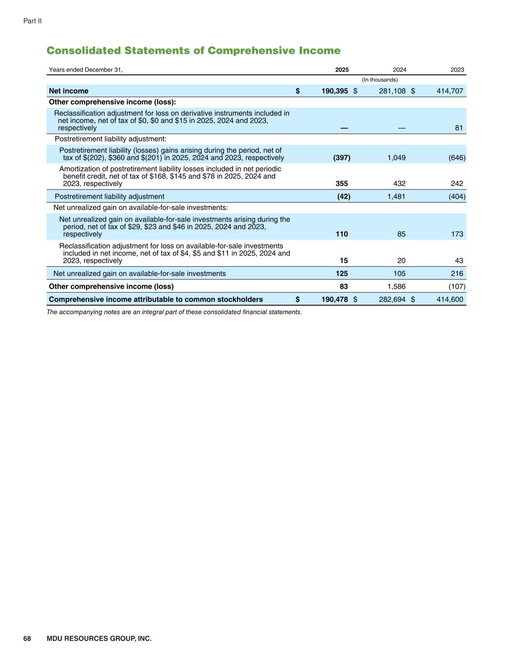 Part II MDU RESOURCES GROUP, INC.68 Consolidated Statements of Comprehensive Income Years ended December 31, 2025 2024 2023 (In thousands) Net income $ 190,395 $ 281,108 $ 414,707 Other comprehensive income (loss): Reclassification adjustment for loss on derivative instruments included in net income, net of tax of $0, $0 and $15 in 2025, 2024 and 2023, respectively — — 81 Postretirement liability adjustment: Postretirement liability (losses) gains arising during the period, net of tax of $(202), $360 and $(201) in 2025, 2024 and 2023, respectively (397) 1,049 (646) Amortization of postretirement liability losses included in net periodic benefit credit, net of tax of $168, $145 and $78 in 2025, 2024 and 2023, respectively 355 432 242 Postretirement liability adjustment (42) 1,481 (404) Net unrealized gain on available-for-sale investments: Net unrealized gain on available-for-sale investments arising during the period, net of tax of $29, $23 and $46 in 2025, 2024 and 2023, respectively 110 85 173 Reclassification adjustment for loss on available-for-sale investments included in net income, net of tax of $4, $5 and $11 in 2025, 2024 and 2023, respectively 15 20 43 Net unrealized gain on available-for-sale investments 125 105 216 Other comprehensive income (loss) 83 1,586 (107) Comprehensive income attributable to common stockholders $ 190,478 $ 282,694 $ 414,600 The accompanying notes are an integral part of these consolidated financial statements. Index Part II 68 MDU Resources Group, Inc. Form 10-K