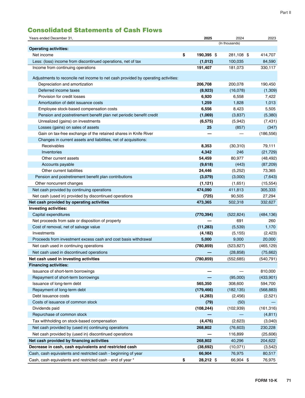 Part II 71FORM 10-K Consolidated Statements of Cash Flows Years ended December 31, 2025 2024 2023 (In thousands) Operating activities: Net income $ 190,395 $ 281,108 $ 414,707 Less: (loss) income from discontinued operations, net of tax (1,012) 100,035 84,590 Income from continuing operations 191,407 181,073 330,117 Adjustments to reconcile net income to net cash provided by operating activities: Depreciation and amortization 206,708 200,078 190,450 Deferred income taxes (8,923) (16,078) (1,309) Provision for credit losses 6,920 6,558 7,422 Amortization of debt issuance costs 1,259 1,828 1,013 Employee stock-based compensation costs 6,556 8,423 5,505 Pension and postretirement benefit plan net periodic benefit credit (1,069) (3,837) (5,380) Unrealized (gains) on investments (6,575) (5,942) (7,431) Losses (gains) on sales of assets 25 (857) (347) Gain on tax-free exchange of the retained shares in Knife River — — (186,556) Changes in current assets and liabilities, net of acquisitions: Receivables 8,353 (30,310) 79,111 Inventories 4,342 246 (21,729) Other current assets 54,459 80,977 (48,492) Accounts payable (9,618) (443) (87,209) Other current liabilities 24,446 (5,252) 73,365 Pension and postretirement benefit plan contributions (3,079) (3,000) (7,643) Other noncurrent changes (1,121) (1,651) (15,554) Net cash provided by continuing operations 474,090 411,813 305,333 Net cash (used in) provided by discontinued operations (725) 90,505 27,294 Net cash provided by operating activities 473,365 502,318 332,627 Investing activities: Capital expenditures (770,394) (522,824) (484,136) Net proceeds from sale or disposition of property — 691 260 Cost of removal, net of salvage value (11,283) (5,539) 1,170 Investments (4,182) (5,155) (2,423) Proceeds from investment excess cash and cost basis withdrawal 5,000 9,000 20,000 Net cash used in continuing operations (780,859) (523,827) (465,129) Net cash used in discontinued operations — (28,858) (75,662) Net cash used in investing activities (780,859) (552,685) (540,791) Financing activities: Issuance of short-term borrowings — — 810,000 Repayment of short-term borrowings — (95,000) (433,901) Issuance of long-term debt 565,350 308,600 594,700 Repayment of long-term debt (179,466) (182,135) (568,883) Debt issuance costs (4,283) (2,456) (2,521) Costs of issuance of common stock (79) (50) — Dividends paid (108,244) (102,939) (161,316) Repurchase of common stock — — (4,811) Tax withholding on stock-based compensation (4,476) (2,623) (3,040) Net cash provided by (used in) continuing operations 268,802 (76,603) 230,228 Net cash provided by (used in) discontinued operations — 116,899 (25,606) Net cash provided by financing activities 268,802 40,296 204,622 Decrease in cash, cash equivalents and restricted cash (38,692) (10,071) (3,542) Cash, cash equivalents and restricted cash - beginning of year 66,904 76,975 80,517 Cash, cash equivalents and restricted cash - end of year * $ 28,212 $ 66,904 $ 76,975 Index Part II MDU Resources Group, Inc. Form 10-K 71
