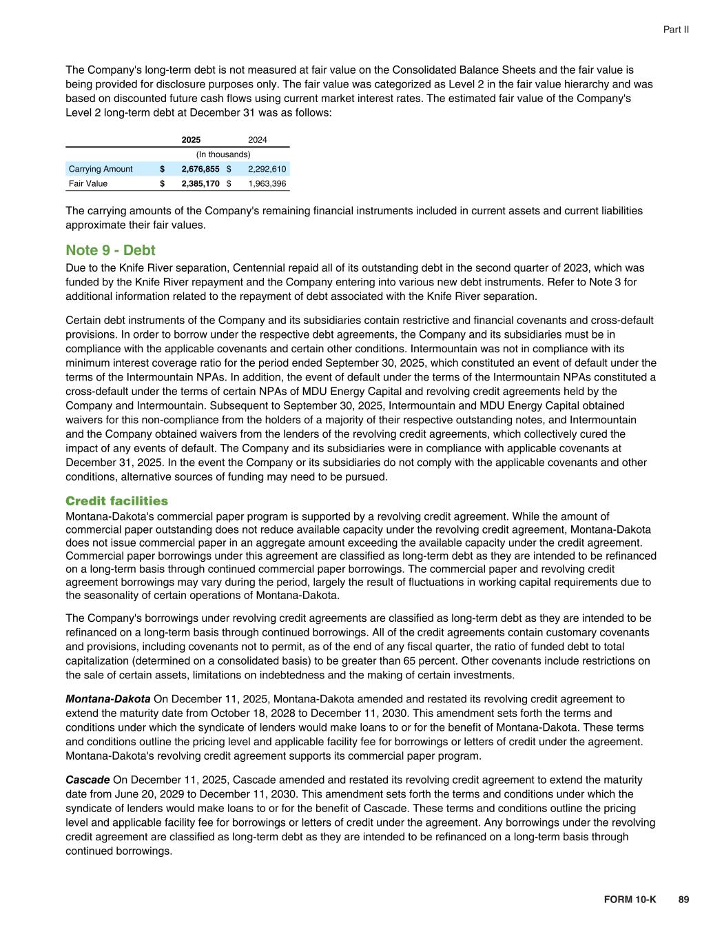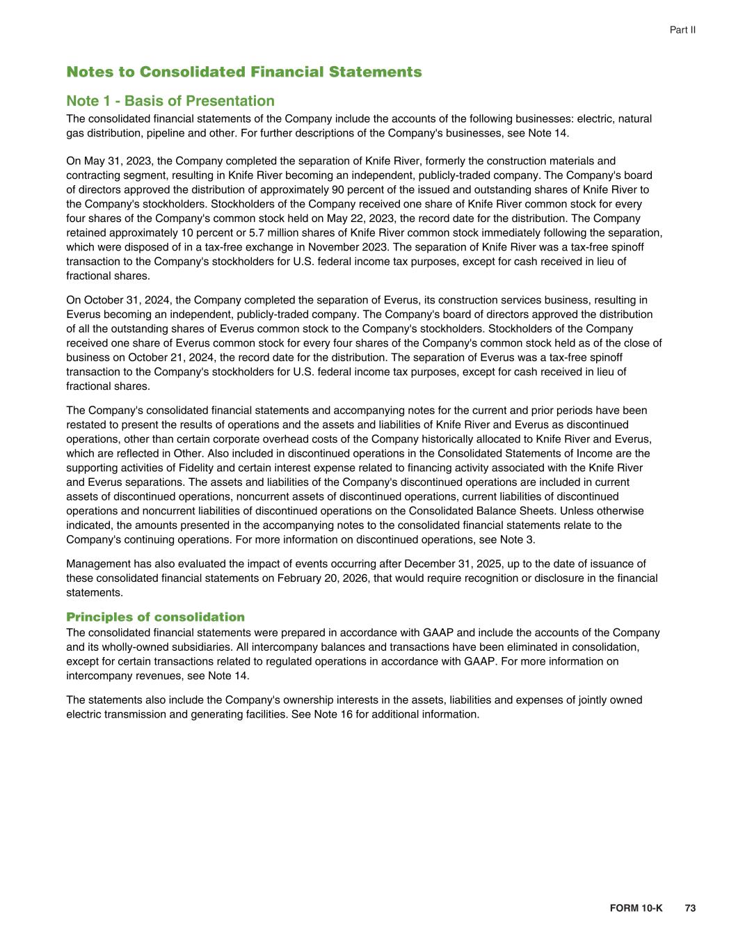 Part II 73FORM 10-K Notes to Consolidated Financial Statements Note 1 - Basis of Presentation The consolidated financial statements of the Company include the accounts of the following businesses: electric, natural gas distribution, pipeline and other. For further descriptions of the Company's businesses, see Note 14. On May 31, 2023, the Company completed the separation of Knife River, formerly the construction materials and contracting segment, resulting in Knife River becoming an independent, publicly-traded company. The Company's board of directors approved the distribution of approximately 90 percent of the issued and outstanding shares of Knife River to the Company's stockholders. Stockholders of the Company received one share of Knife River common stock for every four shares of the Company's common stock held on May 22, 2023, the record date for the distribution. The Company retained approximately 10 percent or 5.7 million shares of Knife River common stock immediately following the separation, which were disposed of in a tax-free exchange in November 2023. The separation of Knife River was a tax-free spinoff transaction to the Company's stockholders for U.S. federal income tax purposes, except for cash received in lieu of fractional shares. On October 31, 2024, the Company completed the separation of Everus, its construction services business, resulting in Everus becoming an independent, publicly-traded company. The Company's board of directors approved the distribution of all the outstanding shares of Everus common stock to the Company's stockholders. Stockholders of the Company received one share of Everus common stock for every four shares of the Company's common stock held as of the close of business on October 21, 2024, the record date for the distribution. The separation of Everus was a tax-free spinoff transaction to the Company's stockholders for U.S. federal income tax purposes, except for cash received in lieu of fractional shares. The Company's consolidated financial statements and accompanying notes for the current and prior periods have been restated to present the results of operations and the assets and liabilities of Knife River and Everus as discontinued operations, other than certain corporate overhead costs of the Company historically allocated to Knife River and Everus, which are reflected in Other. Also included in discontinued operations in the Consolidated Statements of Income are the supporting activities of Fidelity and certain interest expense related to financing activity associated with the Knife River and Everus separations. The assets and liabilities of the Company's discontinued operations are included in current assets of discontinued operations, noncurrent assets of discontinued operations, current liabilities of discontinued operations and noncurrent liabilities of discontinued operations on the Consolidated Balance Sheets. Unless otherwise indicated, the amounts presented in the accompanying notes to the consolidated financial statements relate to the Company's continuing operations. For more information on discontinued operations, see Note 3. Management has also evaluated the impact of events occurring after December 31, 2025, up to the date of issuance of these consolidated financial statements on February 20, 2026, that would require recognition or disclosure in the financial statements. Principles of consolidation The consolidated financial statements were prepared in accordance with GAAP and include the accounts of the Company and its wholly-owned subsidiaries. All intercompany balances and transactions have been eliminated in consolidation, except for certain transactions related to regulated operations in accordance with GAAP. For more information on intercompany revenues, see Note 14. The statements also include the Company's ownership interests in the assets, liabilities and expenses of jointly owned electric transmission and generating facilities. See Note 16 for additional information. Index Part II MDU Resources Group, Inc. Form 10-K 73