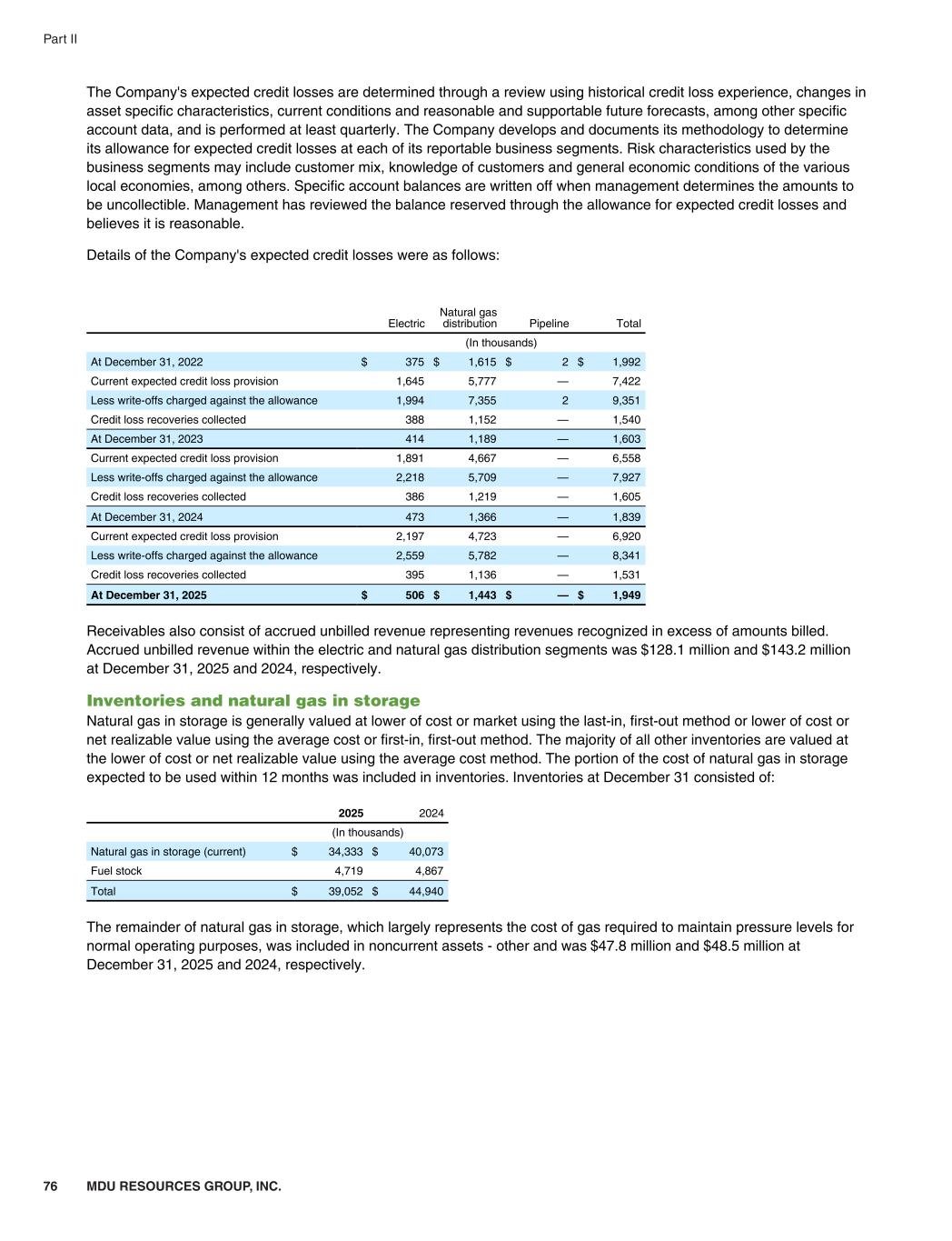 Part II MDU RESOURCES GROUP, INC.76 The Company's expected credit losses are determined through a review using historical credit loss experience, changes in asset specific characteristics, current conditions and reasonable and supportable future forecasts, among other specific account data, and is performed at least quarterly. The Company develops and documents its methodology to determine its allowance for expected credit losses at each of its reportable business segments. Risk characteristics used by the business segments may include customer mix, knowledge of customers and general economic conditions of the various local economies, among others. Specific account balances are written off when management determines the amounts to be uncollectible. Management has reviewed the balance reserved through the allowance for expected credit losses and believes it is reasonable. Details of the Company's expected credit losses were as follows: Electric Natural gas distribution Pipeline Total (In thousands) At December 31, 2022 $ 375 $ 1,615 $ 2 $ 1,992 Current expected credit loss provision 1,645 5,777 — 7,422 Less write-offs charged against the allowance 1,994 7,355 2 9,351 Credit loss recoveries collected 388 1,152 — 1,540 At December 31, 2023 414 1,189 — 1,603 Current expected credit loss provision 1,891 4,667 — 6,558 Less write-offs charged against the allowance 2,218 5,709 — 7,927 Credit loss recoveries collected 386 1,219 — 1,605 At December 31, 2024 473 1,366 — 1,839 Current expected credit loss provision 2,197 4,723 — 6,920 Less write-offs charged against the allowance 2,559 5,782 — 8,341 Credit loss recoveries collected 395 1,136 — 1,531 At December 31, 2025 $ 506 $ 1,443 $ — $ 1,949 Receivables also consist of accrued unbilled revenue representing revenues recognized in excess of amounts billed. Accrued unbilled revenue within the electric and natural gas distribution segments was $128.1 million and $143.2 million at December 31, 2025 and 2024, respectively. Inventories and natural gas in storage Natural gas in storage is generally valued at lower of cost or market using the last-in, first-out method or lower of cost or net realizable value using the average cost or first-in, first-out method. The majority of all other inventories are valued at the lower of cost or net realizable value using the average cost method. The portion of the cost of natural gas in storage expected to be used within 12 months was included in inventories. Inventories at December 31 consisted of: 2025 2024 (In thousands) Natural gas in storage (current) $ 34,333 $ 40,073 Fuel stock 4,719 4,867 Total $ 39,052 $ 44,940 The remainder of natural gas in storage, which largely represents the cost of gas required to maintain pressure levels for normal operating purposes, was included in noncurrent assets - other and was $47.8 million and $48.5 million at December 31, 2025 and 2024, respectively. Index Part II 76 MDU Resources Group, Inc. Form 10-K