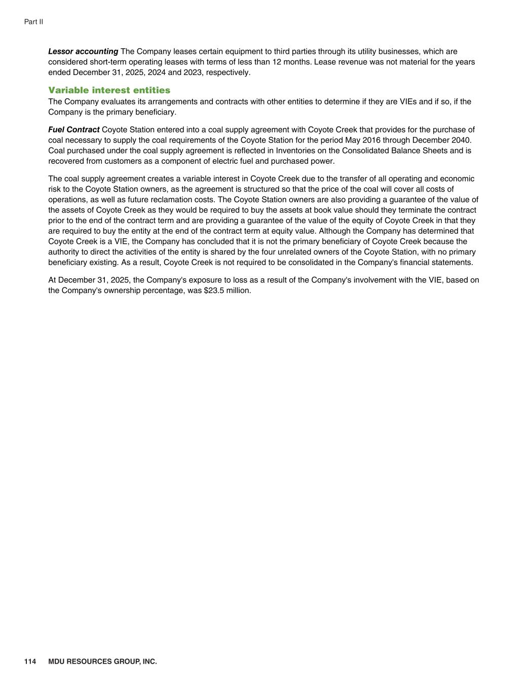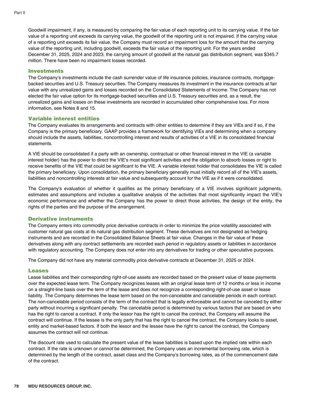 Part II MDU RESOURCES GROUP, INC.78 Goodwill impairment, if any, is measured by comparing the fair value of each reporting unit to its carrying value. If the fair value of a reporting unit exceeds its carrying value, the goodwill of the reporting unit is not impaired. If the carrying value of a reporting unit exceeds its fair value, the Company must record an impairment loss for the amount that the carrying value of the reporting unit, including goodwill, exceeds the fair value of the reporting unit. For the years ended December 31, 2025, 2024 and 2023, the carrying amount of goodwill at the natural gas distribution segment, was $345.7 million. There have been no impairment losses recorded. Investments The Company's investments include the cash surrender value of life insurance policies, insurance contracts, mortgage- backed securities and U.S. Treasury securities. The Company measures its investment in the insurance contracts at fair value with any unrealized gains and losses recorded on the Consolidated Statements of Income. The Company has not elected the fair value option for its mortgage-backed securities and U.S. Treasury securities and, as a result, the unrealized gains and losses on these investments are recorded in accumulated other comprehensive loss. For more information, see Notes 8 and 15. Variable interest entities The Company evaluates its arrangements and contracts with other entities to determine if they are VIEs and if so, if the Company is the primary beneficiary. GAAP provides a framework for identifying VIEs and determining when a company should include the assets, liabilities, noncontrolling interest and results of activities of a VIE in its consolidated financial statements. A VIE should be consolidated if a party with an ownership, contractual or other financial interest in the VIE (a variable interest holder) has the power to direct the VIE's most significant activities and the obligation to absorb losses or right to receive benefits of the VIE that could be significant to the VIE. A variable interest holder that consolidates the VIE is called the primary beneficiary. Upon consolidation, the primary beneficiary generally must initially record all of the VIE's assets, liabilities and noncontrolling interests at fair value and subsequently account for the VIE as if it were consolidated. The Company's evaluation of whether it qualifies as the primary beneficiary of a VIE involves significant judgments, estimates and assumptions and includes a qualitative analysis of the activities that most significantly impact the VIE's economic performance and whether the Company has the power to direct those activities, the design of the entity, the rights of the parties and the purpose of the arrangement. Derivative instruments The Company enters into commodity price derivative contracts in order to minimize the price volatility associated with customer natural gas costs at its natural gas distribution segment. These derivatives are not designated as hedging instruments and are recorded in the Consolidated Balance Sheets at fair value. Changes in the fair value of these derivatives along with any contract settlements are recorded each period in regulatory assets or liabilities in accordance with regulatory accounting. The Company does not enter into any derivatives for trading or other speculative purposes. The Company did not have any material commodity price derivative contracts at December 31, 2025 or 2024. Leases Lease liabilities and their corresponding right-of-use assets are recorded based on the present value of lease payments over the expected lease term. The Company recognizes leases with an original lease term of 12 months or less in income on a straight-line basis over the term of the lease and does not recognize a corresponding right-of-use asset or lease liability. The Company determines the lease term based on the non-cancelable and cancelable periods in each contract. The non-cancelable period consists of the term of the contract that is legally enforceable and cannot be canceled by either party without incurring a significant penalty. The cancelable period is determined by various factors that are based on who has the right to cancel a contract. If only the lessor has the right to cancel the contract, the Company will assume the contract will continue. If the lessee is the only party that has the right to cancel the contract, the Company looks to asset, entity and market-based factors. If both the lessor and the lessee have the right to cancel the contract, the Company assumes the contract will not continue. The discount rate used to calculate the present value of the lease liabilities is based upon the implied rate within each contract. If the rate is unknown or cannot be determined, the Company uses an incremental borrowing rate, which is determined by the length of the contract, asset class and the Company's borrowing rates, as of the commencement date of the contract. Index Part II 78 MDU Resources Group, Inc. Form 10-K