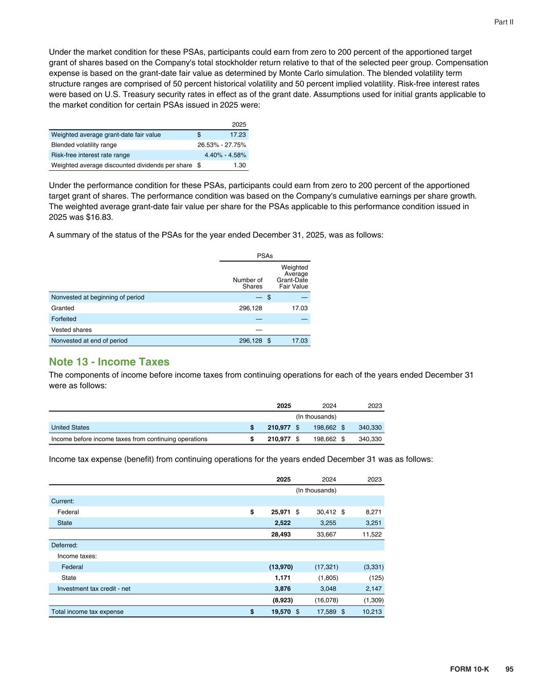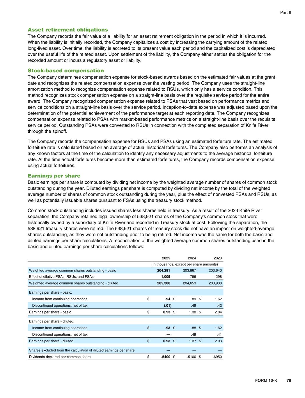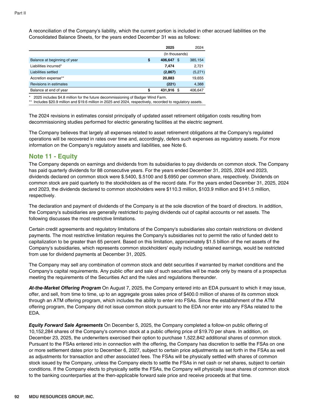 Part II 79FORM 10-K Asset retirement obligations The Company records the fair value of a liability for an asset retirement obligation in the period in which it is incurred. When the liability is initially recorded, the Company capitalizes a cost by increasing the carrying amount of the related long-lived asset. Over time, the liability is accreted to its present value each period and the capitalized cost is depreciated over the useful life of the related asset. Upon settlement of the liability, the Company either settles the obligation for the recorded amount or incurs a regulatory asset or liability. Stock-based compensation The Company determines compensation expense for stock-based awards based on the estimated fair values at the grant date and recognizes the related compensation expense over the vesting period. The Company uses the straight-line amortization method to recognize compensation expense related to RSUs, which only has a service condition. This method recognizes stock compensation expense on a straight-line basis over the requisite service period for the entire award. The Company recognized compensation expense related to PSAs that vest based on performance metrics and service conditions on a straight-line basis over the service period. Inception-to-date expense was adjusted based upon the determination of the potential achievement of the performance target at each reporting date. The Company recognizes compensation expense related to PSAs with market-based performance metrics on a straight-line basis over the requisite service period. Outstanding PSAs were converted to RSUs in connection with the completed separation of Knife River through the spinoff. The Company records the compensation expense for RSUs and PSAs using an estimated forfeiture rate. The estimated forfeiture rate is calculated based on an average of actual historical forfeitures. The Company also performs an analysis of any known factors at the time of the calculation to identify any necessary adjustments to the average historical forfeiture rate. At the time actual forfeitures become more than estimated forfeitures, the Company records compensation expense using actual forfeitures. Earnings per share Basic earnings per share is computed by dividing net income by the weighted average number of shares of common stock outstanding during the year. Diluted earnings per share is computed by dividing net income by the total of the weighted average number of shares of common stock outstanding during the year, plus the effect of nonvested PSAs and RSUs, as well as potentially issuable shares pursuant to FSAs using the treasury stock method. Common stock outstanding includes issued shares less shares held in treasury. As a result of the 2023 Knife River separation, the Company retained legal ownership of 538,921 shares of the Company's common stock that were historically owned by a subsidiary of Knife River and recorded in Treasury stock at cost. Following the separation, the 538,921 treasury shares were retired. The 538,921 shares of treasury stock did not have an impact on weighted-average shares outstanding, as they were not outstanding prior to being retired. Net income was the same for both the basic and diluted earnings per share calculations. A reconciliation of the weighted average common shares outstanding used in the basic and diluted earnings per share calculations follows: 2025 2024 2023 (In thousands, except per share amounts) Weighted average common shares outstanding - basic 204,291 203,867 203,640 Effect of dilutive PSAs, RSUs, and FSAs 1,009 786 298 Weighted average common shares outstanding - diluted 205,300 204,653 203,938 Earnings per share - basic: Income from continuing operations $ .94 $ .89 $ 1.62 Discontinued operations, net of tax (.01) .49 .42 Earnings per share - basic $ 0.93 $ 1.38 $ 2.04 Earnings per share - diluted: Income from continuing operations $ .93 $ .88 $ 1.62 Discontinued operations, net of tax — .49 .41 Earnings per share - diluted $ 0.93 $ 1.37 $ 2.03 Shares excluded from the calculation of diluted earnings per share — — — Dividends declared per common share $ .5400 $ .5100 $ .6950 Index Part II MDU Resources Group, Inc. Form 10-K 79
