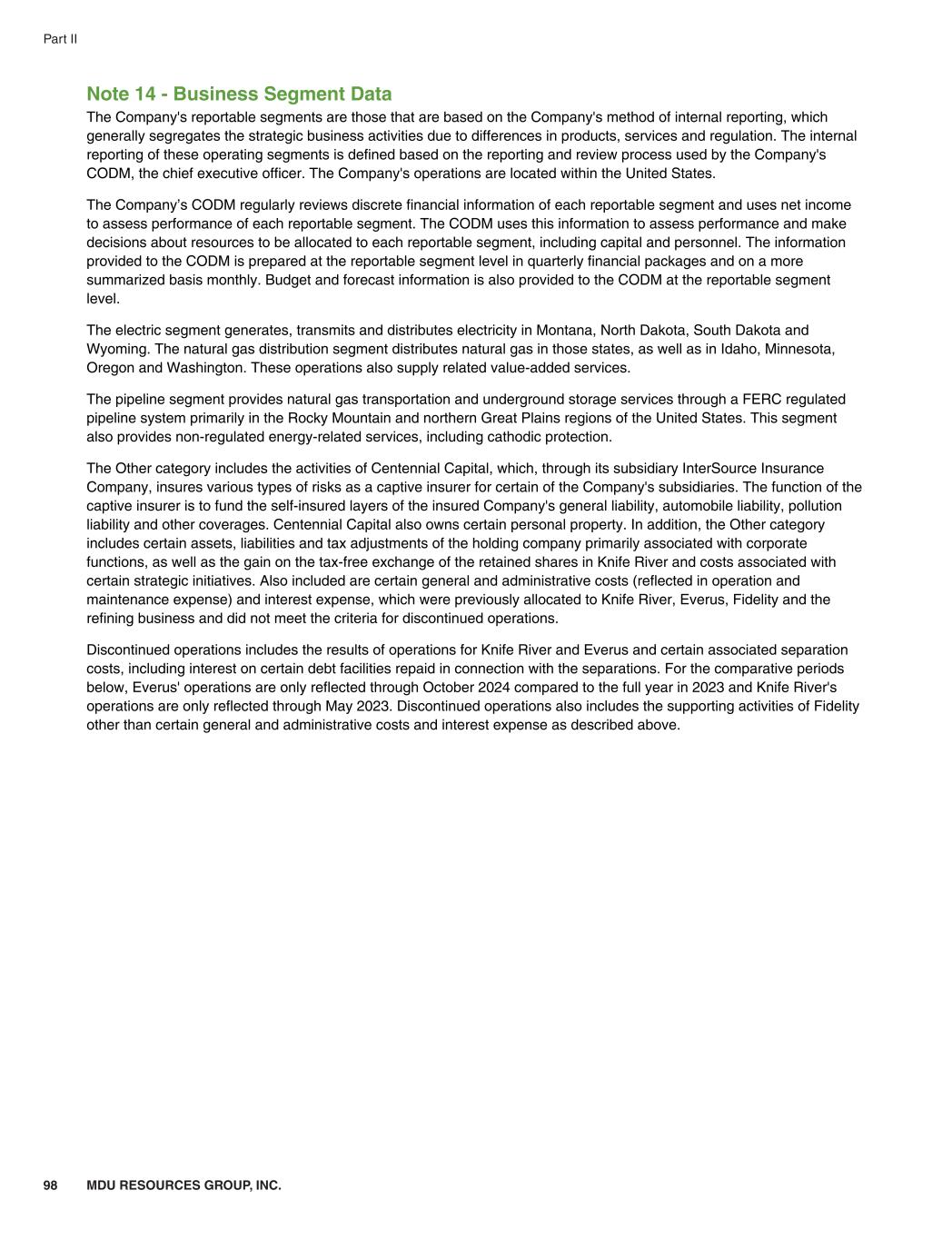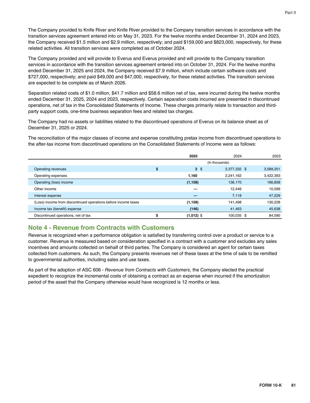 Part II 81FORM 10-K The Company provided to Knife River and Knife River provided to the Company transition services in accordance with the transition services agreement entered into on May 31, 2023. For the twelve months ended December 31, 2024 and 2023, the Company received $1.5 million and $2.9 million, respectively; and paid $159,000 and $823,000, respectively, for these related activities. All transition services were completed as of October 2024. The Company provided and will provide to Everus and Everus provided and will provide to the Company transition services in accordance with the transition services agreement entered into on October 31, 2024. For the twelve months ended December 31, 2025 and 2024, the Company received $7.9 million, which include certain software costs and $727,000, respectively; and paid $49,000 and $47,000, respectively, for these related activities. The transition services are expected to be complete as of March 2026. Separation related costs of $1.0 million, $41.7 million and $58.6 million net of tax, were incurred during the twelve months ended December 31, 2025, 2024 and 2023, respectively. Certain separation costs incurred are presented in discontinued operations, net of tax in the Consolidated Statements of Income. These charges primarily relate to transaction and third- party support costs, one-time business separation fees and related tax charges. The Company had no assets or liabilities related to the discontinued operations of Everus on its balance sheet as of December 31, 2025 or 2024. The reconciliation of the major classes of income and expense constituting pretax income from discontinued operations to the after-tax income from discontinued operations on the Consolidated Statements of Income were as follows: 2025 2024 2023 (In thousands) Operating revenues $ 2 $ 2,377,332 $ 3,589,251 Operating expenses 1,160 2,241,162 3,422,393 Operating (loss) income (1,158) 136,170 166,858 Other income — 12,446 10,599 Interest expense — 7,118 47,229 (Loss) income from discontinued operations before income taxes (1,158) 141,498 130,228 Income tax (benefit) expense (146) 41,463 45,638 Discontinued operations, net of tax $ (1,012) $ 100,035 $ 84,590 Note 4 - Revenue from Contracts with Customers Revenue is recognized when a performance obligation is satisfied by transferring control over a product or service to a customer. Revenue is measured based on consideration specified in a contract with a customer and excludes any sales incentives and amounts collected on behalf of third parties. The Company is considered an agent for certain taxes collected from customers. As such, the Company presents revenues net of these taxes at the time of sale to be remitted to governmental authorities, including sales and use taxes. As part of the adoption of ASC 606 - Revenue from Contracts with Customers, the Company elected the practical expedient to recognize the incremental costs of obtaining a contract as an expense when incurred if the amortization period of the asset that the Company otherwise would have recognized is 12 months or less. Index Part II MDU Resources Group, Inc. Form 10-K 81