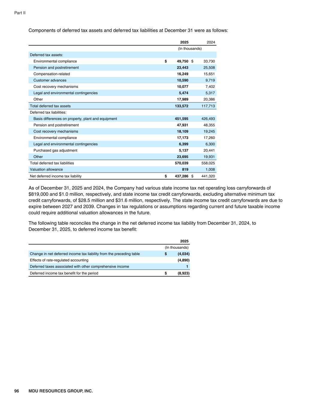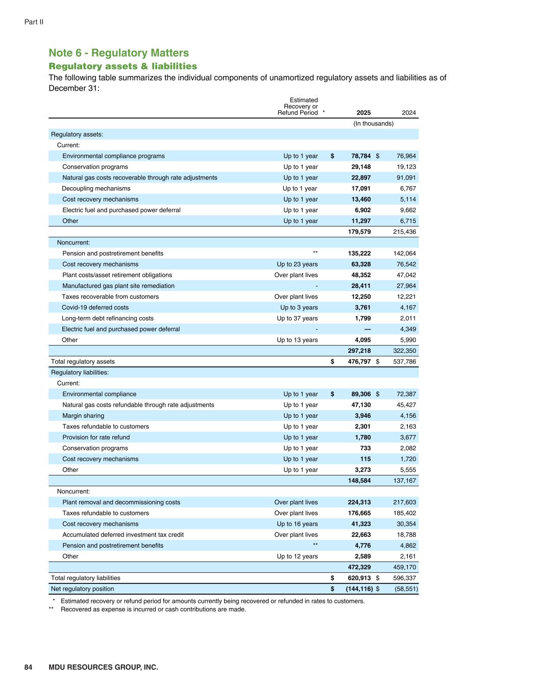 Part II MDU RESOURCES GROUP, INC.84 Note 6 - Regulatory Matters Regulatory assets & liabilities The following table summarizes the individual components of unamortized regulatory assets and liabilities as of December 31: Estimated Recovery or Refund Period * 2025 2024 (In thousands) Regulatory assets: Current: Environmental compliance programs Up to 1 year $ 78,784 $ 76,964 Conservation programs Up to 1 year 29,148 19,123 Natural gas costs recoverable through rate adjustments Up to 1 year 22,897 91,091 Decoupling mechanisms Up to 1 year 17,091 6,767 Cost recovery mechanisms Up to 1 year 13,460 5,114 Electric fuel and purchased power deferral Up to 1 year 6,902 9,662 Other Up to 1 year 11,297 6,715 179,579 215,436 Noncurrent: Pension and postretirement benefits ** 135,222 142,064 Cost recovery mechanisms Up to 23 years 63,328 76,542 Plant costs/asset retirement obligations Over plant lives 48,352 47,042 Manufactured gas plant site remediation - 28,411 27,964 Taxes recoverable from customers Over plant lives 12,250 12,221 Covid-19 deferred costs Up to 3 years 3,761 4,167 Long-term debt refinancing costs Up to 37 years 1,799 2,011 Electric fuel and purchased power deferral - — 4,349 Other Up to 13 years 4,095 5,990 297,218 322,350 Total regulatory assets $ 476,797 $ 537,786 Regulatory liabilities: Current: Environmental compliance Up to 1 year $ 89,306 $ 72,387 Natural gas costs refundable through rate adjustments Up to 1 year 47,130 45,427 Margin sharing Up to 1 year 3,946 4,156 Taxes refundable to customers Up to 1 year 2,301 2,163 Provision for rate refund Up to 1 year 1,780 3,677 Conservation programs Up to 1 year 733 2,082 Cost recovery mechanisms Up to 1 year 115 1,720 Other Up to 1 year 3,273 5,555 148,584 137,167 Noncurrent: Plant removal and decommissioning costs Over plant lives 224,313 217,603 Taxes refundable to customers Over plant lives 176,665 185,402 Cost recovery mechanisms Up to 16 years 41,323 30,354 Accumulated deferred investment tax credit Over plant lives 22,663 18,788 Pension and postretirement benefits ** 4,776 4,862 Other Up to 12 years 2,589 2,161 472,329 459,170 Total regulatory liabilities $ 620,913 $ 596,337 Net regulatory position $ (144,116) $ (58,551) * Estimated recovery or refund period for amounts currently being recovered or refunded in rates to customers. ** Recovered as expense is incurred or cash contributions are made. Index Part II 84 MDU Resources Group, Inc. Form 10-K