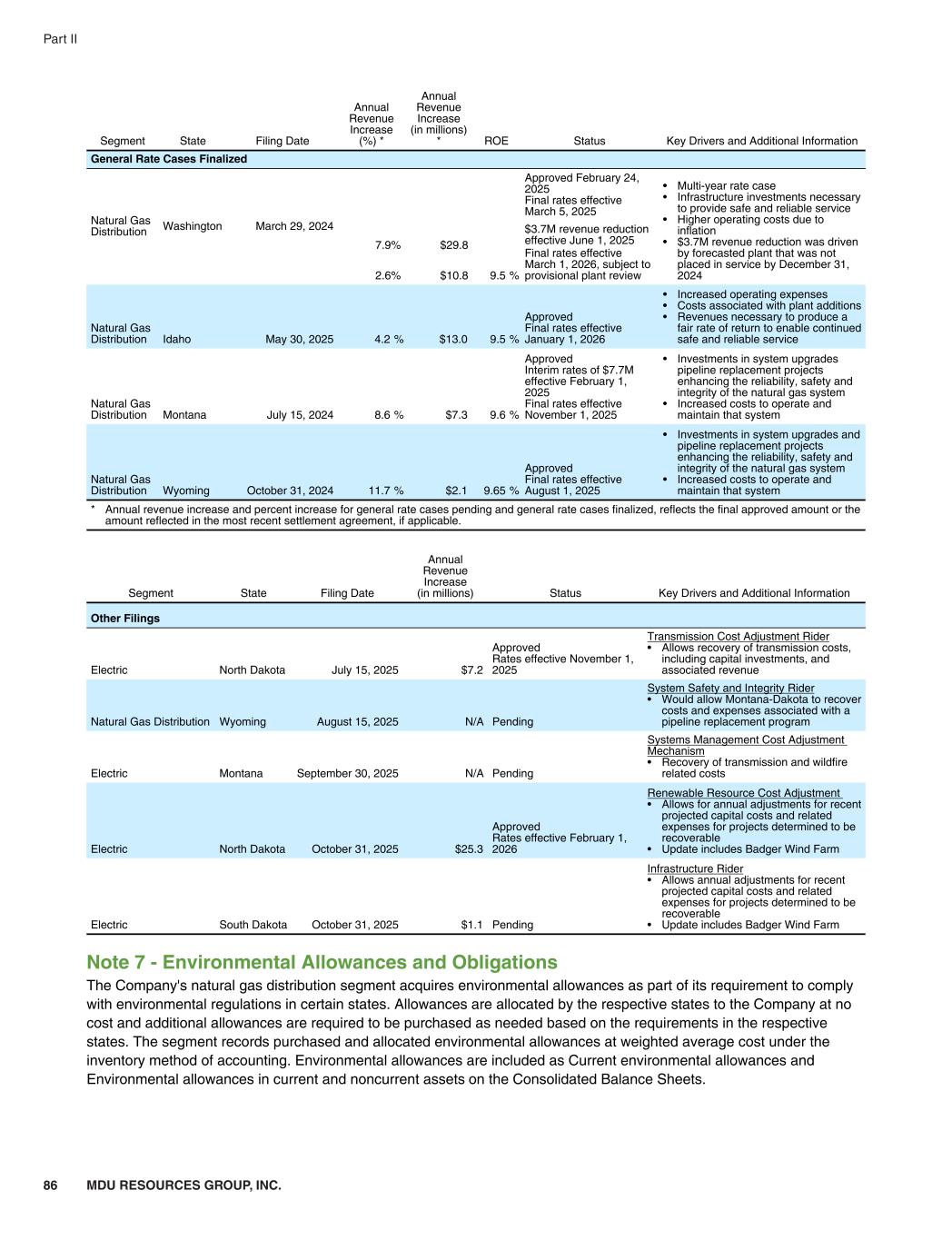 Part II 85FORM 10-K As of December 31, 2025 and 2024, approximately $174.3 million and $181.2 million, respectively, of regulatory assets were not earning a rate of return but are expected to be recovered from customers in future rates. These assets are largely comprised of the unfunded portion of pension and postretirement benefits, asset retirement obligations, certain pipeline integrity costs and the estimated future cost of manufactured gas plant site remediation. The Company is subject to environmental compliance regulations in certain states which require natural gas distribution companies to reduce overall GHG emissions to certain thresholds as established by each applicable state. Compliance with these standards may be achieved through increased energy efficiency and conservation measures, purchased emission allowances and offsets and purchases of low carbon fuels. Emission allowances are allocated by the respective states to the Company at no cost, of which a portion is required to be sold at auction. The compliance costs for these regulations and the revenues from the sale of the allocated emissions allowances are passed through to customers in rates and the Company has, accordingly, deferred the environmental compliance costs as a regulatory asset and proceeds from the sale of allowances as a regulatory liability. If, for any reason, the Company's regulated businesses cease to meet the criteria for application of regulatory accounting for all or part of their operations, the regulatory assets and liabilities relating to those portions ceasing to meet such criteria would be written off and included in the statement of income or accumulated other comprehensive loss in the period in which the discontinuance of regulatory accounting occurs. Regulatory proceedings The Company regularly reviews the need for electric and natural gas rate changes in each of the jurisdictions in which service is provided. The Company files for rate adjustments to seek recovery of operating costs and capital investments, as well as reasonable returns as allowed by regulators. Certain regulatory proceedings and cases may also contain recurring mechanisms that can have an annual true-up. Examples of these recurring mechanisms include: infrastructure riders, transmission trackers, renewable resource cost adjustment riders, as well as weather normalization and decoupling mechanisms. The Company is unable to predict the ultimate outcome of these matters, the timing of final decisions of the various regulators and courts, or the effect on the Company's results of operations, financial position or cash flows. The following table summarizes the Company's significant regulatory proceedings and cases by jurisdiction: General Rate Cases Pending Electric Wyoming June 30, 2025 18.6 % $5.8 9.7 % Settlement agreement filed January 23, 2026 Final rates requested to be effective April 1, 2026 • Increases in operation and maintenance expense • Investments made since the last rate case • Corresponding depreciation on those infrastructure investments • Settlement includes a stipulation to withdraw the requested Reliability and Safety Rider Electric Montana September 30, 2025 20.2 % $14.1 10.8 % Pending • Investments, including Badger Wind Farm • Corresponding depreciation on those investments • Increased operation and maintenance expense Natural Gas Distribution Oregon November 25, 2025 15.8 % $16.4 10.4 % Pending • Rate base growth • Growth in operations and maintenance expense • Growth in depreciation expense associated with new investments in rate base Segment State Filing Date Annual Revenue Increase (%) * Annual Revenue Increase (in millions) * ROE Status Key Drivers and Additional Information Index Part II MDU Resources Group, Inc. Form 10-K 85