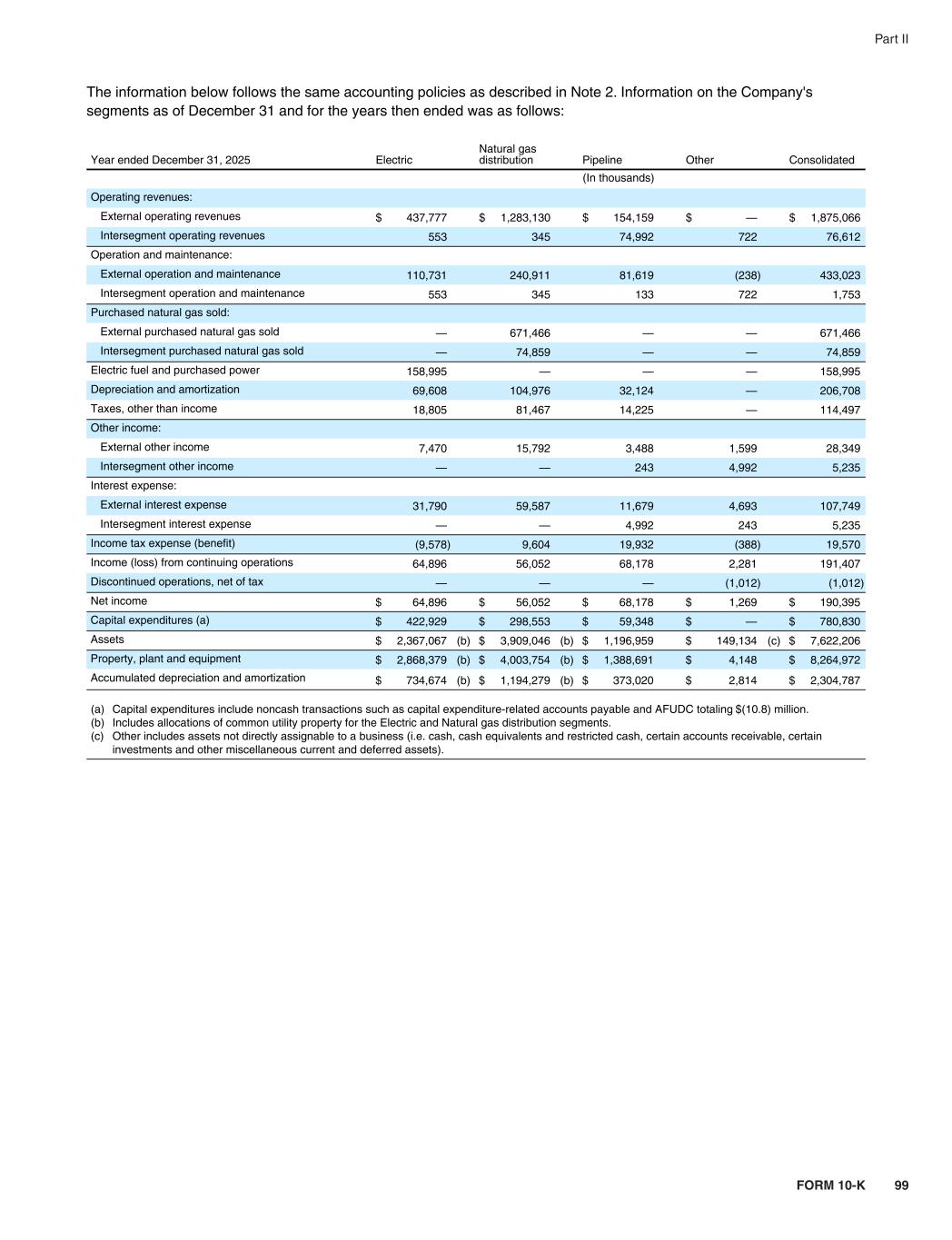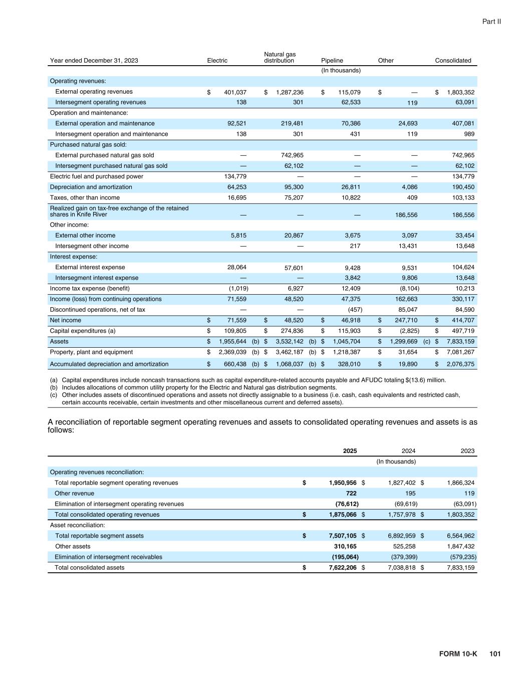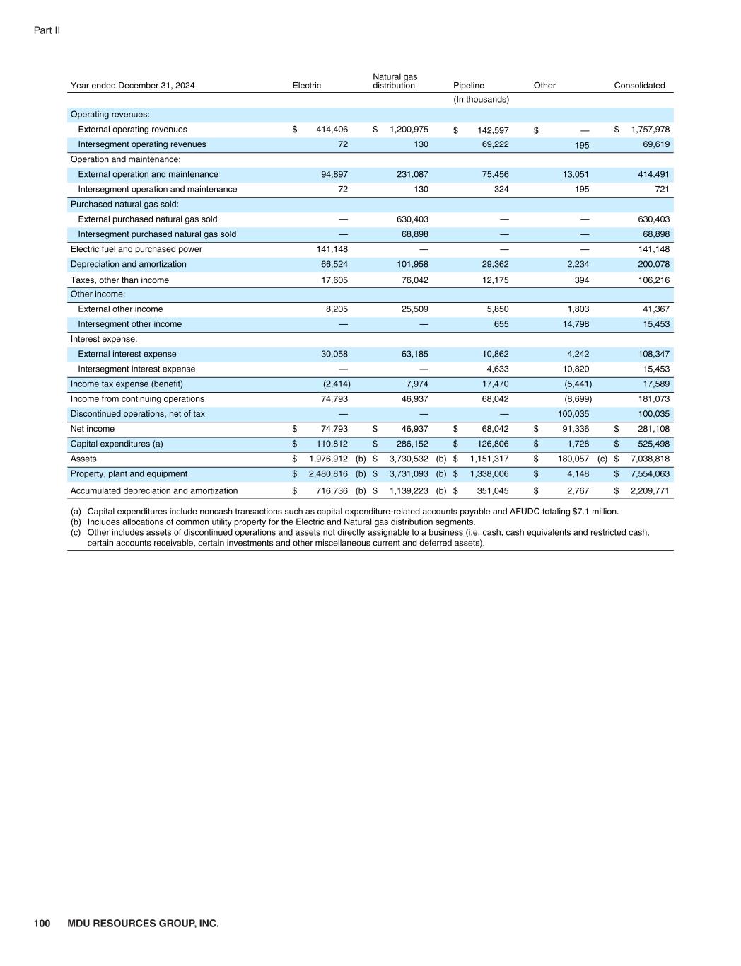 Part II MDU RESOURCES GROUP, INC.82 Disaggregation In the following table, revenue is disaggregated by the type of customer or service provided. The Company believes this level of disaggregation best depicts how the nature, amount, timing and uncertainty of revenue and cash flows are affected by economic factors. The table also includes a reconciliation of the disaggregated revenue by reportable segments. For more information on the Company's business segments, see Note 14. Year ended December 31, 2025 Electric Natural gas distribution Pipeline Other Total (In thousands) Residential utility sales $ 137,673 $ 654,793 $ — $ — $ 792,466 Commercial utility sales 187,097 436,431 — — 623,528 Industrial utility sales 38,066 44,183 — — 82,249 Other utility sales 7,537 — — — 7,537 Natural gas transportation — 66,978 191,542 — 258,520 Natural gas storage — — 23,270 — 23,270 Other 74,159 62,894 14,185 722 151,960 Intersegment eliminations (553) (345) (74,992) (722) (76,612) Revenues from contracts with customers 443,979 1,264,934 154,005 — 1,862,918 Other revenues (6,202) 18,196 154 — 12,148 Total external operating revenues $ 437,777 $ 1,283,130 $ 154,159 $ — $ 1,875,066 Year ended December 31, 2024 Electric Natural gas distribution Pipeline Other Total (In thousands) Residential utility sales $ 140,054 $ 646,049 $ — $ — $ 786,103 Commercial utility sales 171,760 399,087 — — 570,847 Industrial utility sales 42,883 42,588 — — 85,471 Other utility sales 7,910 — — — 7,910 Natural gas transportation — 60,645 174,623 — 235,268 Natural gas storage — — 23,690 — 23,690 Other 59,288 40,703 13,139 195 113,325 Intersegment eliminations (72) (130) (69,222) (195) (69,619) Revenues from contracts with customers 421,823 1,188,942 142,230 — 1,752,995 Other revenues (7,417) 12,033 367 — 4,983 Total external operating revenues $ 414,406 $ 1,200,975 $ 142,597 $ — $ 1,757,978 Year ended December 31, 2023 Electric Natural gas distribution Pipeline Other Total (In thousands) Residential utility sales $ 136,274 $ 724,600 $ — $ — $ 860,874 Commercial utility sales 170,321 442,507 — — 612,828 Industrial utility sales 43,063 45,205 — — 88,268 Other utility sales 7,270 — — — 7,270 Natural gas transportation — 52,465 145,297 — 197,762 Natural gas storage — — 18,254 — 18,254 Other 54,508 15,141 13,874 119 83,642 Intersegment eliminations (138) (301) (62,533) (119) (63,091) Revenues from contracts with customers 411,298 1,279,617 114,892 — 1,805,807 Other revenues (10,261) 7,619 187 — (2,455) Total external operating revenues $ 401,037 $ 1,287,236 $ 115,079 $ — $ 1,803,352 Index Part II 82 MDU Resources Group, Inc. Form 10-K
