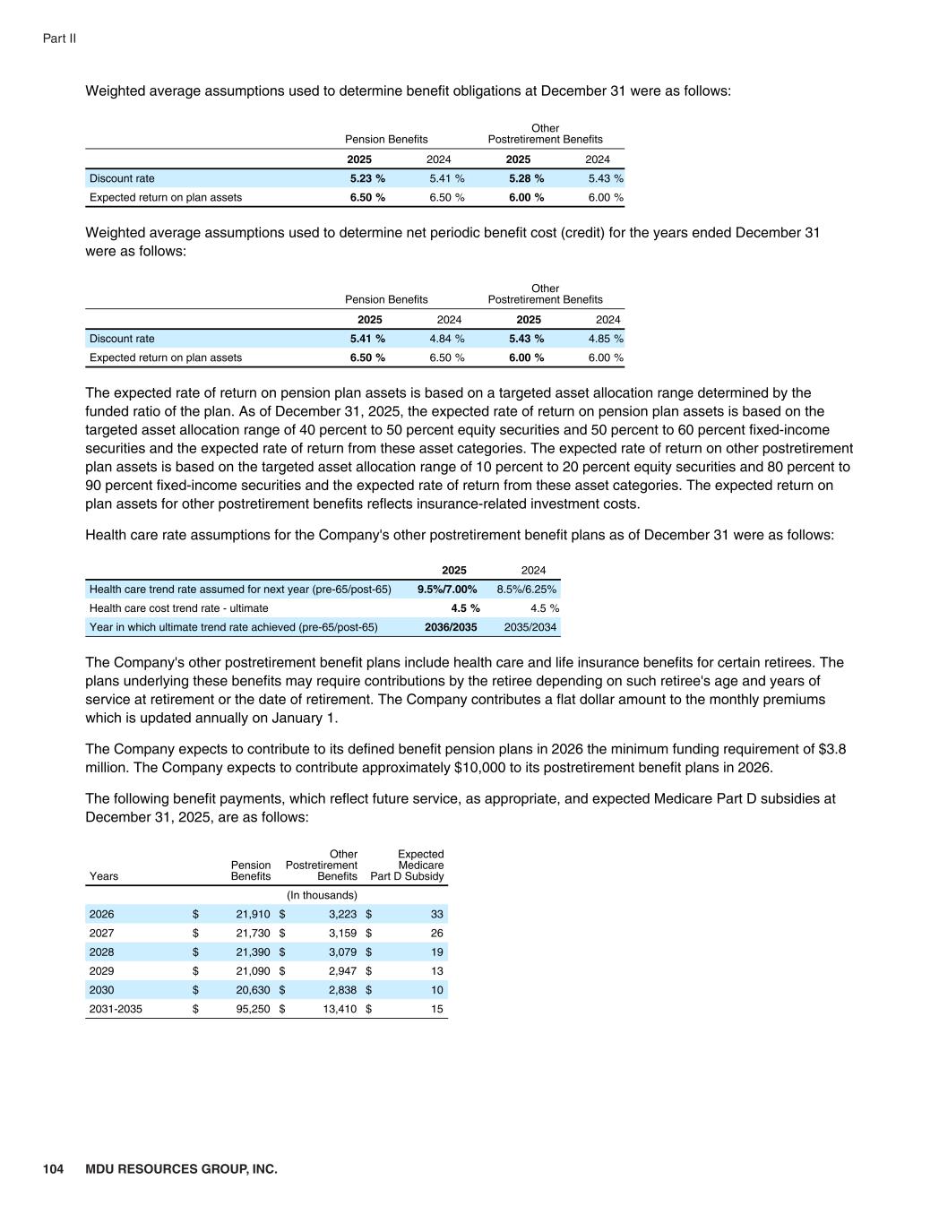 Part II MDU RESOURCES GROUP, INC.60 Regulatory accounting The Company is subject to rate regulation by state public service commissions and/or the FERC. Regulatory assets generally represent incurred or accrued costs that have been deferred and are expected to be recovered in rates charged to customers. Regulatory liabilities generally represent amounts that are expected to be refunded to customers in future rates or amounts collected in current rates for future costs. Management continually assesses the likelihood of recovery in future rates of incurred costs and refunds to customers associated with regulatory assets and liabilities. Decisions made by the various regulatory agencies can directly impact the amount and timing of these items. Therefore, expected recovery or refund of these deferred items generally is based on specific ratemaking decisions or precedent for each item. If future recovery of costs is no longer probable, the Company would be required to include those costs in the statement of income or accumulated other comprehensive loss in the period in which it is no longer deemed probable. The Company believes that the accounting subject to rate regulation remains appropriate and its regulatory assets are probable of recovery in current rates or in future rate proceedings. At December 31, 2025 and 2024, the Company's regulatory assets were $476.8 million and $537.8 million, respectively, and regulatory liabilities were $620.9 million and $596.3 million, respectively. At December 31, 2025 and 2024, regulatory assets in recovery were $437.6 million and $478.5 million, respectively, and regulatory assets not in recovery were $39.2 million and $59.3 million, respectively. Pension and other postretirement benefits The Company has noncontributory defined benefit pension plans and other postretirement benefit plans for certain eligible employees. Various actuarial assumptions are used in calculating the benefit expense (income) and liability (asset) related to these plans. Costs of providing pension and other postretirement benefits bear the risk of change, as they are dependent upon numerous factors based on assumptions of future conditions. The Company makes various assumptions when determining plan costs, including the current discount rates and the expected long-term return on plan assets, actuarially determined mortality data and health care cost trend rates. In selecting the expected long-term return on plan assets, which is considered to be one of the key variables in determining benefit expense or income, the Company considers historical returns, current market conditions, the mix of investments and expected future market trends, including changes in interest rates and equity and bond market performance. Another key variable in determining benefit expense or income is the discount rate. In selecting the discount rate, the Company matches forecasted future cash flows of the pension and postretirement plans to a yield curve which consists of a hypothetical portfolio of high-quality corporate bonds with varying maturity dates, as well as other factors, as a basis. The Company's pension and other postretirement benefit plan assets are primarily made up of equity and fixed-income investments. Fluctuations in actual equity and bond market returns, as well as changes in general interest rates, may result in increased or decreased pension and other postretirement benefit costs in the future. Health care cost trend rates are determined by historical and future trends. The Company believes the estimates made for its pension and other postretirement benefits are reasonable based on the information that is known when the estimates are made. These estimates and assumptions are subject to a number of variables and are expected to change in the future. Estimates and assumptions will be affected by changes in the discount rate, the expected long-term return on plan assets and health care cost trend rates. A 50 basis point change in the assumed discount rate and the expected long-term return on plan assets would have had the following effects at December 31, 2025: Pension Benefits Other Postretirement Benefits 50 Basis Point Increase 50 Basis Point Decrease 50 Basis Point Increase 50 Basis Point Decrease Discount rate (In millions) Projected benefit obligation as of December 31, 2025 $ (10.2) $ 11.0 $ (1.5) $ 1.6 Net periodic benefit cost (credit) for 2026 $ .1 $ (.1) $ — $ — Expected long-term return on plan assets Net periodic benefit cost (credit) for 2026 $ (1.2) $ 1.2 $ (.4) $ .4 Index Part II 60 MDU Resources Group, Inc. Form 10-K