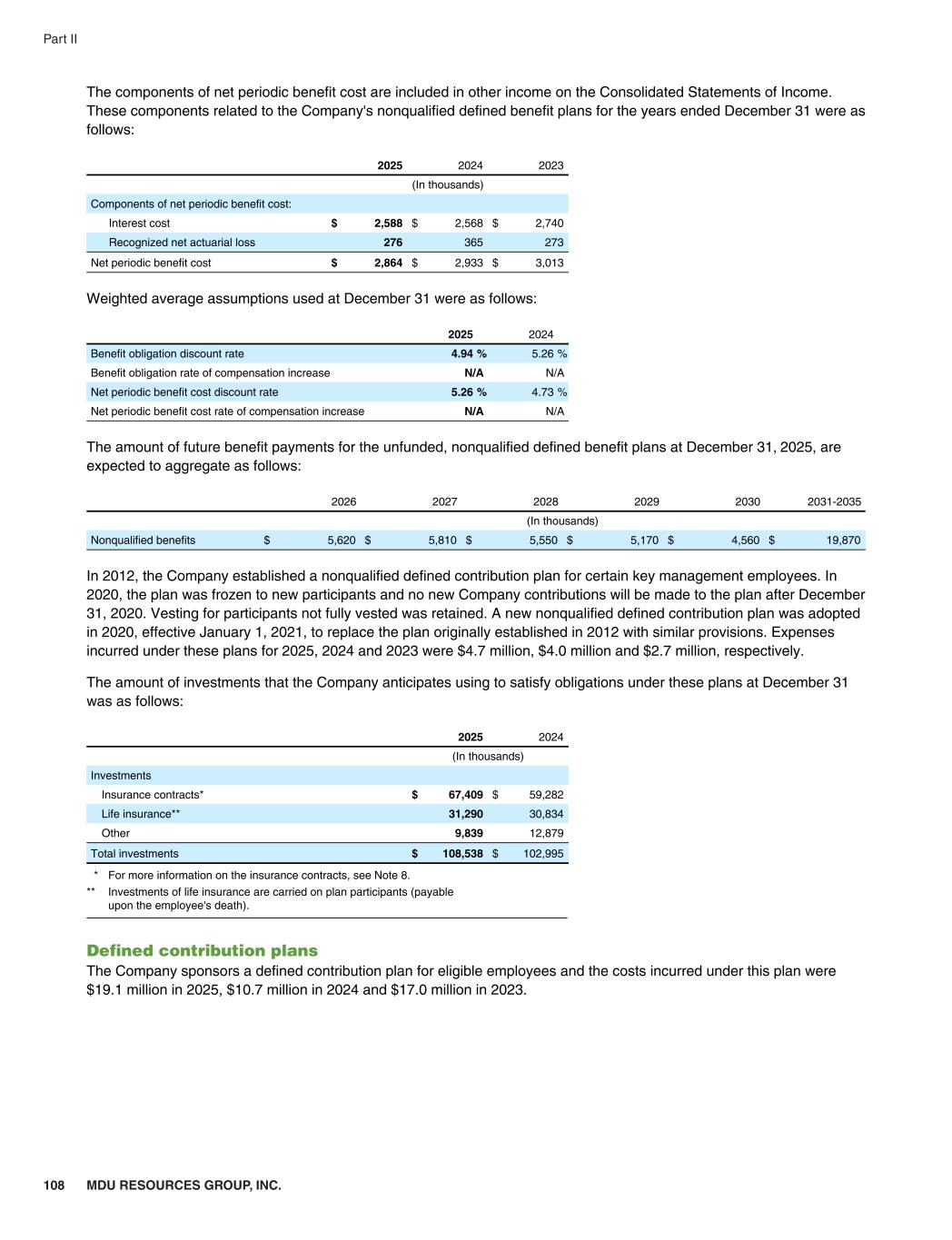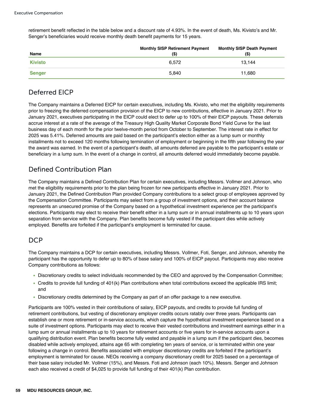 retirement benefit reflected in the table below and a discount rate of 4.93%. In the event of death, Ms. Kivisto’s and Mr. Senger’s beneficiaries would receive monthly death benefit payments for 15 years. Name Monthly SISP Retirement Payment ($) Monthly SISP Death Payment ($) Kivisto 6,572 13,144 Senger 5,840 11,680 Deferred EICP The Company maintains a Deferred EICP for certain executives, including Ms. Kivisto, who met the eligibility requirements prior to freezing the deferred compensation provision of the EICP to new contributions, effective in January 2021. Prior to January 2021, executives participating in the EICP could elect to defer up to 100% of their EICP payouts. These deferrals accrue interest at a rate of the average of the Treasury High Quality Market Corporate Bond Yield Curve for the last business day of each month for the prior twelve-month period from October to September. The interest rate in effect for 2025 was 5.41%. Deferred amounts are paid based on the participant’s election either as a lump sum or monthly installments not to exceed 120 months following termination of employment or beginning in the fifth year following the year the award was earned. In the event of a participant’s death, all amounts deferred are payable to the participant’s estate or beneficiary in a lump sum. In the event of a change in control, all amounts deferred would immediately become payable. Defined Contribution Plan The Company maintains a Defined Contribution Plan for certain executives, including Messrs. Vollmer and Johnson, who met the eligibility requirements prior to the plan being frozen for new participants effective in January 2021. Prior to January 2021, the Defined Contribution Plan provided Company contributions to a select group of employees approved by the Compensation Committee. Participants may select from a group of investment options, and their account balance represents an unsecured promise of the Company based on a hypothetical investment experience per the participant’s elections. Participants may elect to receive their benefit either in a lump sum or in annual installments up to 10 years upon separation from service with the Company. Plan benefits become fully vested if the participant dies while actively employed. Benefits are forfeited if the participant’s employment is terminated for cause. DCP The Company maintains a DCP for certain executives, including Messrs. Vollmer, Foti, Senger, and Johnson, whereby the participant has the opportunity to defer up to 80% of base salary and 100% of EICP payout. Participants may also receive Company contributions as follows: • Discretionary credits to select individuals recommended by the CEO and approved by the Compensation Committee; • Credits to provide full funding of 401(k) Plan contributions when total contributions exceed the applicable IRS limit; and • Discretionary credits determined by the Company as part of an offer package to a new executive. Participants are 100% vested in their contributions of salary, EICP payouts, and credits to provide full funding of retirement contributions, but vesting of discretionary employer credits occurs ratably over three years. Participants can establish one or more retirement or in-service accounts, which capture the hypothetical investment experience based on a suite of investment options. Participants may elect to receive their vested contributions and investment earnings either in a lump sum or annual installments up to 10 years for retirement accounts or five years for in-service accounts upon a qualifying distribution event. Plan benefits become fully vested and payable in a lump sum if the participant dies, becomes disabled while actively employed, attains age 65 with completing ten years of service, or is terminated within one year following a change in control. Benefits associated with employer discretionary credits are forfeited if the participant’s employment is terminated for cause. NEOs receiving a company discretionary credit for 2025 based on a percentage of their base salary included Mr. Vollmer (15%), and Messrs. Foti and Johnson (each 10%). Messrs. Senger and Johnson each also received a credit of $4,025 to provide full funding of their 401(k) Plan contribution. Executive Compensation 59 MDU RESOURCES GROUP, INC.