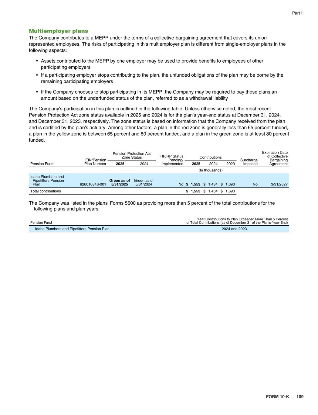 Part II 61FORM 10-K A 100 basis point change in the assumed health care cost trend rates would have had the following effects at December 31, 2025: 100 Basis Point Increase 100 Basis Point Decrease (In millions) Service and interest cost components for 2026 $ — $ — Postretirement benefit obligation as of December 31, 2025 $ 0.3 $ (0.3) The Company plans to continue to use its current methodologies to determine plan costs. For more information on the assumptions used in determining plan costs, see Item 8 - Note 15. Income taxes The Company is required to make judgments regarding the potential tax effects of various financial transactions and ongoing operations to estimate the Company's obligation to taxing authorities. These tax obligations include income, property, franchise and sales/use taxes. Judgments related to income taxes require the recognition in the Company's financial statements that a tax position is more-likely-than-not to be sustained on audit. Judgment and estimation is required in developing the provision for income taxes and the reporting of tax-related assets and liabilities and, if necessary, any valuation allowances. The interpretation of tax laws can involve uncertainty, since tax authorities may interpret such laws differently. Actual income tax could vary from estimated amounts and may result in favorable or unfavorable impacts to net income, cash flows and tax-related assets and liabilities. In addition, the effective tax rate may be affected by other changes including the allocation of property, payroll and revenues between states. The Company assesses the deferred tax assets for recoverability taking into consideration historical and anticipated earnings levels; the reversal of other existing temporary differences; available net operating losses and tax carryforwards; and available tax planning strategies that could be implemented to realize the deferred tax assets. Based on this assessment, management must evaluate the need for, and amount of, a valuation allowance against the deferred tax assets. As facts and circumstances change, adjustment to the valuation allowance may be required. Index Part II MDU Resources Group, Inc. Form 10-K 61