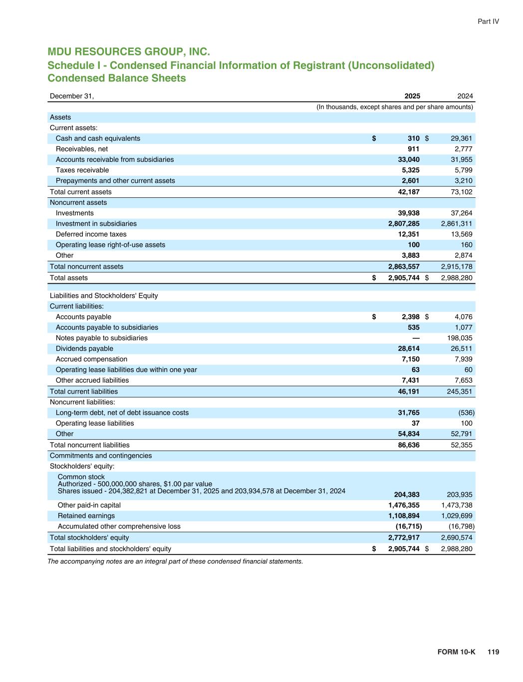 Part II 69FORM 10-K Consolidated Balance Sheets December 31, 2025 2024 Assets (In thousands, except shares and per share amounts) Current assets: Cash, cash equivalents and restricted cash $ 28,212 $ 66,904 Receivables, net 258,631 274,303 Current regulatory assets 179,579 215,436 Inventories 39,052 44,940 Current environmental allowances 26,194 23,304 Prepayments and other current assets 40,768 41,372 Total current assets 572,436 666,259 Noncurrent assets: Property, plant and equipment 8,264,972 7,554,063 Less accumulated depreciation and amortization 2,304,787 2,209,771 Net property, plant and equipment 5,960,185 5,344,292 Goodwill 345,736 345,736 Regulatory assets 297,218 322,350 Investments 121,177 115,459 Environmental allowances 112,376 66,170 Other 213,078 178,552 Total noncurrent assets 7,049,770 6,372,559 Total assets $ 7,622,206 $ 7,038,818 Liabilities and Stockholders' Equity Current liabilities: Long-term debt due within one year $ 144,700 $ 161,700 Accounts payable 148,970 150,070 Regulatory liabilities due within one year 148,584 137,167 Taxes payable 44,686 43,372 Dividends payable 28,614 26,511 Accrued compensation 34,666 35,264 Current environmental obligations 24,086 19,561 Other accrued liabilities 110,917 104,953 Total current liabilities 685,223 678,598 Noncurrent liabilities: Long-term debt 2,532,155 2,130,910 Deferred income taxes 437,286 441,320 Regulatory liabilities 472,329 459,170 Asset retirement obligations 431,587 406,351 Environmental obligations 108,448 58,457 Other 182,261 173,438 Total noncurrent liabilities 4,164,066 3,669,646 Stockholders' equity: Common stock Authorized - 500,000,000 shares, $1.00 par value Shares issued - 204,382,821 at December 31, 2025 and 203,934,578 at December 31, 2024 204,383 203,935 Other paid-in capital 1,476,355 1,473,738 Retained earnings 1,108,894 1,029,699 Accumulated other comprehensive loss (16,715) (16,798) Total stockholders' equity 2,772,917 2,690,574 Total liabilities and stockholders' equity $ 7,622,206 $ 7,038,818 The accompanying notes are an integral part of these consolidated financial statements. Index Part II MDU Resources Group, Inc. Form 10-K 69