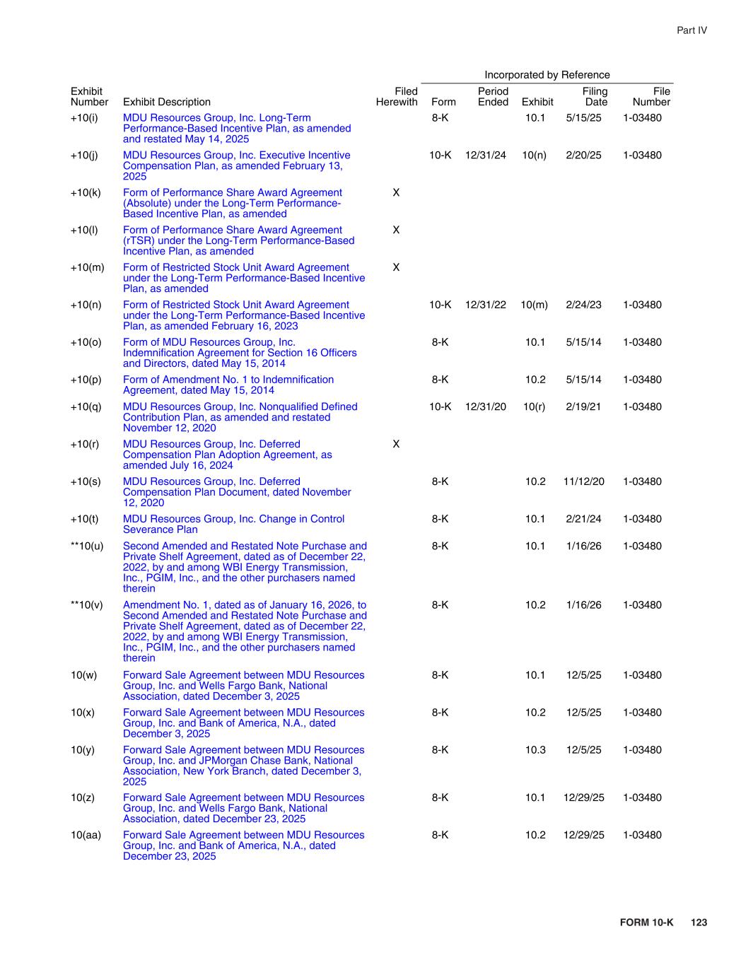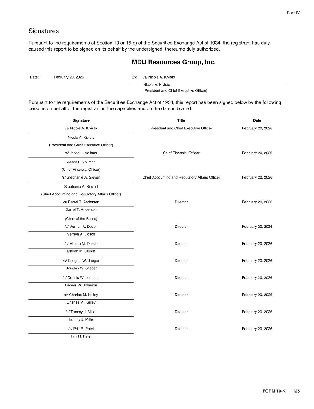 UNITED STATES SECURITIES AND EXCHANGE COMMISSION WASHINGTON, D.C. 20549 FORM 10-K ☒ ANNUAL REPORT PURSUANT TO SECTION 13 OR 15(d) OF THE SECURITIES EXCHANGE ACT OF 1934 For the fiscal year ended December 31, 2025 OR ☐ TRANSITION REPORT PURSUANT TO SECTION 13 OR 15(d) OF THE SECURITIES EXCHANGE ACT OF 1934 For the transition period from _____________ to ______________ Commission file number 1-03480 MDU RESOURCES GROUP, INC. (Exact name of registrant as specified in its charter) Delaware 30-1133956 (State or other jurisdiction of incorporation or organization) (I.R.S. Employer Identification No.) 1200 West Century Avenue P.O. Box 5650 Bismarck, North Dakota 58506-5650 (Address of principal executive offices) (Zip Code) (701) 530-1000 (Registrant's telephone number, including area code) Securities registered pursuant to Section 12(b) of the Act: Title of each class Trading symbol(s) Name of each exchange on which registered Common Stock, par value $1.00 per share MDU New York Stock Exchange Securities registered pursuant to Section 12(g) of the Act: None Indicate by check mark if the registrant is a well-known seasoned issuer, as defined in Rule 405 of the Securities Act. Yes ☒ No ☐. Indicate by check mark if the registrant is not required to file reports pursuant to Section 13 or Section 15(d) of the Act. Yes ☐ No ☒. Indicate by check mark whether the registrant (1) has filed all reports required to be filed by Section 13 or 15(d) of the Securities Exchange Act of 1934 during the preceding 12 months (or for such shorter period that the registrant was required to file such reports), and (2) has been subject to such filing requirements for the past 90 days. Yes ☒ No ☐. Indicate by check mark whether the registrant has submitted electronically every Interactive Data File required to be submitted pursuant to Rule 405 of Regulation S-T (§ 232.405 of this chapter) during the preceding 12 months (or for such shorter period that the registrant was required to submit such files). Yes ☒ No ☐. Indicate by check mark whether the registrant is a large accelerated filer, an accelerated filer, a non-accelerated filer, a smaller reporting company, or an emerging growth company. See the definitions of "large accelerated filer," "accelerated filer," "smaller reporting company," and "emerging growth company" in Rule 12b-2 of the Exchange Act. Large accelerated filer ☒ Accelerated filer ☐ Non-accelerated filer ☐ Smaller reporting company ☐ Emerging growth company ☐ If an emerging growth company, indicate by check mark if the registrant has elected not to use the extended transition period for complying with any new or revised financial accounting standards provided pursuant to Section 13(a) of the Exchange Act. ☐ Indicate by check mark whether the registrant has filed a report on and attestation to its management's assessment of the effectiveness of its internal control over financial reporting under Section 404(b) of the Sarbanes-Oxley Act (15 U.S.C. 7262(b)) by the registered public accounting firm that prepared or issued its audit report. ☒ If securities are registered pursuant to Section 12(b) of the Act, indicate by check mark whether the financial statements of the registrant included in the filing reflect the correction of an error to previously issued financial statements. ☐ Indicate by check mark whether any of those error corrections are restatements that required a recovery analysis of incentive-based compensation received by any of the registrant's executive officers during the relevant recovery period pursuant to §240.10D-1(b). ☐ Indicate by check mark whether the registrant is a shell company (as defined in Rule 12b-2 of the Act). Yes ☐ No ☒. State the aggregate market value of the voting common stock held by non-affiliates of the registrant as of June 30, 2025: $3,394,621,007. Indicate the number of shares outstanding of the registrant's common stock, as of February 13, 2026: 204,382,821 shares. DOCUMENTS INCORPORATED BY REFERENCE Relevant portions of the registrant's 2026 Proxy Statement, to be filed no later than 120 days from December 31, 2025, are incorporated by reference in Part III, Items 10, 11, 12, 13 and 14 of this Report.