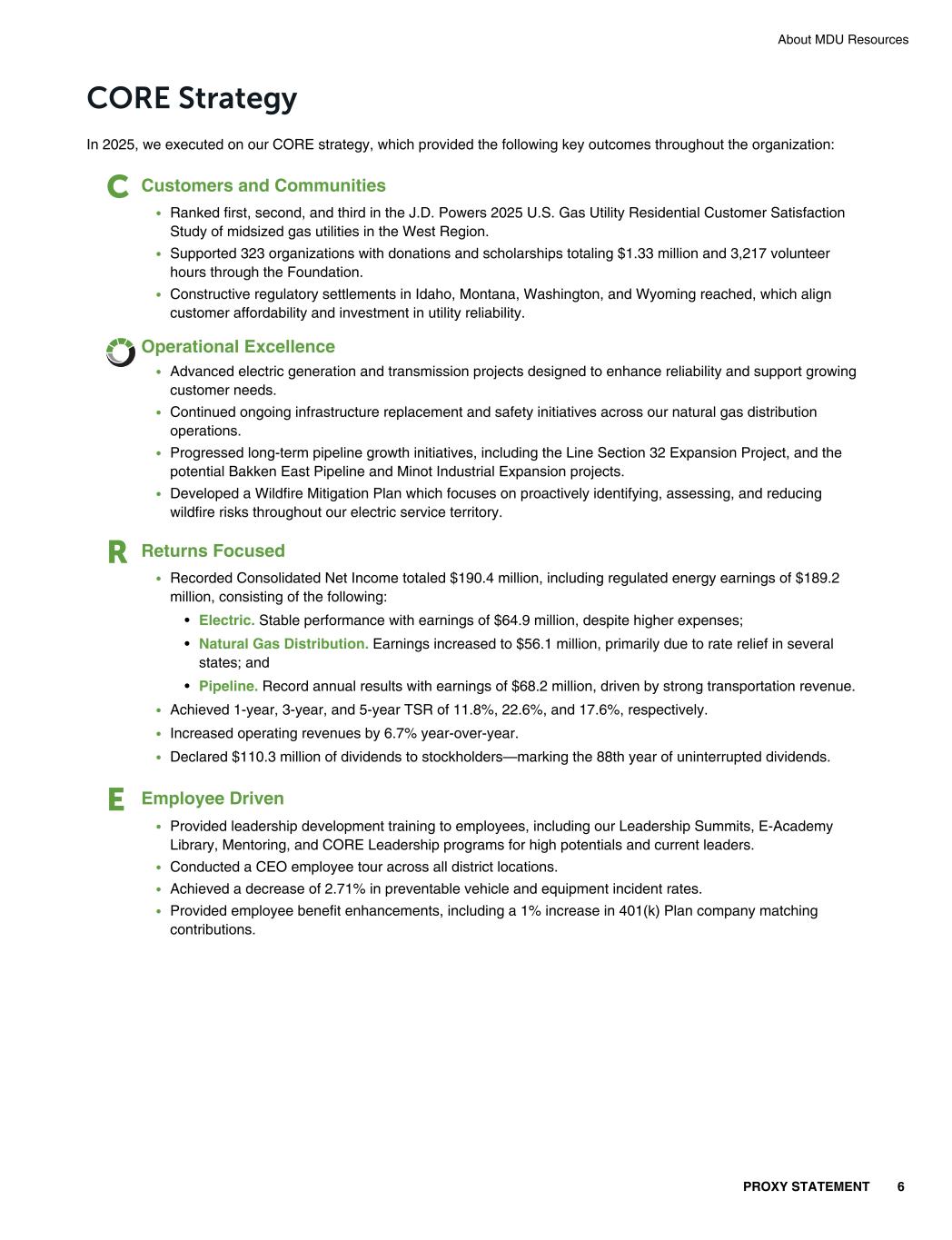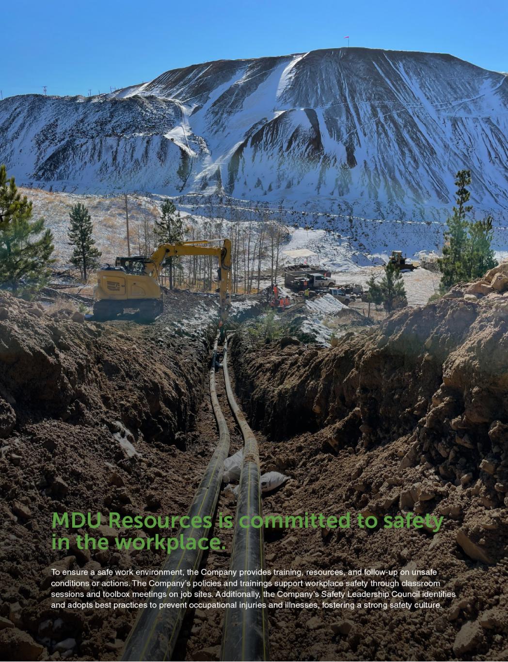 Responsible Business Stewardship We are committed to providing our customers of today with reliable and affordable energy while also implementing more sustainable, long-term strategies, and being good stewards of the environment for our customers of tomorrow. We have a responsibility to deliver the critical energy our customers depend on in ways that thoughtfully utilize our resources, protect the environment, help our customers and communities thrive, and provide value to our stockholders. Throughout our sustainability journey, we have made meaningful progress on behalf of these stakeholders by further integrating our responsible business stewardship into our corporate strategy. We made significant positive impacts towards our commitments to People, Planet, and Principles: People As a dedicated community partner and trusted employer, we play a vital role in shaping healthy and thriving communities. We enhanced our commitment to our employees in 2024 by further increasing our investment in their safety. We provided additional support for our local safety committees, increased focus on sharing near-misses to enhance our safety culture, and implemented programs to help our employees prevent injuries. These investments have proven effective–our recordable injury rate and days away, restricted, or transferred rate for both our utility and pipeline businesses decreased each year from 2023 to 2025. We are proud of the values that drive us, the respectful way we work together to support our customers, communities, and stockholders, and we strive to continue these values through future generations. Planet We are committed to doing our part to ensure a more sustainable, low-carbon future. Our electric and natural gas distribution business and pipeline business made steady and significant progress toward each of our three long-term environmental goals: • Electric. As of Fiscal 2025, we have reduced our owned and co-owned generation resources’ electric GHG emissions intensity by 44% compared to 2005 levels, setting us up for success in achieving our 45% reduction by 2030 goal. • Natural Gas Distribution. As of Fiscal 2024, we have reduced our natural gas distribution utility’s fugitive, planned, and unplanned methane releases by 10% compared to 2022 levels within our natural gas distribution system, representing solid progress against our 30% reduction by 2035 goal. • Pipeline. As of Fiscal 2024, we have reduced our pipeline’s methane emissions intensity by 35% compared to 2020 rates, exceeding our 25% reduction by 2030 goal. Principles The Board believes deeply that it must be fit for its purpose, and provide strategic value to the Company. Therefore, because our strategy and responsible business stewardship, including our Board’s oversight of each, are interconnected, the Board and each of its standing committees have responsible business-related oversight responsibilities. This structure reflects the Board’s emphasis on responsible business stewardship. We recognize that our customers count on us every day for the energy they need, and we take very seriously the commitment of supplying that energy today—and far into the future—in a responsible way. Together, we are energizing lives for a better tomorrow. To learn more about our responsible business practices, see our Impact Report, which is presented consistent with SASB, TCFD, EEI, and AGA reporting standards and is available at mdu.com/responsiblebusiness/. PROXY STATEMENT 88