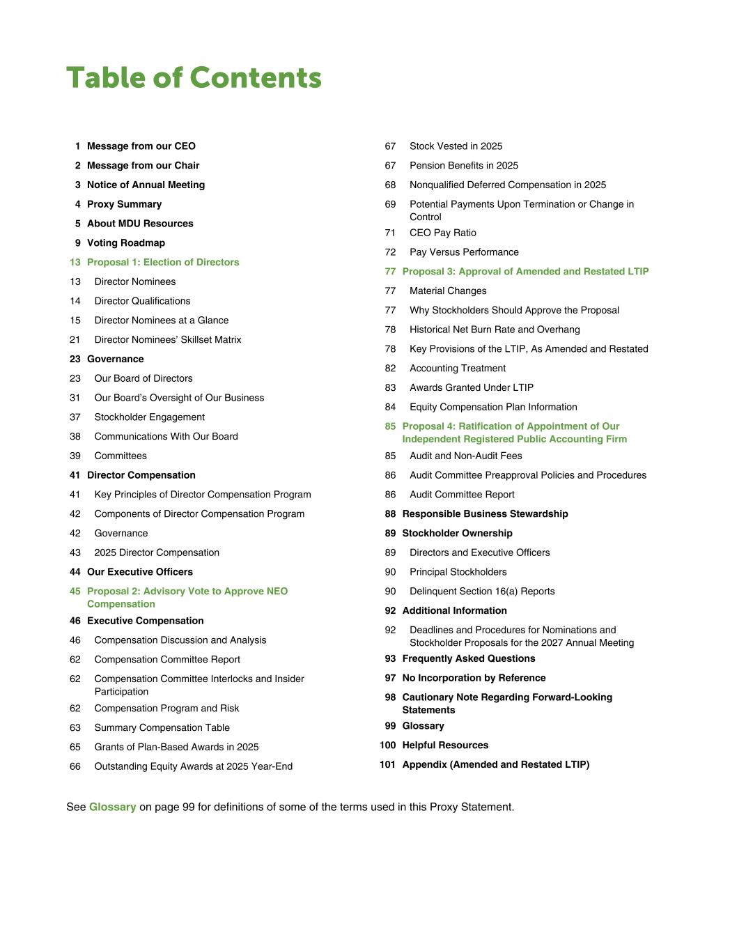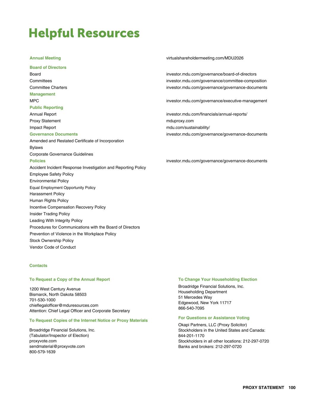 Helpful Resources Annual Meeting virtualshareholdermeeting.com/MDU2026 Board of Directors Board investor.mdu.com/governance/board-of-directors Committees investor.mdu.com/governance/committee-composition Committee Charters investor.mdu.com/governance/governance-documents Management MPC investor.mdu.com/governance/executive-management Public Reporting Annual Report investor.mdu.com/financials/annual-reports/ Proxy Statement mduproxy.com Impact Report mdu.com/sustainability/ Governance Documents investor.mdu.com/governance/governance-documents Amended and Restated Certificate of Incorporation Bylaws Corporate Governance Guidelines Policies investor.mdu.com/governance/governance-documents Accident Incident Response Investigation and Reporting Policy Employee Safety Policy Environmental Policy Equal Employment Opportunity Policy Harassment Policy Human Rights Policy Incentive Compensation Recovery Policy Insider Trading Policy Leading With Integrity Policy Procedures for Communications with the Board of Directors Prevention of Violence in the Workplace Policy Stock Ownership Policy Vendor Code of Conduct Contacts To Request a Copy of the Annual Report 1200 West Century Avenue Bismarck, North Dakota 58503 701-530-1000 chieflegalofficer@mduresources.com Attention: Chief Legal Officer and Corporate Secretary To Request Copies of the Internet Notice or Proxy Materials Broadridge Financial Solutions, Inc. (Tabulator/Inspector of Election) proxyvote.com sendmaterial@proxyvote.com 800-579-1639 To Change Your Householding Election Broadridge Financial Solutions, Inc. Householding Department 51 Mercedes Way Edgewood, New York 11717 866-540-7095 For Questions or Assistance Voting Okapi Partners, LLC (Proxy Solicitor) Stockholders in the United States and Canada: 844-201-1170 Stockholders in all other locations: 212-297-0720 Banks and brokers: 212-297-0720 PROXY STATEMENT 100
