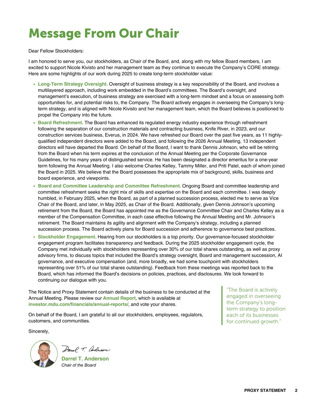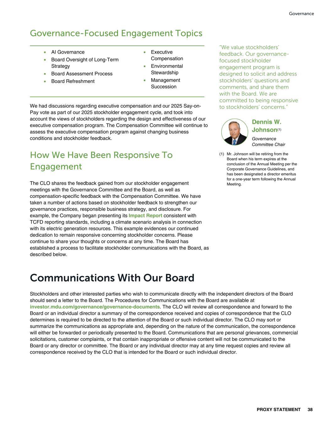 Governance-Focused Engagement Topics • AI Governance • Board Oversight of Long-Term Strategy • Board Assessment Process • Board Refreshment • Executive Compensation • Environmental Stewardship • Management Succession We had discussions regarding executive compensation and our 2025 Say-on- Pay vote as part of our 2025 stockholder engagement cycle, and took into account the views of stockholders regarding the design and effectiveness of our executive compensation program. The Compensation Committee will continue to assess the executive compensation program against changing business conditions and stockholder feedback. How We Have Been Responsive To Engagement The CLO shares the feedback gained from our stockholder engagement meetings with the Governance Committee and the Board, as well as compensation-specific feedback with the Compensation Committee. We have taken a number of actions based on stockholder feedback to strengthen our governance practices, responsible business strategy, and disclosure. For example, the Company began presenting its Impact Report consistent with TCFD reporting standards, including a climate scenario analysis in connection with its electric generation resources. This example evidences our continued dedication to remain responsive concerning stockholder concerns. Please continue to share your thoughts or concerns at any time. The Board has established a process to facilitate stockholder communications with the Board, as described below. “We value stockholders’ feedback. Our governance- focused stockholder engagement program is designed to solicit and address stockholders’ questions and comments, and share them with the Board. We are committed to being responsive to stockholders' concerns.” Dennis W. Johnson(1) Governance Committee Chair (1) Mr. Johnson will be retiring from the Board when his term expires at the conclusion of the Annual Meeting per the Corporate Governance Guidelines, and has been designated a director emeritus for a one-year term following the Annual Meeting. Communications With Our Board Stockholders and other interested parties who wish to communicate directly with the independent directors of the Board should send a letter to the Board. The Procedures for Communications with the Board are available at investor.mdu.com/governance/governance-documents. The CLO will review all correspondence and forward to the Board or an individual director a summary of the correspondence received and copies of correspondence that the CLO determines is required to be directed to the attention of the Board or such individual director. The CLO may sort or summarize the communications as appropriate and, depending on the nature of the communication, the correspondence will either be forwarded or periodically presented to the Board. Communications that are personal grievances, commercial solicitations, customer complaints, or that contain inappropriate or offensive content will not be communicated to the Board or any director or committee. The Board or any individual director may at any time request copies and review all correspondence received by the CLO that is intended for the Board or such individual director. Governance PROXY STATEMENT 38