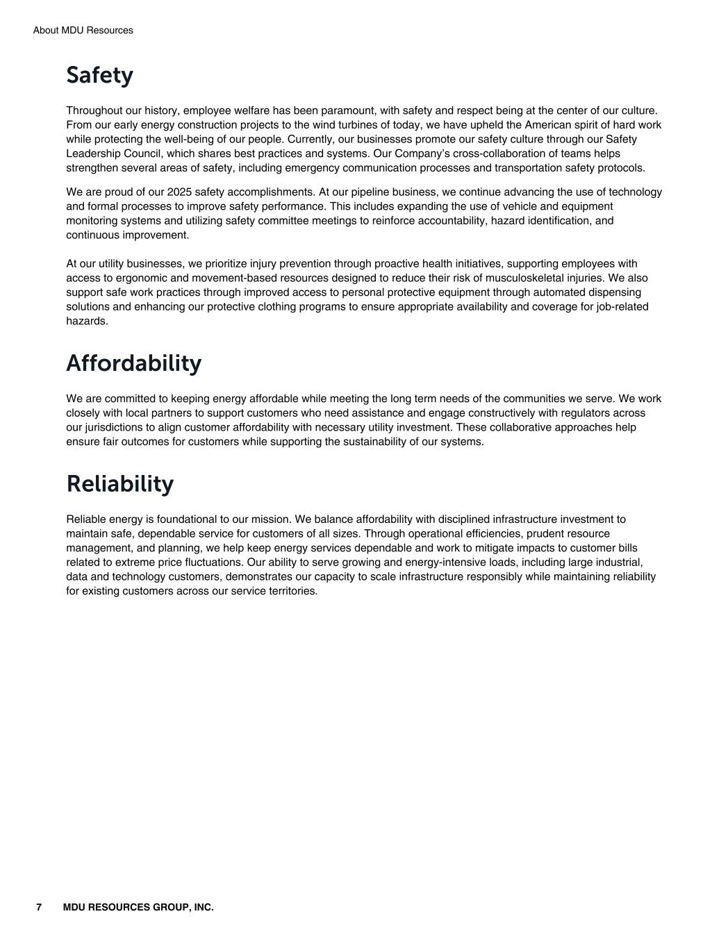 We remain committed to our long-term dividend philosophy, which emphasizes consistency and sustainability. The dividend increase approved in 2025 reinforces both our confidence in the strength of our operations and our long-term growth outlook. In December 2025, we completed a follow-on offering of our common stock at a public offering price of $19.70 per share. In connection with the offering, we entered into forward sale agreements, which provide flexibility to settle the agreements on one or more dates prior to December 2027, subject to certain price adjustments. The shares of common stock in the forward sale agreements are expected to meet a substantial portion of our equity needs to support our capital investment plans for 2026 and a portion of 2027. Looking forward, we expect continued rate base expansion, customer growth of approximately 1% to 2% annually and additional opportunities within our pipeline operations to meet growing regional demand. Combined, we believe these drivers position MDU Resources to continue delivering attractive, sustainable returns for years to come. The People Behind the Energy Our people are the heart of MDU Resources. From field crews maintaining infrastructure in challenging weather to engineers advancing infrastructure projects and customer service teams providing exceptional care, our employees embody the values that define us: integrity, safety, respect, excellence and stewardship. Across our family of companies, we operate with a commitment not only to meet industry standards, but to exceed them wherever possible. We enlist subject matter experts, conduct rigorous internal audits and continuously refine our procedures to strengthen compliance, mitigate risk and enhance system reliability. Throughout 2025, our employees demonstrated remarkable dedication and professionalism. Their work ethic ensures that customers receive safe and reliable energy every day, and their innovation helps us find new ways to operate more efficiently and effectively. Continuous improvement is fundamental to how we operate. We analyze near-miss events, review operational metrics, implement corrective actions and share lessons learned across business segments to ensure consistent application of best practices. Letter to Stockholders MDU RESOURCES GROUP, INC. 5ANNUAL REPORT