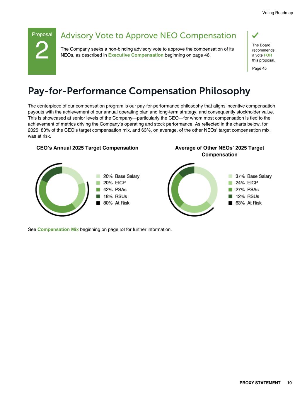 Key Compensation Governance Practices What We Do At Risk Compensation. The EICP is tied to demanding financial and customer-focused performance measures intended to reward the NEOs for the accomplishment of these goals. LTI awards are granted in a combination of PSAs (70%) and RSUs (30%). PSAs vest only if the Company achieves its performance goals, cumulative adjusted EPS and rTSR, in each case measured over the three-year performance period. RSUs cliff vest after three years if the NEO remains employed by the Company. Independent Compensation Consultant. The Compensation Committee retains an independent compensation consultant to evaluate executive compensation plans and practices. Stockholder Engagement Program. The Company conducts proactive stockholder and proxy advisory firm engagement outreach to solicit feedback. Competitive Compensation. Executive compensation opportunities reflect individual performance and experience, internal equity, competitive market, and the Company’s performance. Balanced Mix of Pay Components. The combination of annual cash and long-term equity-based compensation reduces the risk that an executive will take short-term action to the detriment of long-term results. Mix of Financial and Customer-Focused Goals. The EICP utilizes a combination of demanding but achievable financial and customer-focused goals to measure performance, which prevents overemphasis on a single metric. No EICP payouts are made unless applicable goals are achieved. This encourages our executives to manage the business without pressuring them to take undue risks in order to obtain a payout. Annual Say-on-Pay Vote. Our Say-on-Pay vote is currently held every year, consistent with the preference expressed by a majority of our stockholders. Mitigate Undue Compensation Program Risks. Risks related to our compensation programs are regularly reviewed through an annual compensation risk assessment. Insider Trading Policy. The Insider Trading Policy prohibits the trading of Company securities while in possession of material non-public information. Stock Ownership Policy. The Company imposes and monitors a meaningful Stock Ownership Policy. Clawback Policy. The Clawback Policy generally provides for the recovery of certain incentive-based compensation in the event of an accounting restatement. What We Don’t Do No In-Flight Performance Metric or Performance Target Changes. The Compensation Committee does not make changes to performance metrics or performance targets during performance cycles. No Employment Agreements or Severance Benefits. All our executives are employed at-will and none have employment agreements providing for severance (other than the CIC Severance Plan). No Perquisites. Executives do not receive perquisites that materially differ from those available to employees in general. No Stock Options. The Company does not grant stock options. No Hedging. Executives are not allowed to hedge Company securities. No Pledging. Executives are not allowed to pledge Company securities in margin accounts or as collateral for loans. No Tax Gross-Ups. Executives do not receive tax gross-ups on their compensation (other than for nominal service awards and gift certificates like all other employees). No Excessive Change in Control Severance Payments. We do not pay change in control cash severance payments that exceed 3x base salary and target incentive compensation. No Unrestricted Sales or Purchases of Securities. The Insider Trading Policy places certain restrictions on the purchase and sale of securities. No Cash Dividends on Unvested LTI. We do not pay cash dividends on PSA or RSU awards, unless and until vested. No Excessive Risk Taking. Our EICP payouts and LTI awards are capped to discourage inappropriate risk taking. No Single Trigger Change in Control Provisions. Our LTI includes a double trigger provision in the case of a change in control. Executive Compensation PROXY STATEMENT 50