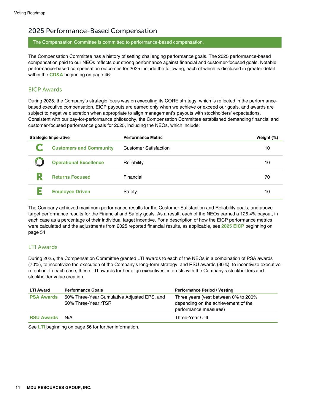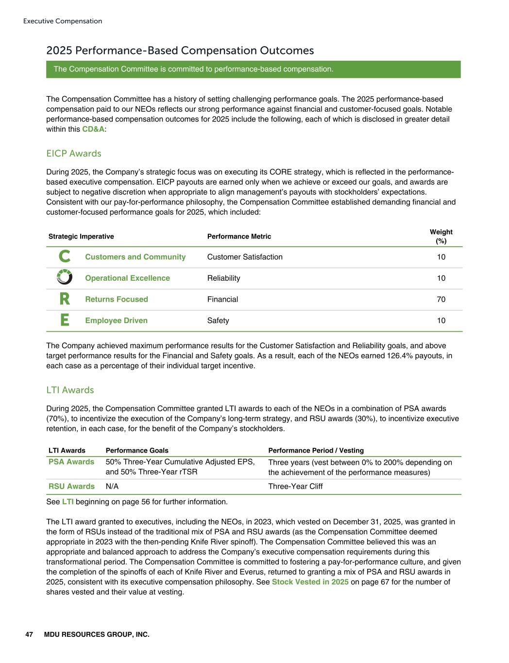 2025 Performance-Based Compensation Outcomes The Compensation Committee is committed to performance-based compensation. The Compensation Committee has a history of setting challenging performance goals. The 2025 performance-based compensation paid to our NEOs reflects our strong performance against financial and customer-focused goals. Notable performance-based compensation outcomes for 2025 include the following, each of which is disclosed in greater detail within this CD&A: EICP Awards During 2025, the Company’s strategic focus was on executing its CORE strategy, which is reflected in the performance- based executive compensation. EICP payouts are earned only when we achieve or exceed our goals, and awards are subject to negative discretion when appropriate to align management’s payouts with stockholders’ expectations. Consistent with our pay-for-performance philosophy, the Compensation Committee established demanding financial and customer-focused performance goals for 2025, which included: Strategic Imperative Performance Metric Weight (%) C Customers and Community Customer Satisfaction 10 Operational Excellence Reliability 10 R Returns Focused Financial 70 E Employee Driven Safety 10 The Company achieved maximum performance results for the Customer Satisfaction and Reliability goals, and above target performance results for the Financial and Safety goals. As a result, each of the NEOs earned 126.4% payouts, in each case as a percentage of their individual target incentive. LTI Awards During 2025, the Compensation Committee granted LTI awards to each of the NEOs in a combination of PSA awards (70%), to incentivize the execution of the Company’s long-term strategy, and RSU awards (30%), to incentivize executive retention, in each case, for the benefit of the Company’s stockholders. LTI Awards Performance Goals Performance Period / Vesting PSA Awards 50% Three-Year Cumulative Adjusted EPS, and 50% Three-Year rTSR Three years (vest between 0% to 200% depending on the achievement of the performance measures) RSU Awards N/A Three-Year Cliff See LTI beginning on page 56 for further information. The LTI award granted to executives, including the NEOs, in 2023, which vested on December 31, 2025, was granted in the form of RSUs instead of the traditional mix of PSA and RSU awards (as the Compensation Committee deemed appropriate in 2023 with the then-pending Knife River spinoff). The Compensation Committee believed this was an appropriate and balanced approach to address the Company’s executive compensation requirements during this transformational period. The Compensation Committee is committed to fostering a pay-for-performance culture, and given the completion of the spinoffs of each of Knife River and Everus, returned to granting a mix of PSA and RSU awards in 2025, consistent with its executive compensation philosophy. See Stock Vested in 2025 on page 67 for the number of shares vested and their value at vesting. Executive Compensation 47 MDU RESOURCES GROUP, INC.