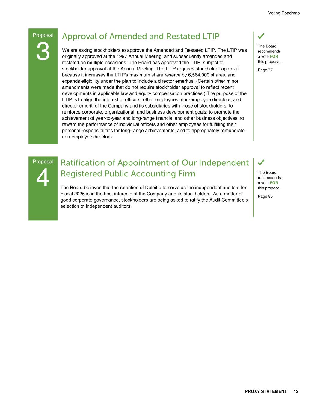 The following chart describes the proposals to be considered at the Annual Meeting, the vote required to elect directors and to adopt each other proposal, and the manner in which votes will be counted: Proposal Voting Options Vote Required to Approve Effect of Abstentions Effect of “Broker Non-Votes” 1 Elect eight directors to the Board to serve one-year terms For, against, or abstain on each nominee A nominee for director will be elected if the votes cast for such director nominee exceed the votes cast against such nominee. Cumulative voting is not permitted. No effect No effect 2 Vote, on an advisory basis, to approve the NEOs’ compensation For, against, or abstain Affirmative vote of a majority of the shares of Common Stock present in person or represented by proxy at the Annual Meeting and entitled to vote thereon. Same effect as votes against 3 Approve the Amended and Restated LTIP 4 Ratify the appointment of Deloitte as the Company’s independent registered public accounting firm for Fiscal 2026 Brokers have discretion to vote Q: What is the difference between a “stockholder of record” and a beneficial owner of shares held in “street name?” A: Stockholder of Record: If on the Record Date your shares are registered directly in your name with the Company’s transfer agent, you are considered a “stockholder of record” of those shares. In this case, the Notice has been sent to you directly by us. Beneficial Owners of Shares Held in Street Name: If on the Record Date your shares are held in a brokerage account or by a bank, trust, or other nominee or custodian, then you are considered the beneficial owner of those shares, which are held in “street name.” In this case, the Notice has been forwarded to you by that broker, bank, trustee, or other nominee or custodian. The broker, bank, trustee, or other nominee or custodian holding your account is considered the stockholder of record for purposes of voting at the Annual Meeting. As the beneficial owner, you have the right to instruct that broker, bank, trustee, or other nominee or custodian as to how to vote the shares held in your account by following the voting instructions that the broker, bank, trustee, or other nominee or custodian provides. Q: Can I change my mind after voting my shares? A: Yes, you may revoke your proxy at any time before it is used by: • sending a written notice to our Corporate Secretary at our Corporate Headquarters, • delivering a valid proxy card with a later date, • providing a later-dated vote by telephone, scanning, Internet, or app, or • voting at the Annual Meeting. Frequently Asked Questions PROXY STATEMENT 94
