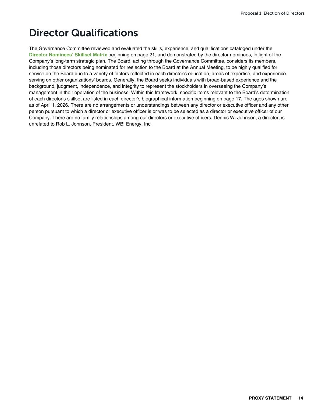 Director Qualifications The Governance Committee reviewed and evaluated the skills, experience, and qualifications cataloged under the Director Nominees’ Skillset Matrix beginning on page 21, and demonstrated by the director nominees, in light of the Company’s long-term strategic plan. The Board, acting through the Governance Committee, considers its members, including those directors being nominated for reelection to the Board at the Annual Meeting, to be highly qualified for service on the Board due to a variety of factors reflected in each director’s education, areas of expertise, and experience serving on other organizations’ boards. Generally, the Board seeks individuals with broad-based experience and the background, judgment, independence, and integrity to represent the stockholders in overseeing the Company’s management in their operation of the business. Within this framework, specific items relevant to the Board’s determination of each director’s skillset are listed in each director’s biographical information beginning on page 17. The ages shown are as of April 1, 2026. There are no arrangements or understandings between any director or executive officer and any other person pursuant to which a director or executive officer is or was to be selected as a director or executive officer of our Company. There are no family relationships among our directors or executive officers. Dennis W. Johnson, a director, is unrelated to Rob L. Johnson, President, WBI Energy, Inc. Proposal 1: Election of Directors PROXY STATEMENT 14