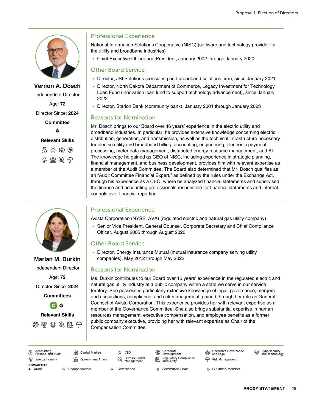 Vernon A. Dosch Independent Director Age: 72 Director Since: 2024 Committee Relevant Skills Professional Experience National Information Solutions Cooperative (NISC) (software and technology provider for the utility and broadband industries) • Chief Executive Officer and President, January 2002 through January 2020 Other Board Service • Director, JSI Solutions (consulting and broadband solutions firm), since January 2021 • Director, North Dakota Department of Commerce, Legacy Investment for Technology Loan Fund (innovation loan fund to support technology advancement), since January 2022 • Director, Starion Bank (community bank), January 2001 through January 2023 Reasons for Nomination Mr. Dosch brings to our Board over 46 years’ experience in the electric utility and broadband industries. In particular, he provides extensive knowledge concerning electric distribution, generation, and transmission, as well as the technical infrastructure necessary for electric utility and broadband billing, accounting, engineering, electronic payment processing, meter data management, distributed energy resource management, and AI. The knowledge he gained as CEO of NISC, including experience in strategic planning, financial management, and business development, provides him with relevant expertise as a member of the Audit Committee. The Board also determined that Mr. Dosch qualifies as an “Audit Committee Financial Expert,” as defined by the rules under the Exchange Act, through his experience as a CEO, where he analyzed financial statements and supervised the finance and accounting professionals responsible for financial statements and internal controls over financial reporting. Marian M. Durkin Independent Director Age: 72 Director Since: 2024 Committees Relevant Skills Professional Experience Avista Corporation (NYSE: AVA) (regulated electric and natural gas utility company) • Senior Vice President, General Counsel, Corporate Secretary and Chief Compliance Officer, August 2005 through August 2020 Other Board Service • Director, Energy Insurance Mutual (mutual insurance company serving utility companies), May 2012 through May 2022 Reasons for Nomination Ms. Durkin contributes to our Board over 15 years’ experience in the regulated electric and natural gas utility industry at a public company within a state we serve in our service territory. She possesses particularly extensive knowledge of legal, governance, mergers and acquisitions, compliance, and risk management, gained through her role as General Counsel of Avista Corporation. This experience provides her with relevant expertise as a member of the Governance Committee. She also brings substantial expertise in human resources management, executive compensation, and employee benefits as a former public company executive, providing her with relevant expertise as Chair of the Compensation Committee. Proposal 1: Election of Directors PROXY STATEMENT 18