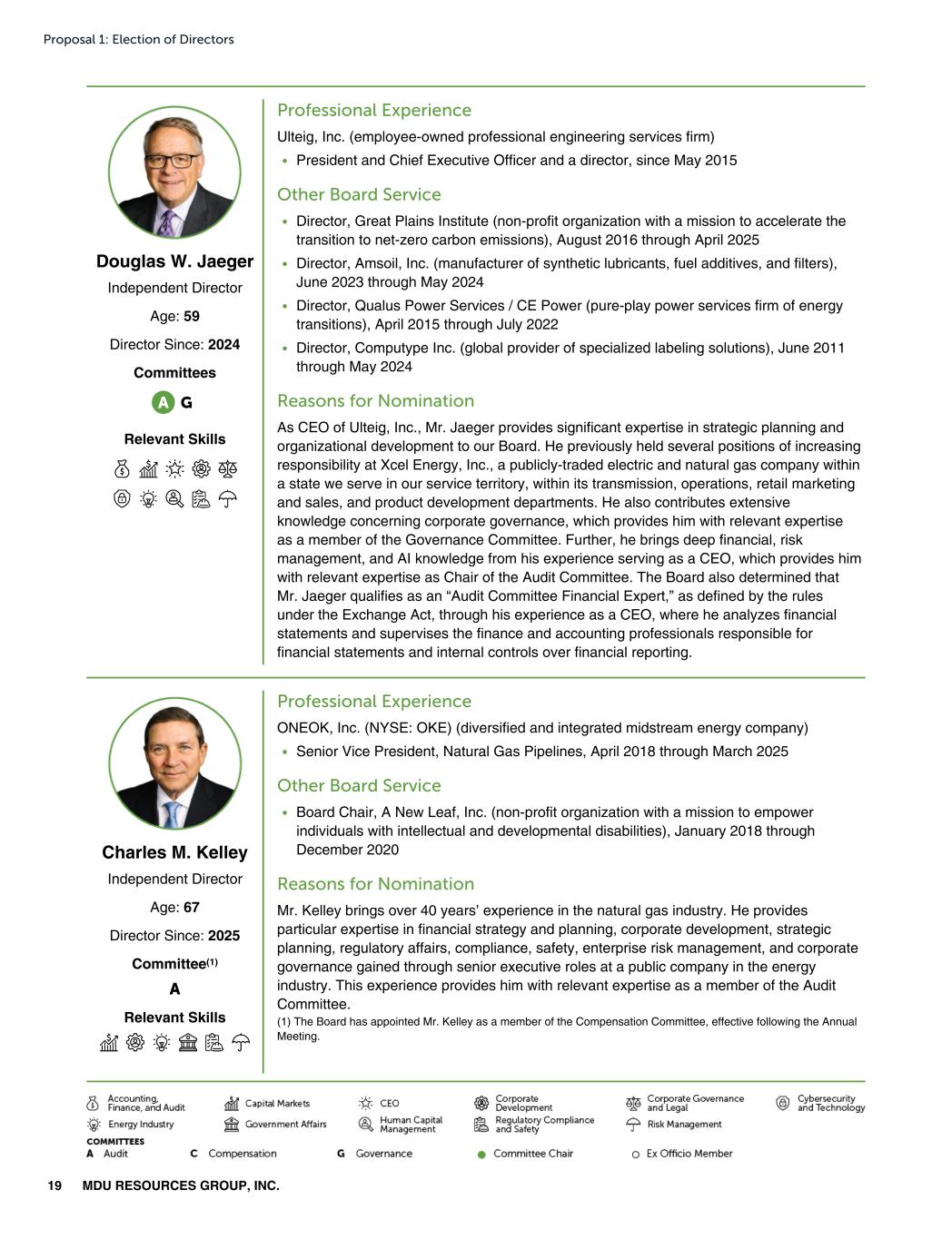 Douglas W. Jaeger Independent Director Age: 59 Director Since: 2024 Committees Relevant Skills Professional Experience Ulteig, Inc. (employee-owned professional engineering services firm) • President and Chief Executive Officer and a director, since May 2015 Other Board Service • Director, Great Plains Institute (non-profit organization with a mission to accelerate the transition to net-zero carbon emissions), August 2016 through April 2025 • Director, Amsoil, Inc. (manufacturer of synthetic lubricants, fuel additives, and filters), June 2023 through May 2024 • Director, Qualus Power Services / CE Power (pure-play power services firm of energy transitions), April 2015 through July 2022 • Director, Computype Inc. (global provider of specialized labeling solutions), June 2011 through May 2024 Reasons for Nomination As CEO of Ulteig, Inc., Mr. Jaeger provides significant expertise in strategic planning and organizational development to our Board. He previously held several positions of increasing responsibility at Xcel Energy, Inc., a publicly-traded electric and natural gas company within a state we serve in our service territory, within its transmission, operations, retail marketing and sales, and product development departments. He also contributes extensive knowledge concerning corporate governance, which provides him with relevant expertise as a member of the Governance Committee. Further, he brings deep financial, risk management, and AI knowledge from his experience serving as a CEO, which provides him with relevant expertise as Chair of the Audit Committee. The Board also determined that Mr. Jaeger qualifies as an “Audit Committee Financial Expert,” as defined by the rules under the Exchange Act, through his experience as a CEO, where he analyzes financial statements and supervises the finance and accounting professionals responsible for financial statements and internal controls over financial reporting. Charles M. Kelley Independent Director Age: 67 Director Since: 2025 Committee(1) Relevant Skills Professional Experience ONEOK, Inc. (NYSE: OKE) (diversified and integrated midstream energy company) • Senior Vice President, Natural Gas Pipelines, April 2018 through March 2025 Other Board Service • Board Chair, A New Leaf, Inc. (non-profit organization with a mission to empower individuals with intellectual and developmental disabilities), January 2018 through December 2020 Reasons for Nomination Mr. Kelley brings over 40 years’ experience in the natural gas industry. He provides particular expertise in financial strategy and planning, corporate development, strategic planning, regulatory affairs, compliance, safety, enterprise risk management, and corporate governance gained through senior executive roles at a public company in the energy industry. This experience provides him with relevant expertise as a member of the Audit Committee. (1) The Board has appointed Mr. Kelley as a member of the Compensation Committee, effective following the Annual Meeting. Proposal 1: Election of Directors 19 MDU RESOURCES GROUP, INC.