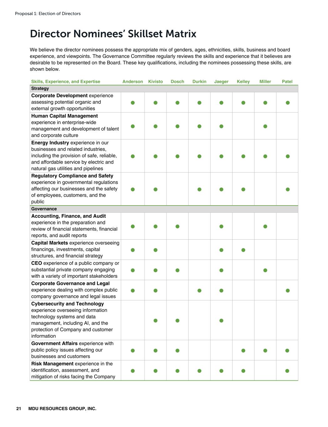 Director Nominees’ Skillset Matrix We believe the director nominees possess the appropriate mix of genders, ages, ethnicities, skills, business and board experience, and viewpoints. The Governance Committee regularly reviews the skills and experience that it believes are desirable to be represented on the Board. These key qualifications, including the nominees possessing these skills, are shown below. Strategy Corporate Development experience assessing potential organic and external growth opportunities l l l l l l l l Human Capital Management experience in enterprise-wide management and development of talent and corporate culture l l l l l l Energy Industry experience in our businesses and related industries, including the provision of safe, reliable, and affordable service by electric and natural gas utilities and pipelines l l l l l l l l Regulatory Compliance and Safety experience in governmental regulations affecting our businesses and the safety of employees, customers, and the public l l l l l l Governance Accounting, Finance, and Audit experience in the preparation and review of financial statements, financial reports, and audit reports l l l l l Capital Markets experience overseeing financings, investments, capital structures, and financial strategy l l l l CEO experience of a public company or substantial private company engaging with a variety of important stakeholders l l l l l Corporate Governance and Legal experience dealing with complex public company governance and legal issues l l l l l Cybersecurity and Technology experience overseeing information technology systems and data management, including AI, and the protection of Company and customer information l l l Government Affairs experience with public policy issues affecting our businesses and customers l l l l l l Risk Management experience in the identification, assessment, and mitigation of risks facing the Company l l l l l l l Skills, Experience, and Expertise Anderson Kivisto Dosch Durkin Jaeger Kelley Miller Patel Proposal 1: Election of Directors 21 MDU RESOURCES GROUP, INC.