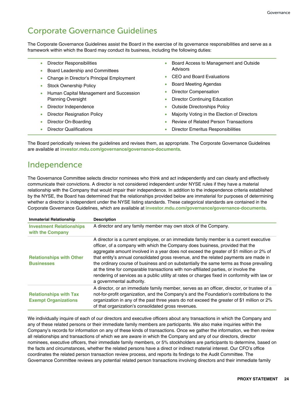 Corporate Governance Guidelines The Corporate Governance Guidelines assist the Board in the exercise of its governance responsibilities and serve as a framework within which the Board may conduct its business, including the following duties: • Director Responsibilities • Board Leadership and Committees • Change in Director’s Principal Employment • Stock Ownership Policy • Human Capital Management and Succession Planning Oversight • Director Independence • Director Resignation Policy • Director On-Boarding • Director Qualifications • Board Access to Management and Outside Advisors • CEO and Board Evaluations • Board Meeting Agendas • Director Compensation • Director Continuing Education • Outside Directorships Policy • Majority Voting in the Election of Directors • Review of Related Person Transactions • Director Emeritus Responsibilities The Board periodically reviews the guidelines and revises them, as appropriate. The Corporate Governance Guidelines are available at investor.mdu.com/governance/governance-documents. Independence The Governance Committee selects director nominees who think and act independently and can clearly and effectively communicate their convictions. A director is not considered independent under NYSE rules if they have a material relationship with the Company that would impair their independence. In addition to the independence criteria established by the NYSE, the Board has determined that the relationships provided below are immaterial for purposes of determining whether a director is independent under the NYSE listing standards. These categorical standards are contained in the Corporate Governance Guidelines, which are available at investor.mdu.com/governance/governance-documents. Immaterial Relationship Description Investment Relationships with the Company A director and any family member may own stock of the Company. Relationships with Other Businesses A director is a current employee, or an immediate family member is a current executive officer, of a company with which the Company does business, provided that the aggregate amount involved in a year does not exceed the greater of $1 million or 2% of that entity’s annual consolidated gross revenue, and the related payments are made in the ordinary course of business and on substantially the same terms as those prevailing at the time for comparable transactions with non-affiliated parties, or involve the rendering of services as a public utility at rates or charges fixed in conformity with law or a governmental authority. Relationships with Tax Exempt Organizations A director, or an immediate family member, serves as an officer, director, or trustee of a not-for-profit organization, and the Company’s and the Foundation’s contributions to the organization in any of the past three years do not exceed the greater of $1 million or 2% of that organization’s consolidated gross revenues. We individually inquire of each of our directors and executive officers about any transactions in which the Company and any of these related persons or their immediate family members are participants. We also make inquiries within the Company’s records for information on any of these kinds of transactions. Once we gather the information, we then review all relationships and transactions of which we are aware in which the Company and any of our directors, director nominees, executive officers, their immediate family members, or 5% stockholders are participants to determine, based on the facts and circumstances, whether the related persons have a direct or indirect material interest. Our CFO’s office coordinates the related person transaction review process, and reports its findings to the Audit Committee. The Governance Committee reviews any potential related person transactions involving directors and their immediate family Governance PROXY STATEMENT 24