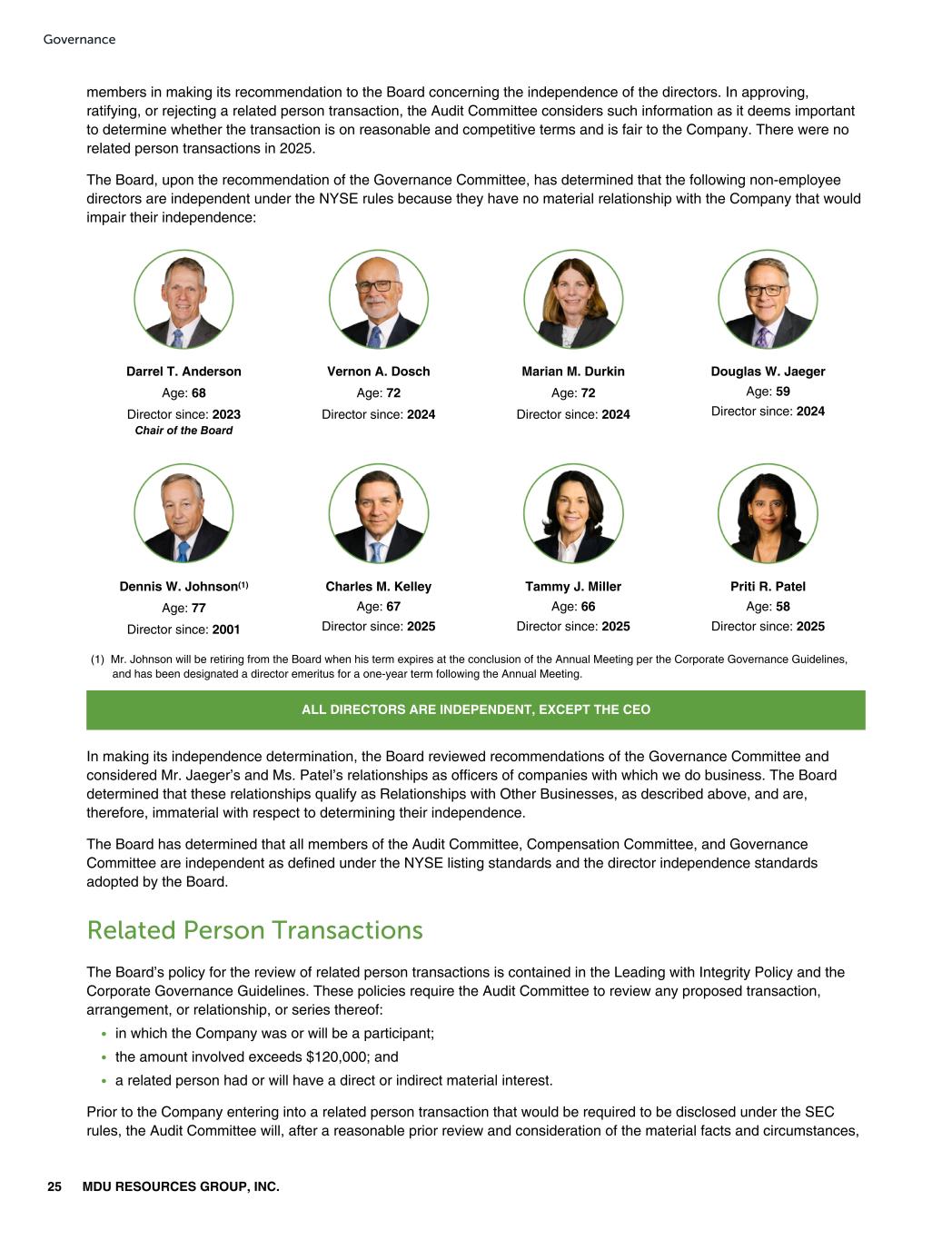 members in making its recommendation to the Board concerning the independence of the directors. In approving, ratifying, or rejecting a related person transaction, the Audit Committee considers such information as it deems important to determine whether the transaction is on reasonable and competitive terms and is fair to the Company. There were no related person transactions in 2025. The Board, upon the recommendation of the Governance Committee, has determined that the following non-employee directors are independent under the NYSE rules because they have no material relationship with the Company that would impair their independence: Darrel T. Anderson Age: 68 Director since: 2023 Chair of the Board Vernon A. Dosch Age: 72 Director since: 2024 Marian M. Durkin Age: 72 Director since: 2024 Douglas W. Jaeger Age: 59 Director since: 2024 Dennis W. Johnson(1) Age: 77 Director since: 2001 Charles M. Kelley Age: 67 Director since: 2025 Tammy J. Miller Age: 66 Director since: 2025 Priti R. Patel Age: 58 Director since: 2025 (1) Mr. Johnson will be retiring from the Board when his term expires at the conclusion of the Annual Meeting per the Corporate Governance Guidelines, and has been designated a director emeritus for a one-year term following the Annual Meeting. ALL DIRECTORS ARE INDEPENDENT, EXCEPT THE CEO In making its independence determination, the Board reviewed recommendations of the Governance Committee and considered Mr. Jaeger’s and Ms. Patel’s relationships as officers of companies with which we do business. The Board determined that these relationships qualify as Relationships with Other Businesses, as described above, and are, therefore, immaterial with respect to determining their independence. The Board has determined that all members of the Audit Committee, Compensation Committee, and Governance Committee are independent as defined under the NYSE listing standards and the director independence standards adopted by the Board. Related Person Transactions The Board’s policy for the review of related person transactions is contained in the Leading with Integrity Policy and the Corporate Governance Guidelines. These policies require the Audit Committee to review any proposed transaction, arrangement, or relationship, or series thereof: • in which the Company was or will be a participant; • the amount involved exceeds $120,000; and • a related person had or will have a direct or indirect material interest. Prior to the Company entering into a related person transaction that would be required to be disclosed under the SEC rules, the Audit Committee will, after a reasonable prior review and consideration of the material facts and circumstances, Governance 25 MDU RESOURCES GROUP, INC.