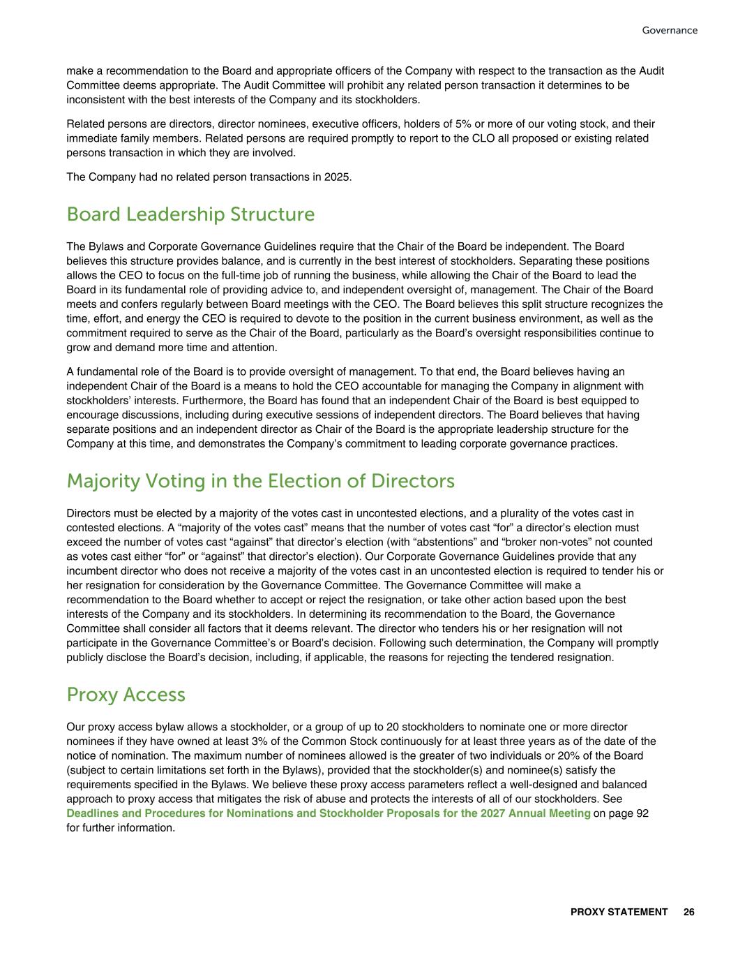 make a recommendation to the Board and appropriate officers of the Company with respect to the transaction as the Audit Committee deems appropriate. The Audit Committee will prohibit any related person transaction it determines to be inconsistent with the best interests of the Company and its stockholders. Related persons are directors, director nominees, executive officers, holders of 5% or more of our voting stock, and their immediate family members. Related persons are required promptly to report to the CLO all proposed or existing related persons transaction in which they are involved. The Company had no related person transactions in 2025. Board Leadership Structure The Bylaws and Corporate Governance Guidelines require that the Chair of the Board be independent. The Board believes this structure provides balance, and is currently in the best interest of stockholders. Separating these positions allows the CEO to focus on the full-time job of running the business, while allowing the Chair of the Board to lead the Board in its fundamental role of providing advice to, and independent oversight of, management. The Chair of the Board meets and confers regularly between Board meetings with the CEO. The Board believes this split structure recognizes the time, effort, and energy the CEO is required to devote to the position in the current business environment, as well as the commitment required to serve as the Chair of the Board, particularly as the Board’s oversight responsibilities continue to grow and demand more time and attention. A fundamental role of the Board is to provide oversight of management. To that end, the Board believes having an independent Chair of the Board is a means to hold the CEO accountable for managing the Company in alignment with stockholders’ interests. Furthermore, the Board has found that an independent Chair of the Board is best equipped to encourage discussions, including during executive sessions of independent directors. The Board believes that having separate positions and an independent director as Chair of the Board is the appropriate leadership structure for the Company at this time, and demonstrates the Company’s commitment to leading corporate governance practices. Majority Voting in the Election of Directors Directors must be elected by a majority of the votes cast in uncontested elections, and a plurality of the votes cast in contested elections. A “majority of the votes cast” means that the number of votes cast “for” a director’s election must exceed the number of votes cast “against” that director’s election (with “abstentions” and “broker non-votes” not counted as votes cast either “for” or “against” that director’s election). Our Corporate Governance Guidelines provide that any incumbent director who does not receive a majority of the votes cast in an uncontested election is required to tender his or her resignation for consideration by the Governance Committee. The Governance Committee will make a recommendation to the Board whether to accept or reject the resignation, or take other action based upon the best interests of the Company and its stockholders. In determining its recommendation to the Board, the Governance Committee shall consider all factors that it deems relevant. The director who tenders his or her resignation will not participate in the Governance Committee’s or Board’s decision. Following such determination, the Company will promptly publicly disclose the Board’s decision, including, if applicable, the reasons for rejecting the tendered resignation. Proxy Access Our proxy access bylaw allows a stockholder, or a group of up to 20 stockholders to nominate one or more director nominees if they have owned at least 3% of the Common Stock continuously for at least three years as of the date of the notice of nomination. The maximum number of nominees allowed is the greater of two individuals or 20% of the Board (subject to certain limitations set forth in the Bylaws), provided that the stockholder(s) and nominee(s) satisfy the requirements specified in the Bylaws. We believe these proxy access parameters reflect a well-designed and balanced approach to proxy access that mitigates the risk of abuse and protects the interests of all of our stockholders. See Deadlines and Procedures for Nominations and Stockholder Proposals for the 2027 Annual Meeting on page 92 for further information. Governance PROXY STATEMENT 26