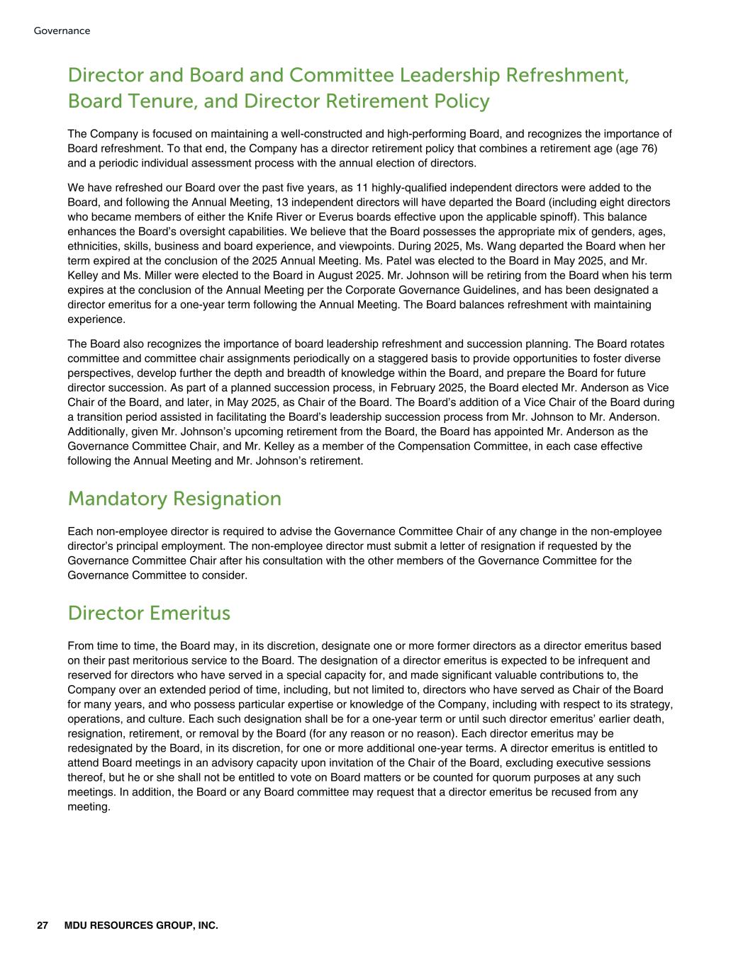 Director and Board and Committee Leadership Refreshment, Board Tenure, and Director Retirement Policy The Company is focused on maintaining a well-constructed and high-performing Board, and recognizes the importance of Board refreshment. To that end, the Company has a director retirement policy that combines a retirement age (age 76) and a periodic individual assessment process with the annual election of directors. We have refreshed our Board over the past five years, as 11 highly-qualified independent directors were added to the Board, and following the Annual Meeting, 13 independent directors will have departed the Board (including eight directors who became members of either the Knife River or Everus boards effective upon the applicable spinoff). This balance enhances the Board’s oversight capabilities. We believe that the Board possesses the appropriate mix of genders, ages, ethnicities, skills, business and board experience, and viewpoints. During 2025, Ms. Wang departed the Board when her term expired at the conclusion of the 2025 Annual Meeting. Ms. Patel was elected to the Board in May 2025, and Mr. Kelley and Ms. Miller were elected to the Board in August 2025. Mr. Johnson will be retiring from the Board when his term expires at the conclusion of the Annual Meeting per the Corporate Governance Guidelines, and has been designated a director emeritus for a one-year term following the Annual Meeting. The Board balances refreshment with maintaining experience. The Board also recognizes the importance of board leadership refreshment and succession planning. The Board rotates committee and committee chair assignments periodically on a staggered basis to provide opportunities to foster diverse perspectives, develop further the depth and breadth of knowledge within the Board, and prepare the Board for future director succession. As part of a planned succession process, in February 2025, the Board elected Mr. Anderson as Vice Chair of the Board, and later, in May 2025, as Chair of the Board. The Board’s addition of a Vice Chair of the Board during a transition period assisted in facilitating the Board’s leadership succession process from Mr. Johnson to Mr. Anderson. Additionally, given Mr. Johnson’s upcoming retirement from the Board, the Board has appointed Mr. Anderson as the Governance Committee Chair, and Mr. Kelley as a member of the Compensation Committee, in each case effective following the Annual Meeting and Mr. Johnson’s retirement. Mandatory Resignation Each non-employee director is required to advise the Governance Committee Chair of any change in the non-employee director’s principal employment. The non-employee director must submit a letter of resignation if requested by the Governance Committee Chair after his consultation with the other members of the Governance Committee for the Governance Committee to consider. Director Emeritus From time to time, the Board may, in its discretion, designate one or more former directors as a director emeritus based on their past meritorious service to the Board. The designation of a director emeritus is expected to be infrequent and reserved for directors who have served in a special capacity for, and made significant valuable contributions to, the Company over an extended period of time, including, but not limited to, directors who have served as Chair of the Board for many years, and who possess particular expertise or knowledge of the Company, including with respect to its strategy, operations, and culture. Each such designation shall be for a one-year term or until such director emeritus’ earlier death, resignation, retirement, or removal by the Board (for any reason or no reason). Each director emeritus may be redesignated by the Board, in its discretion, for one or more additional one-year terms. A director emeritus is entitled to attend Board meetings in an advisory capacity upon invitation of the Chair of the Board, excluding executive sessions thereof, but he or she shall not be entitled to vote on Board matters or be counted for quorum purposes at any such meetings. In addition, the Board or any Board committee may request that a director emeritus be recused from any meeting. Governance 27 MDU RESOURCES GROUP, INC.